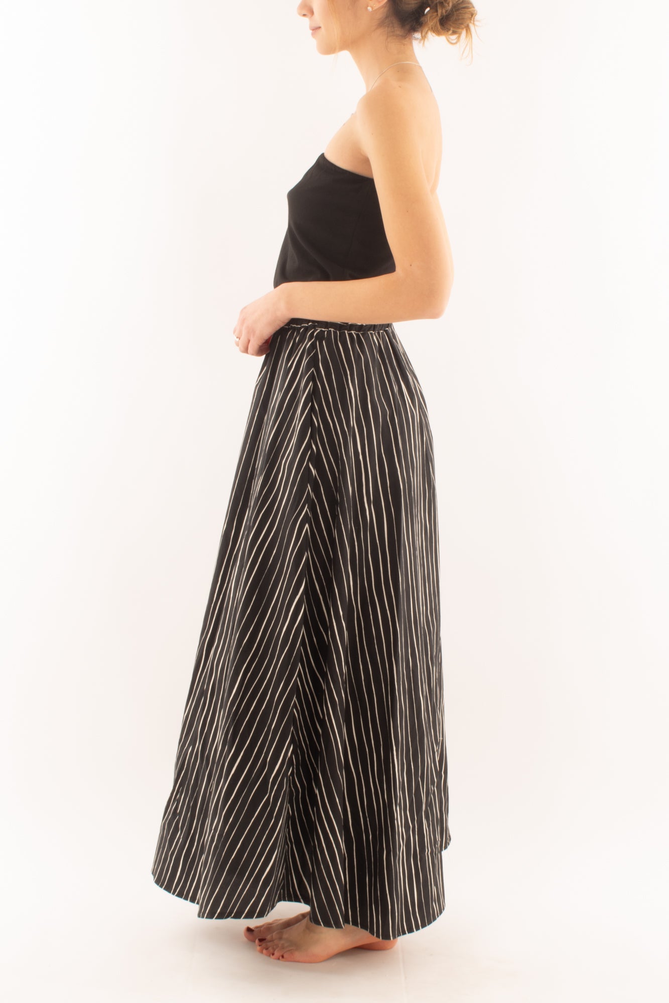 "Elevato abito a fascia con elegante gonna svasata a righe, accattivante laccetto rosso a contrasto. Stile sofisticato per un look unico e glamour. Acquista ora e lascia il tuo segno di stile!"