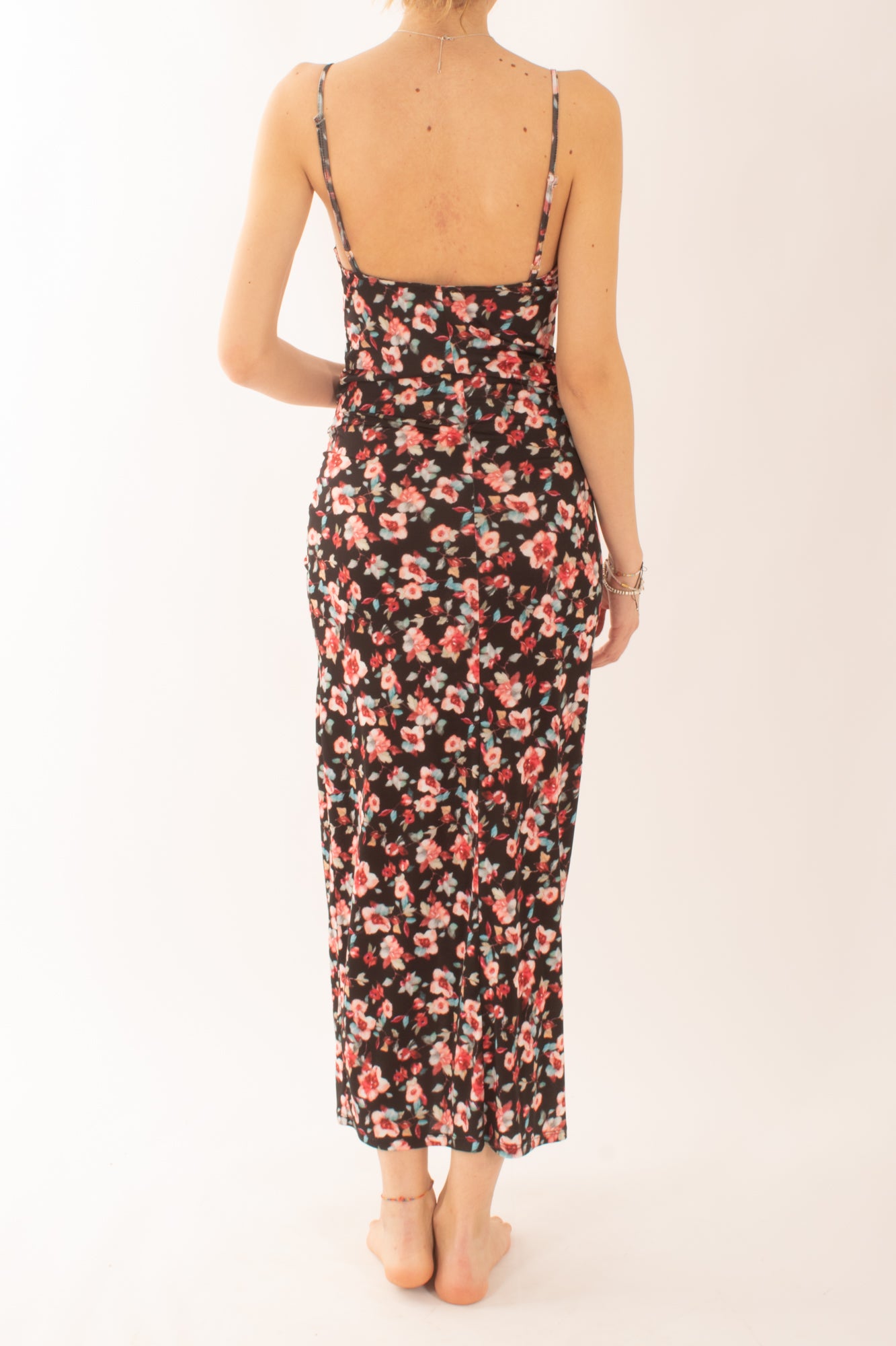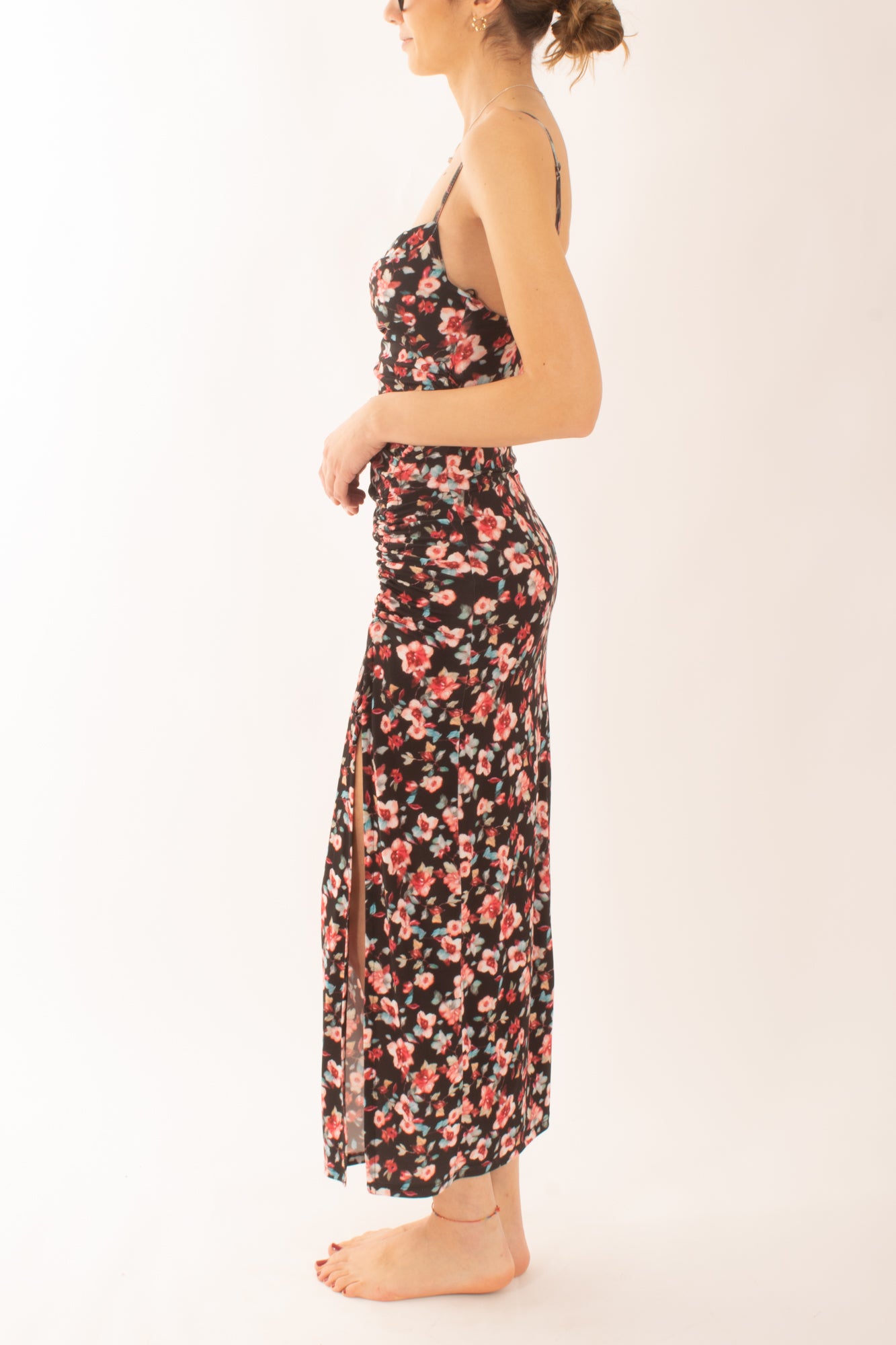 Scopri l'eleganza dell'abito aderente a fantasia con bretelline sottili e arricciatura laterale. Perfetto per esaltare la tua silhouette, questo capo unico combina stile e comfort, rendendolo ideale per ogni occasione speciale. Scegli il tuo look e distinguati con classe.