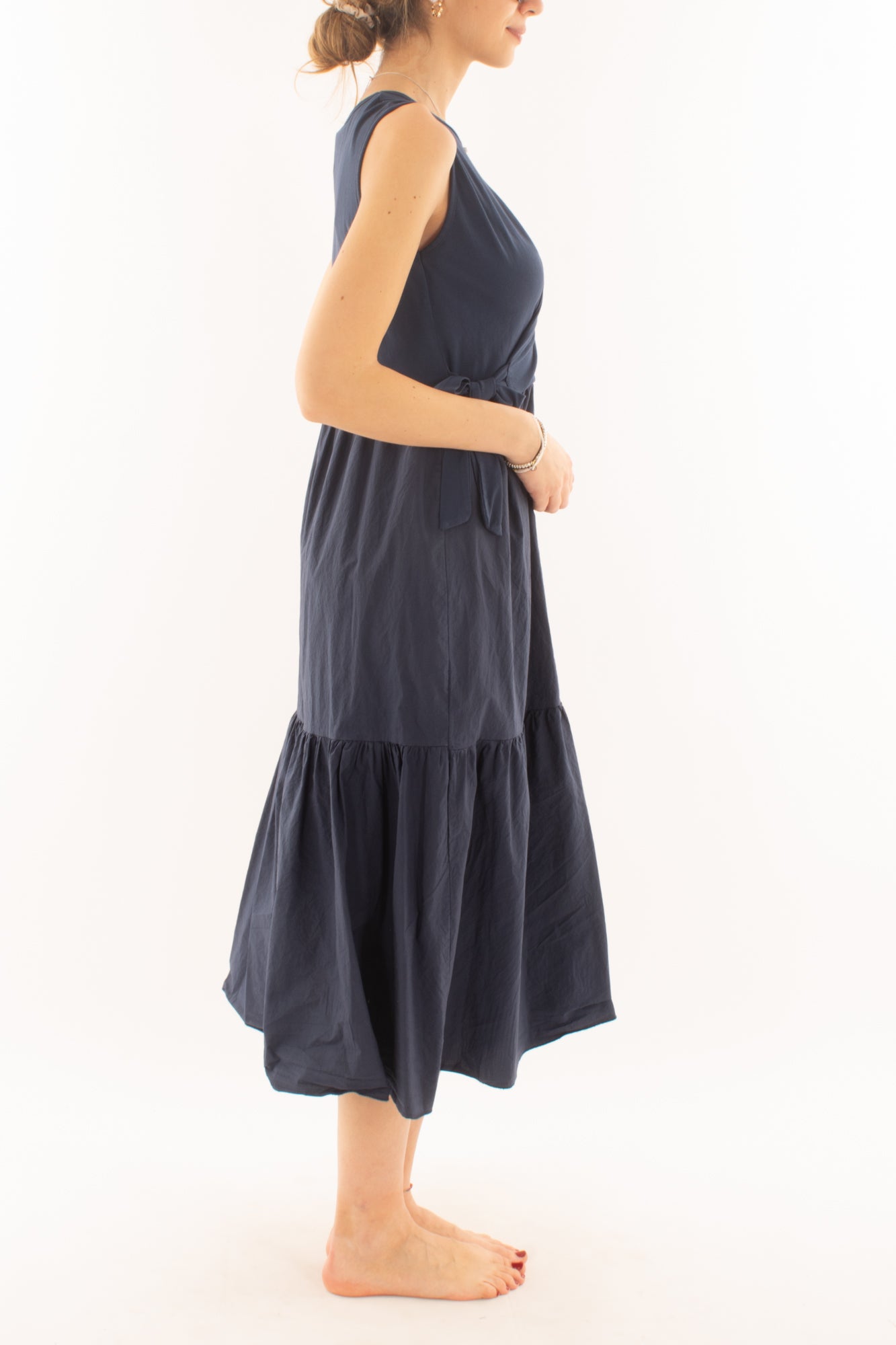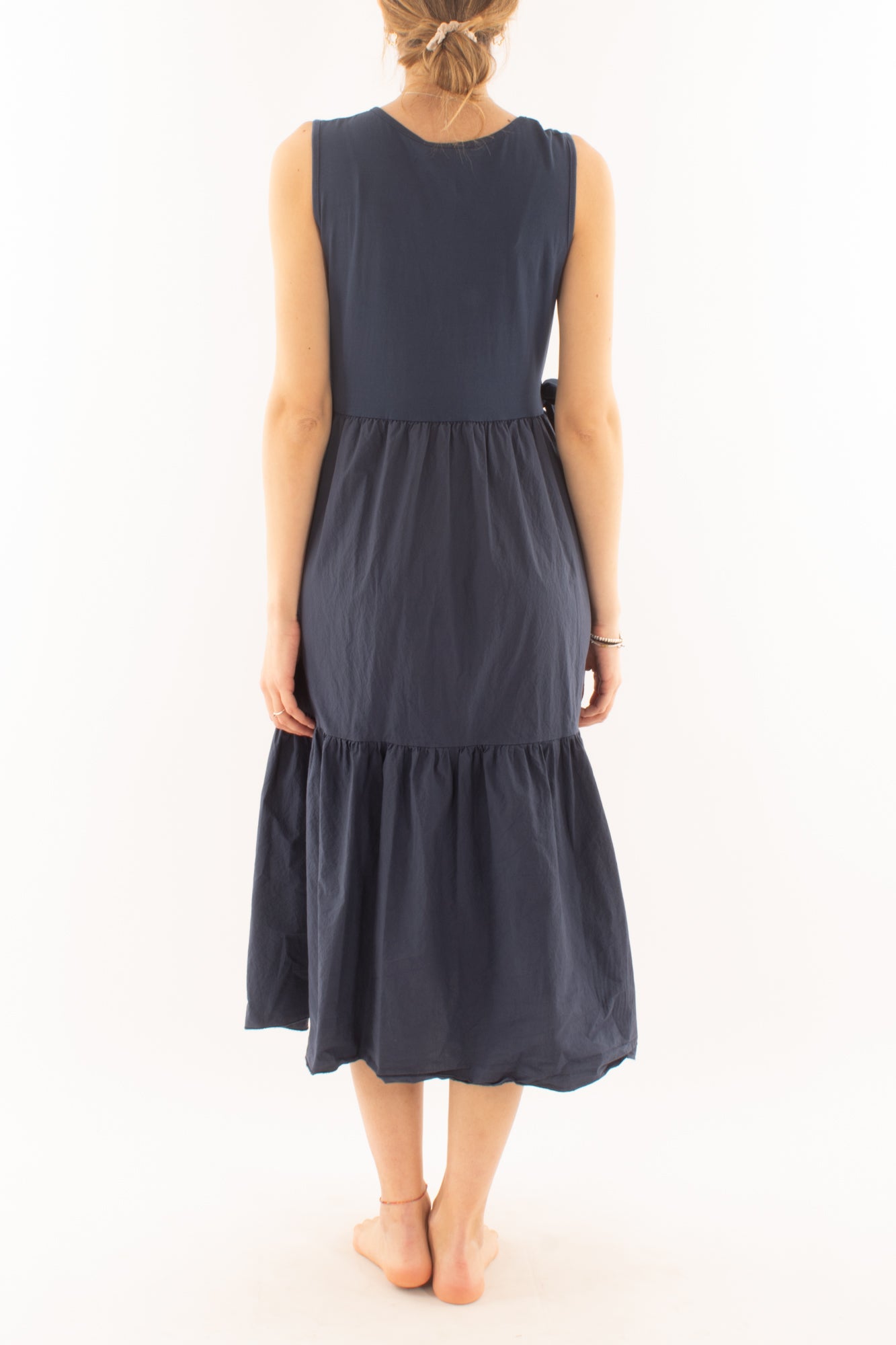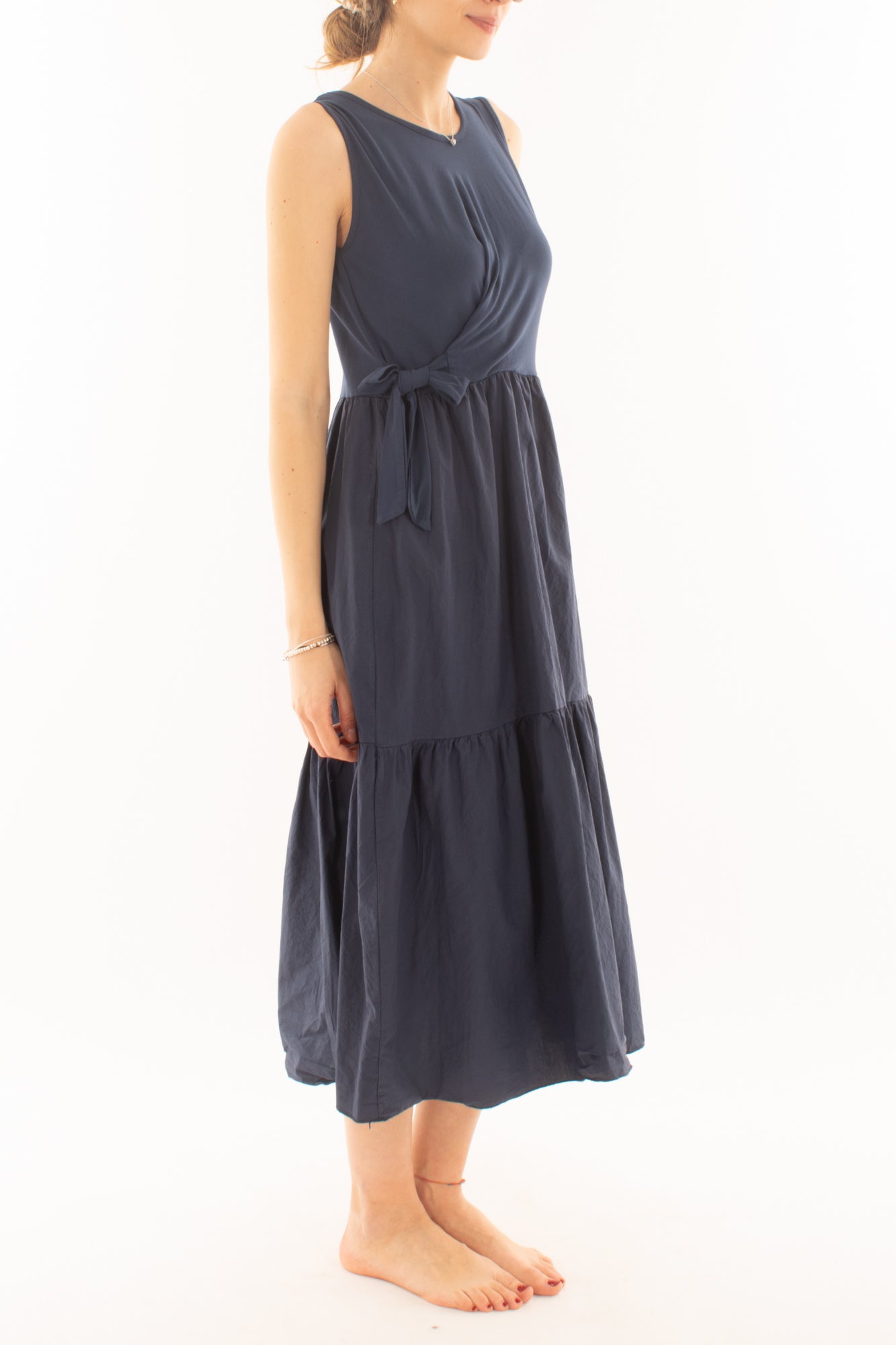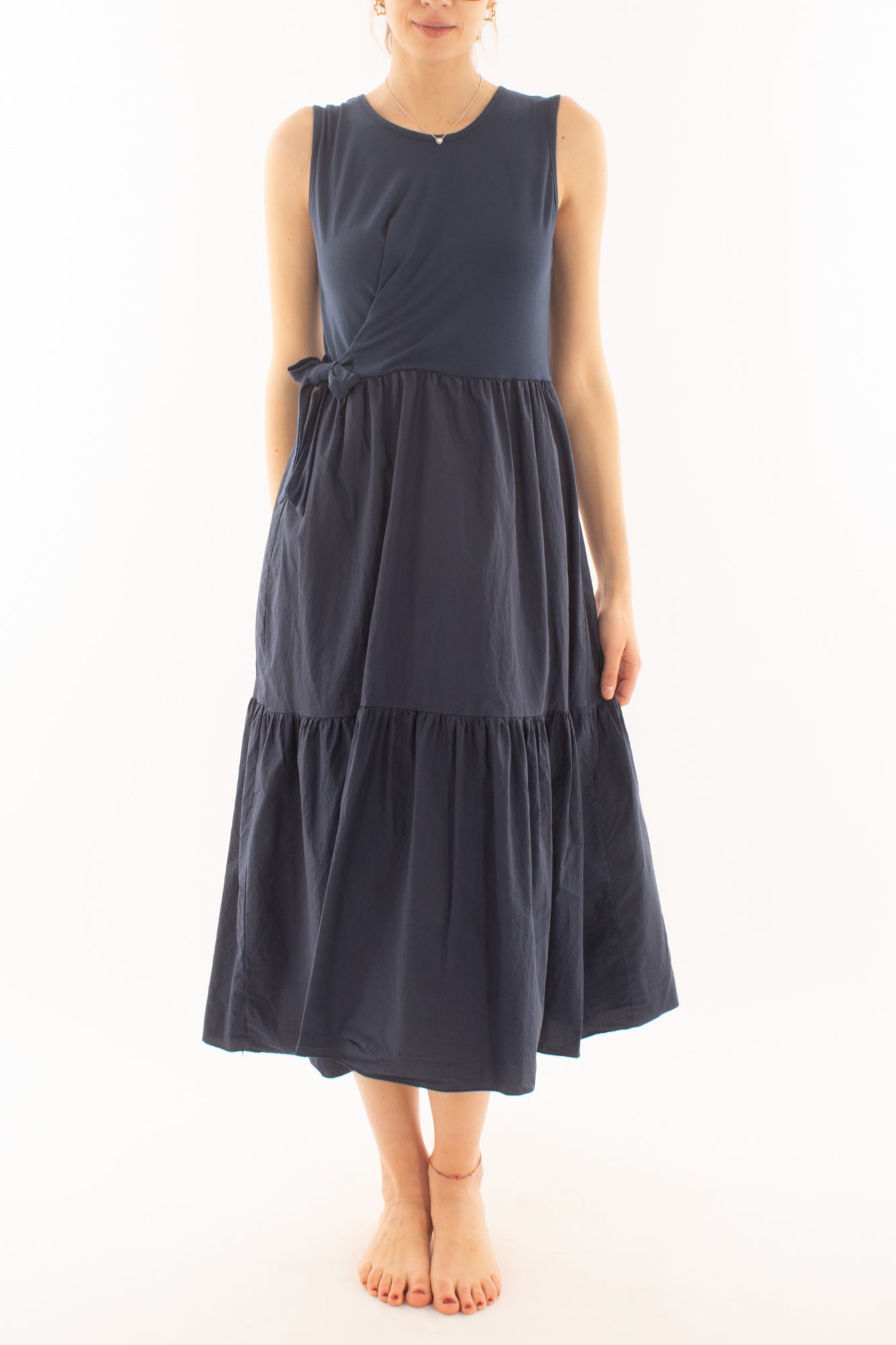 Scegli l'abito lungo girocollo smanicato per tutti i giorni. La parte superiore in maglina offre comfort, mentre la gonna a balze in cotone aggiunge un tocco di stile casual. Ideale per un look quotidiano che unisce praticità e moda.