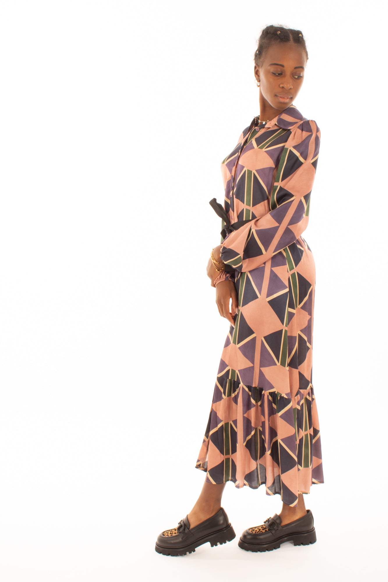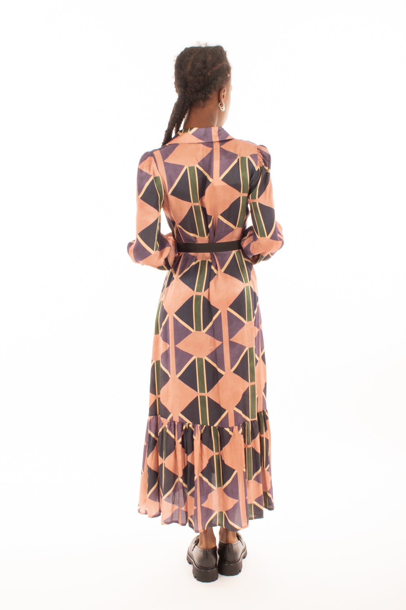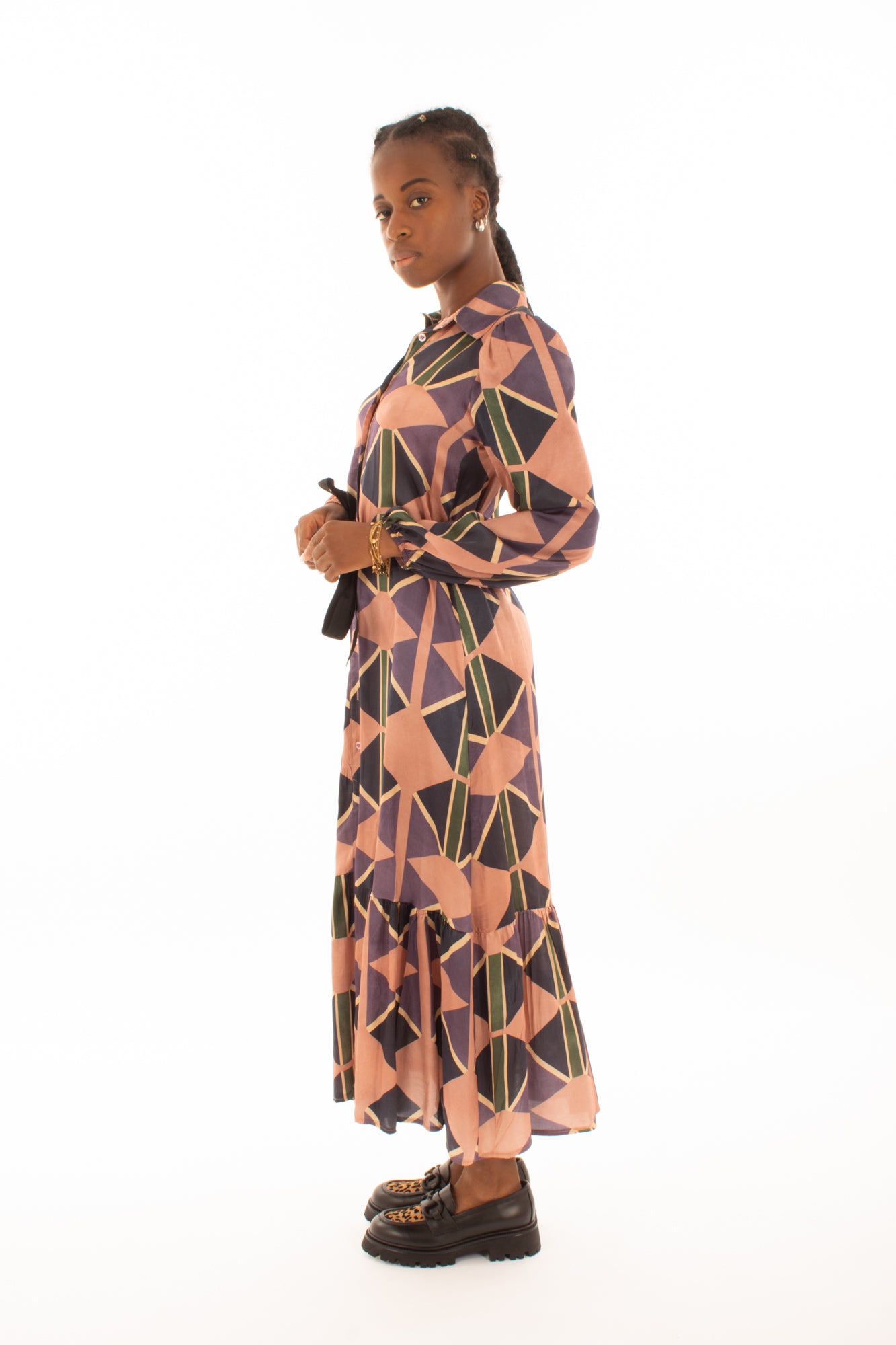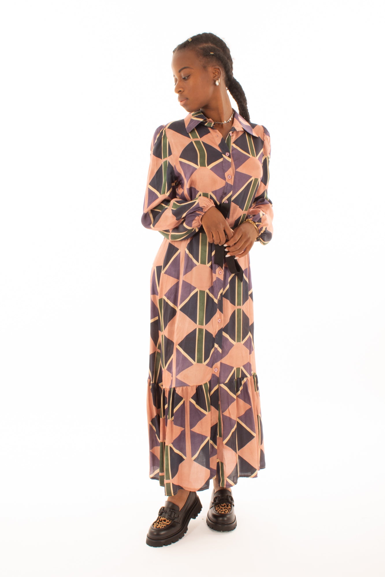 L'abito lungo a chemisier in viscosa di ultima tendenza offre eleganza e comfort. La stampa in fantasie geometriche è un design moderno e raffinato che pienamente esprime lo stile di chi lo indossa. La composizione in viscosa lo rende morbido e traspirante, ideale per tutte le occasioni.
