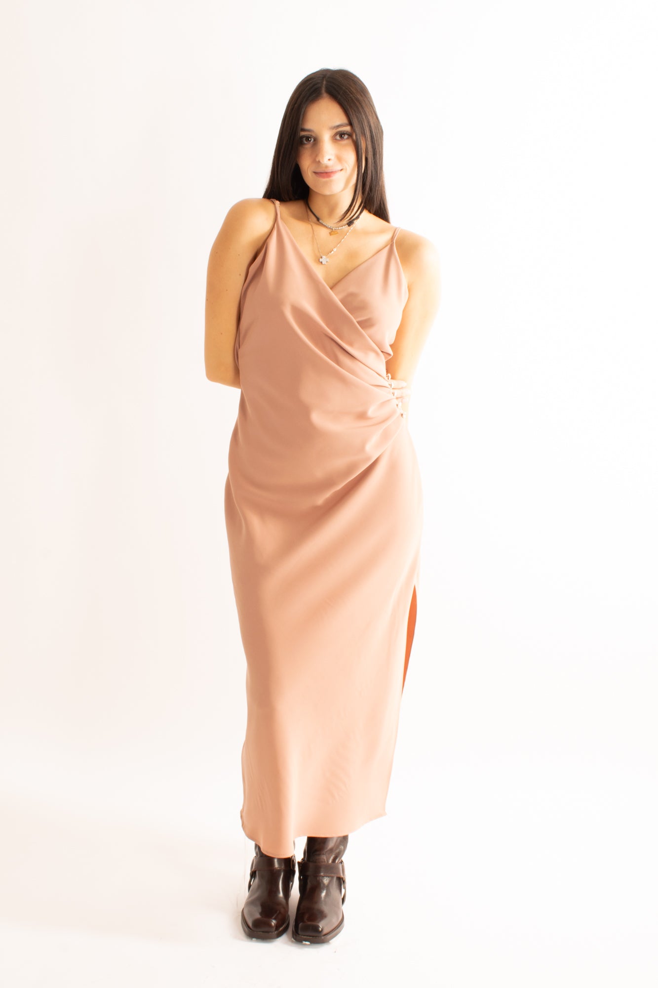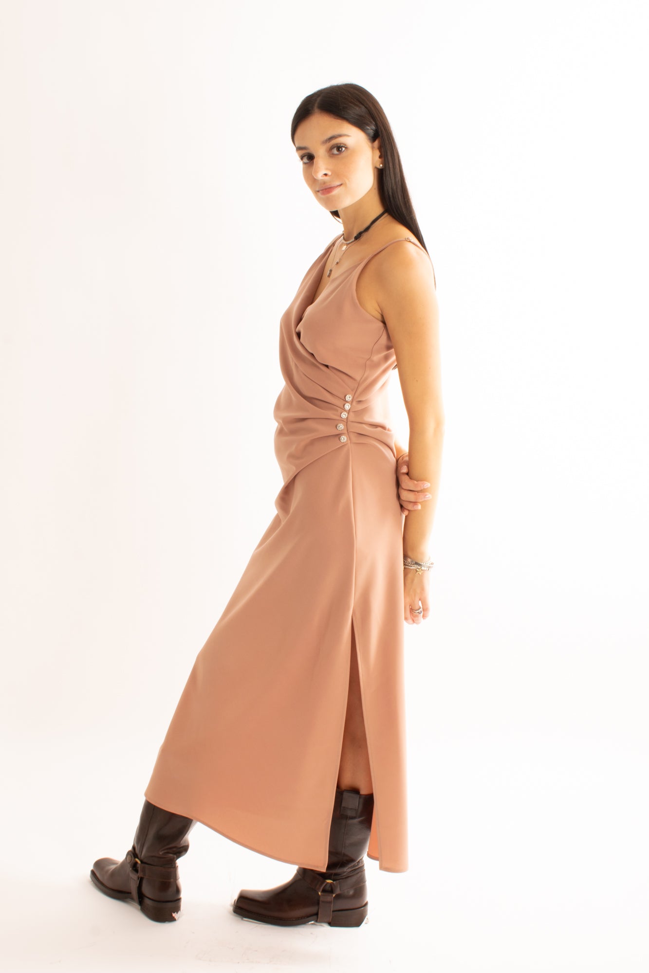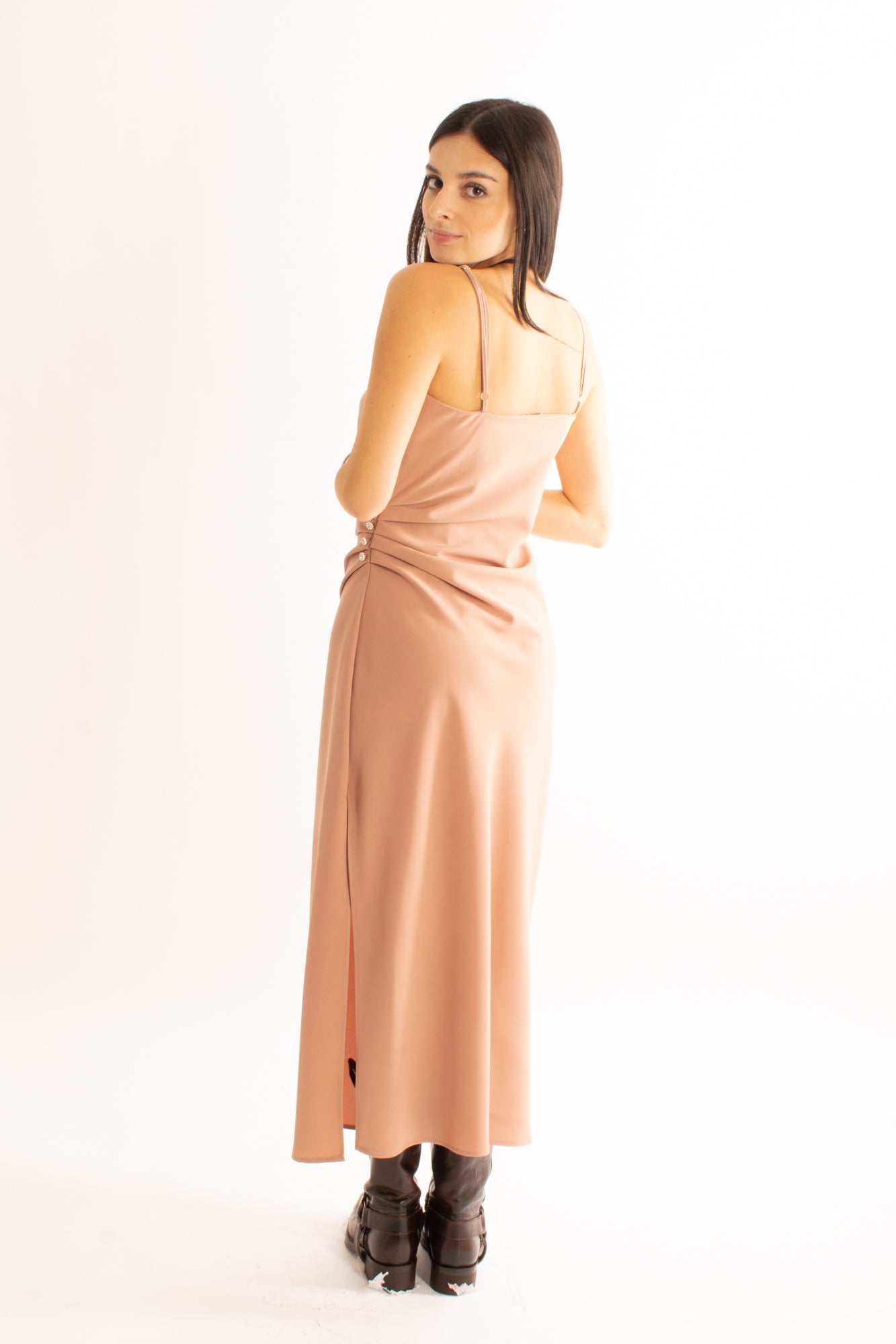 Questo abito è fatto di un tessuto di qualità superiore. La sua silhouette aderente è accentuata da una arricciatura di lato e da un bottone gioiello. La lunghezza è perfetta per un look sofisticato ed elegante.