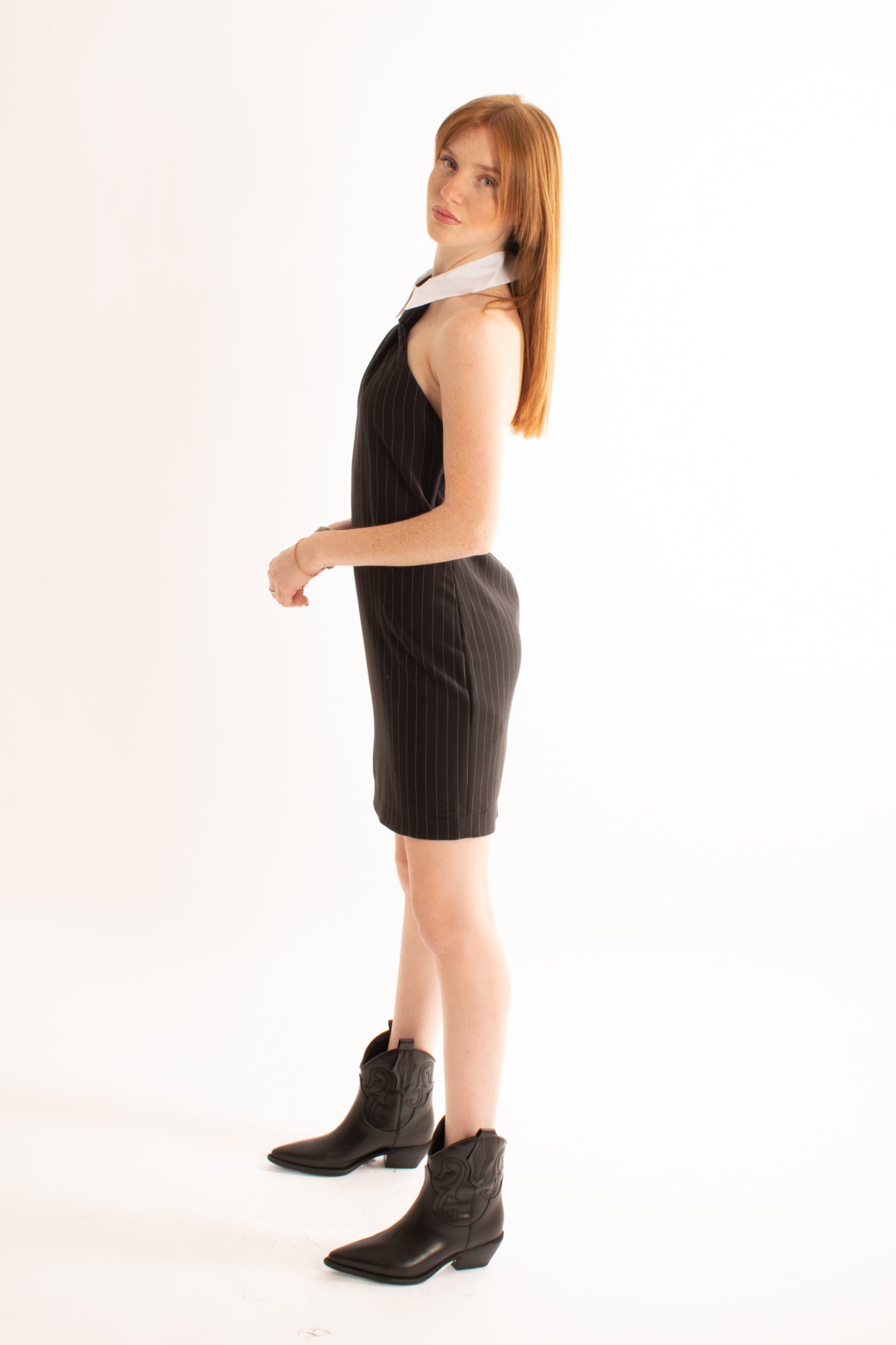 L'abito è realizzato con tubino di alta qualità, caratterizzato da un colletto e da un cravattino che gli conferiscono eleganza. La parte posteriore è scoperta per un look sbarazzino. Taglio aderente e chic, ideale per qualunque occasione.