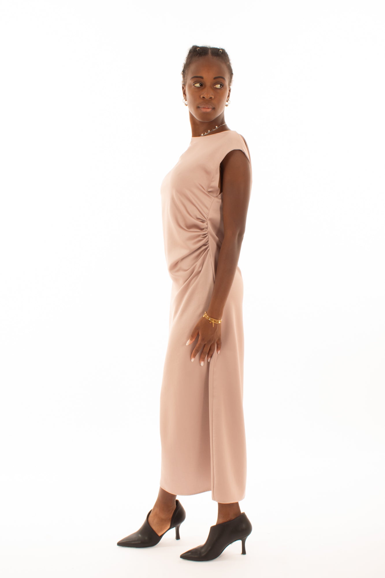 La sua silhouette lunga e senza maniche, arricchita dal drappeggio laterale, lo rende perfetto per qualsiasi occasione, garantendo un look elegante e raffinato. L'attenzione ai dettagli e la linea classica conferiscono a questo abito un valore aggiunto, trasformandolo in un capo unico e prezioso nel tuo guardaroba.