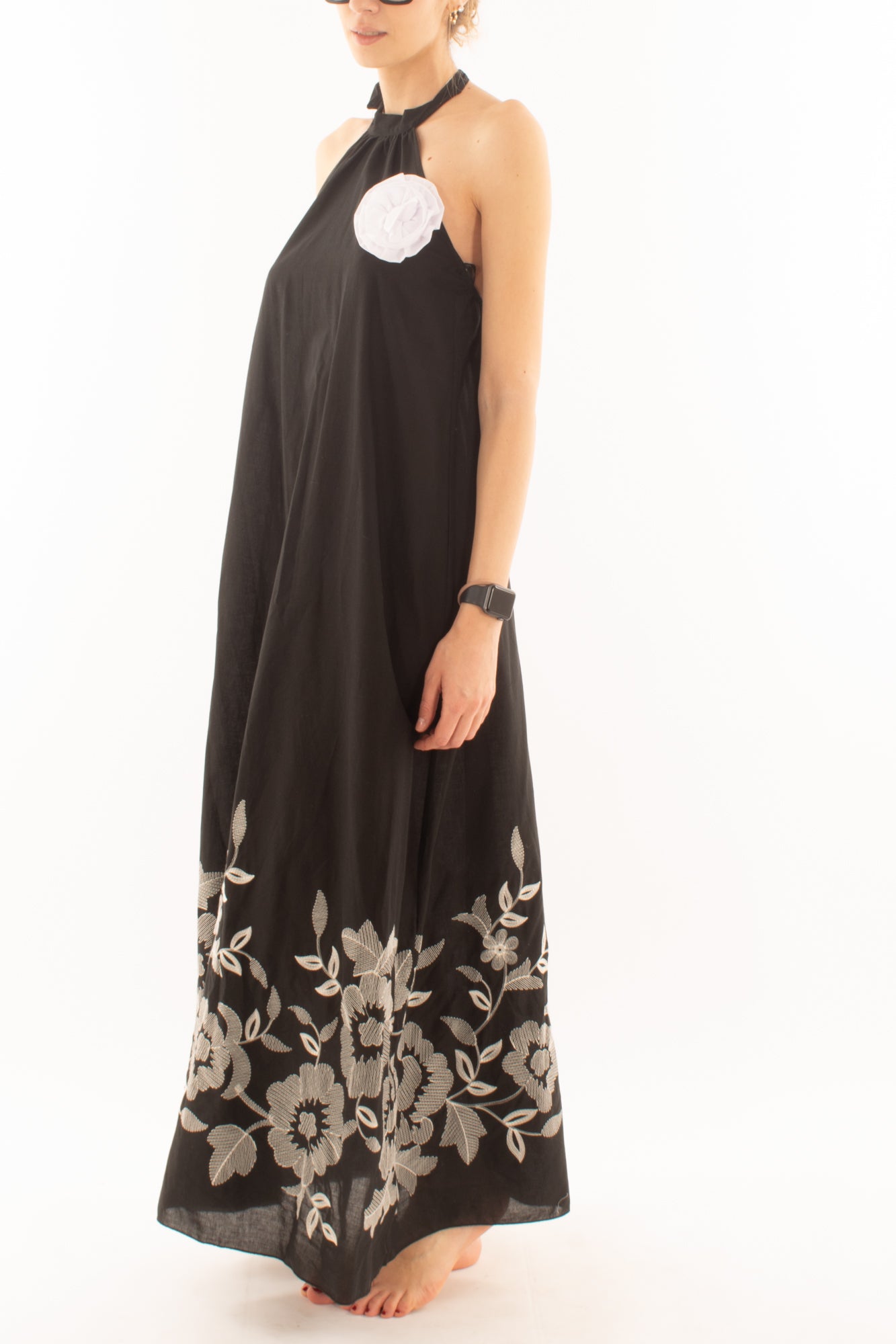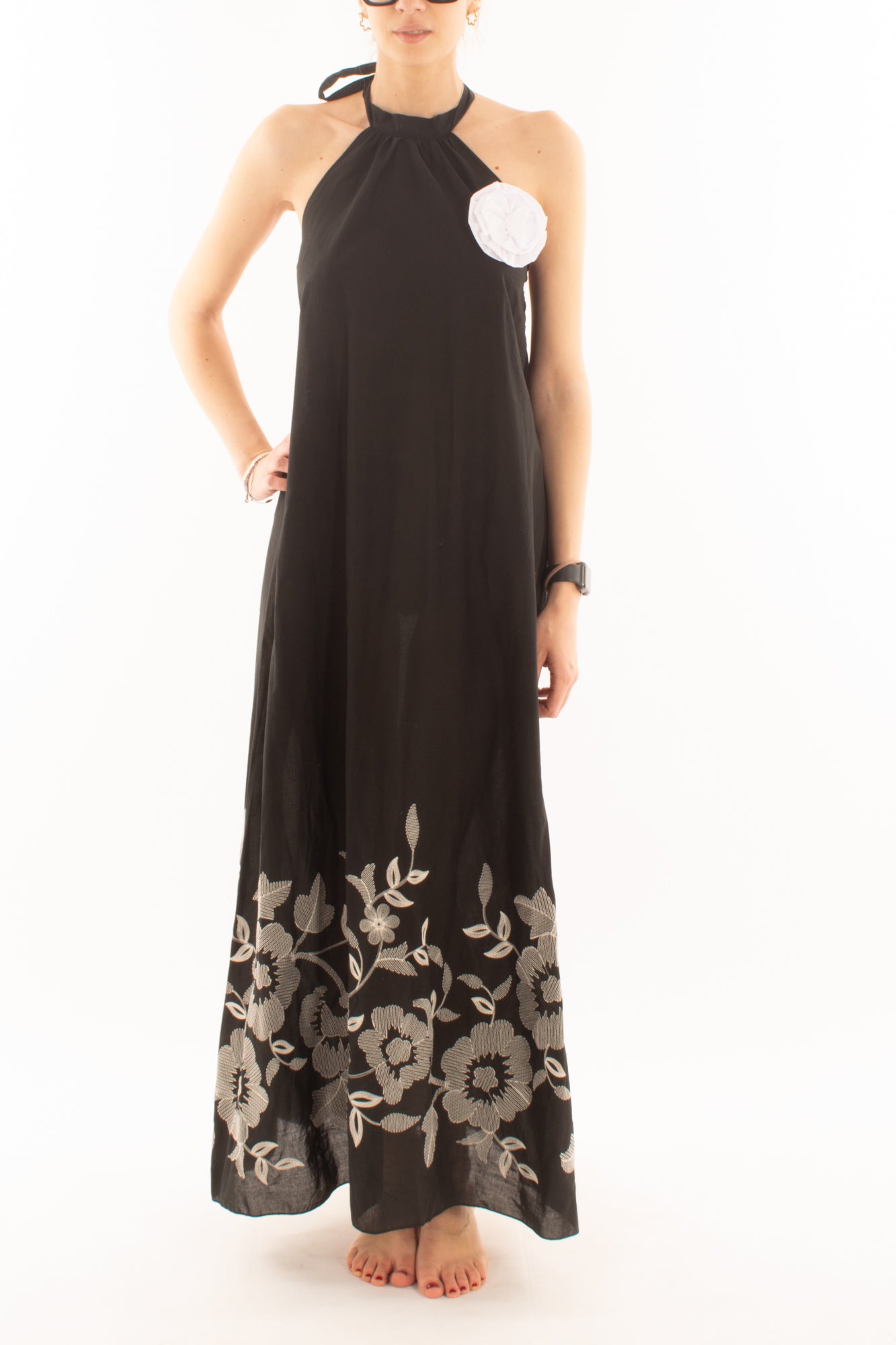 "Scopri l'eleganza senza tempo di questo abito lungo con spalle scoperte e ricami sul fondo. Perfetto per occasioni speciali, il suo design allacciato al collo aggiunge un tocco di raffinatezza. Esalta la tua bellezza con stile e comfort."