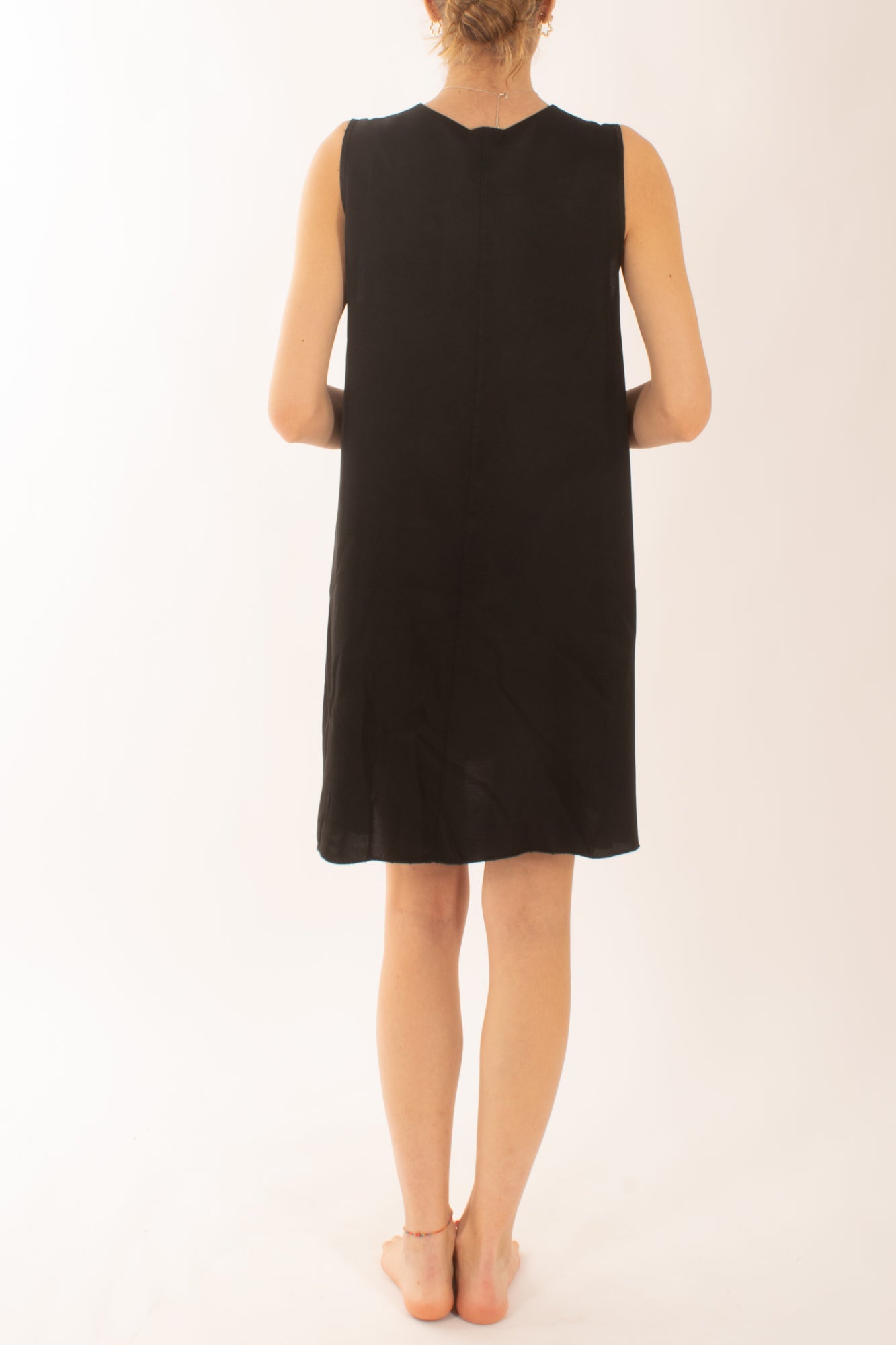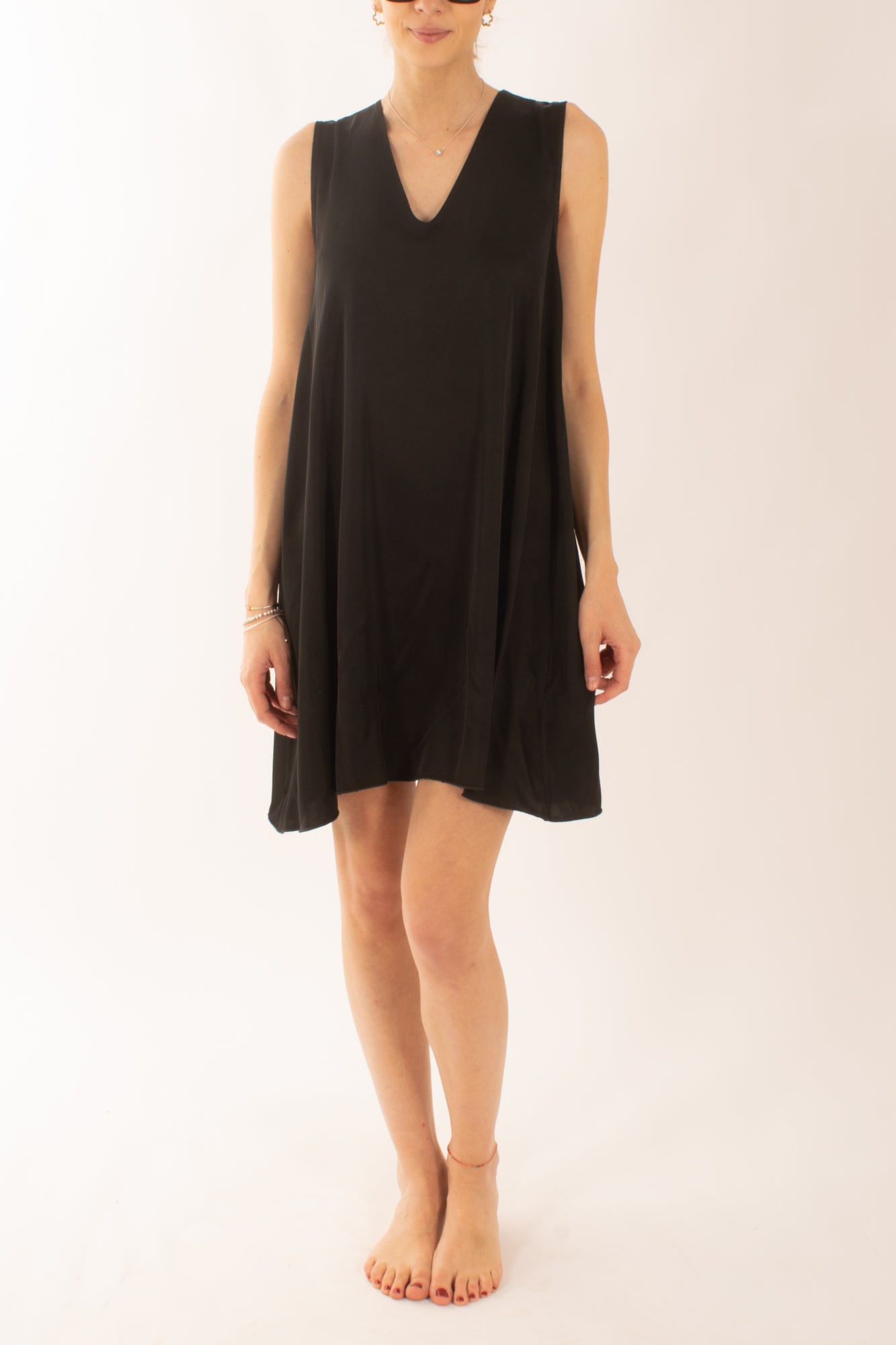 Abito smanicato a trapezio in viscosa, ideale per le giornate estive. Il tessuto leggero e traspirante garantisce comfort e freschezza. Linea semplice ed elegante, perfetta per ogni occasione, dallo stile casual a quello più sofisticato. Aggiungi un tocco di classe al tuo guardaroba.