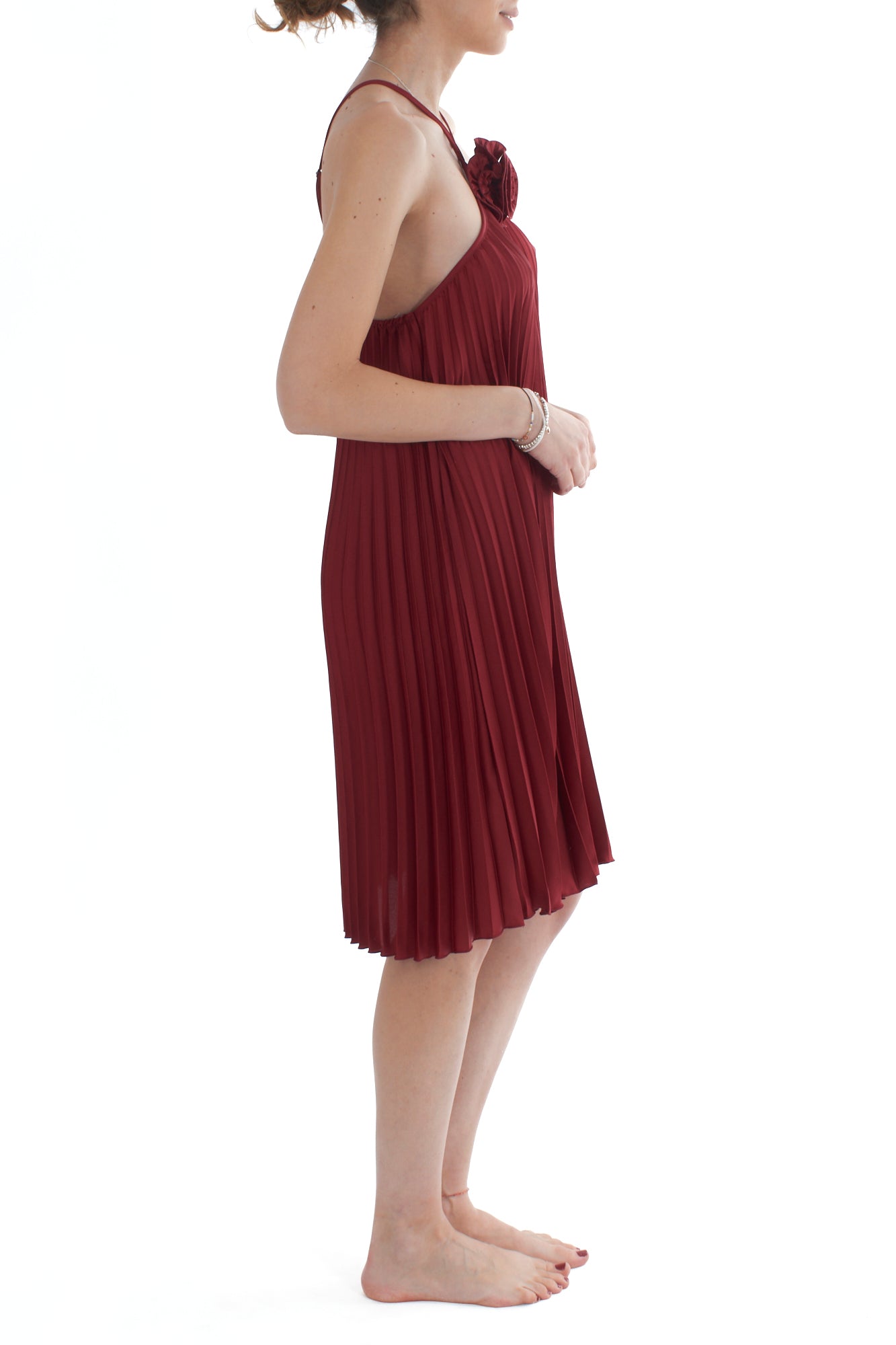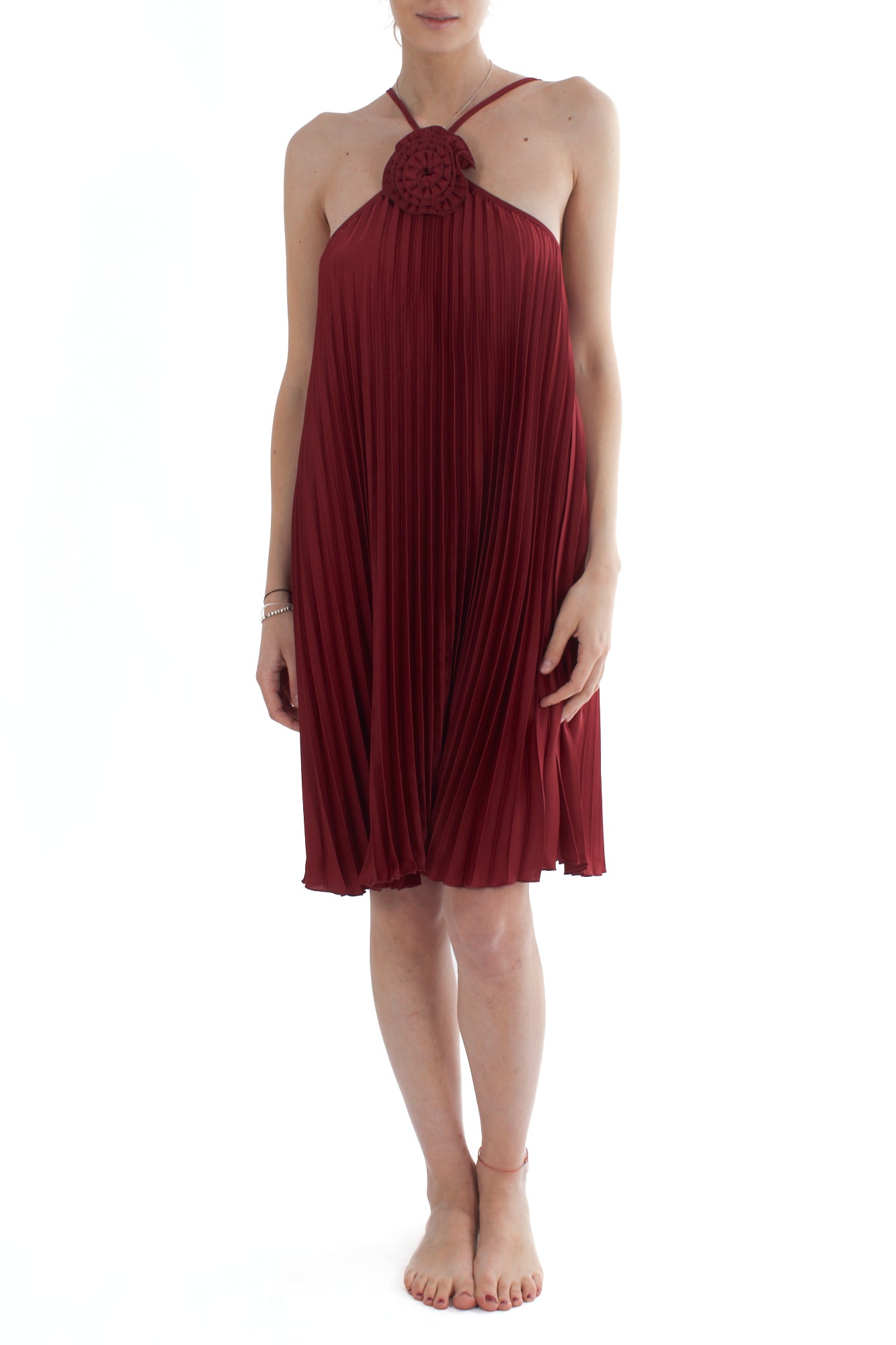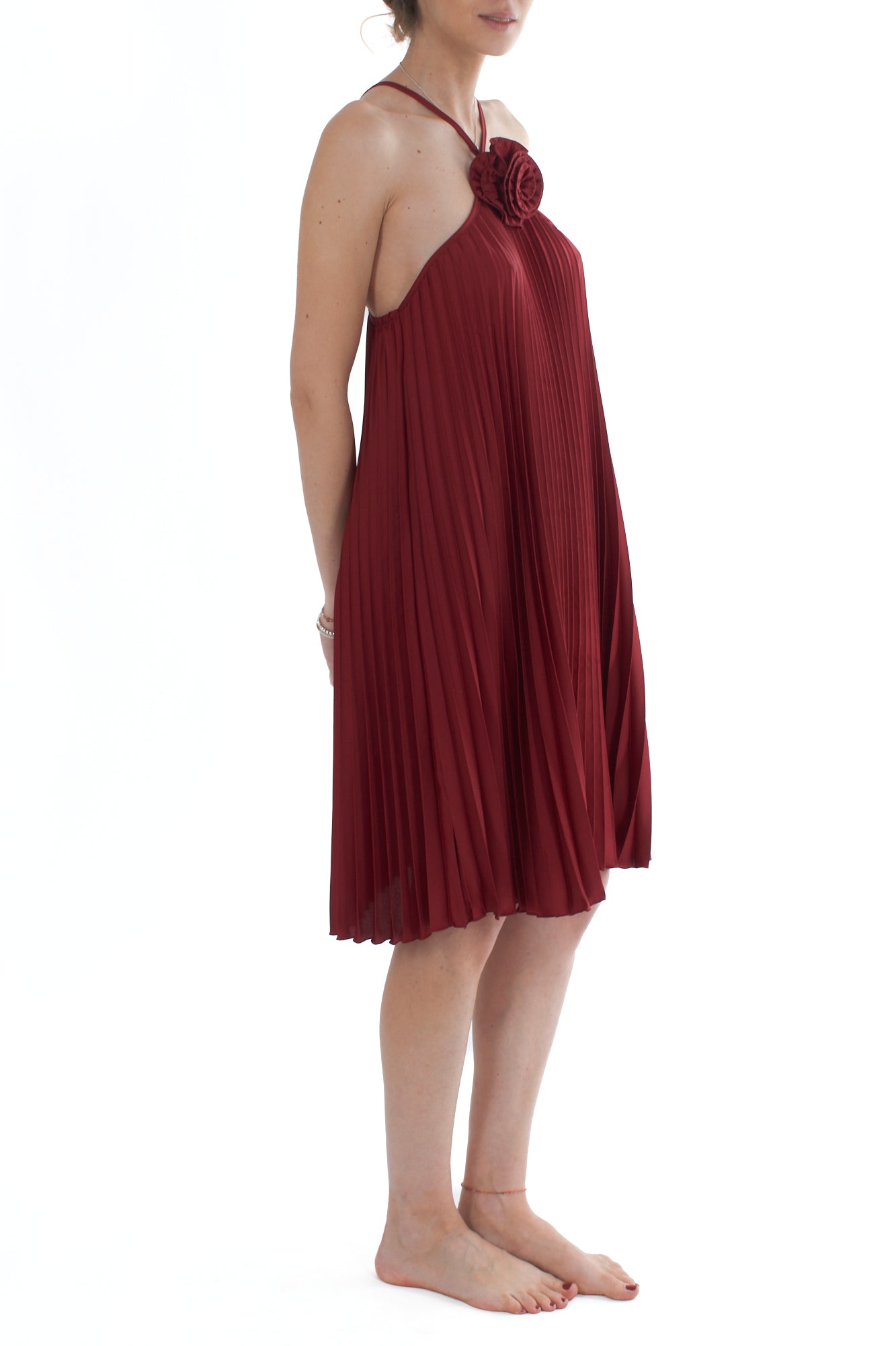 Scopri l'eleganza senza tempo del nostro abito corto plissé con fiore. Realizzato con materiali di alta qualità, questo capo offre un look raffinato e sofisticato, perfetto per ogni occasione speciale. Il design plissé aggiunge un tocco di movimento e grazia al tuo stile.
