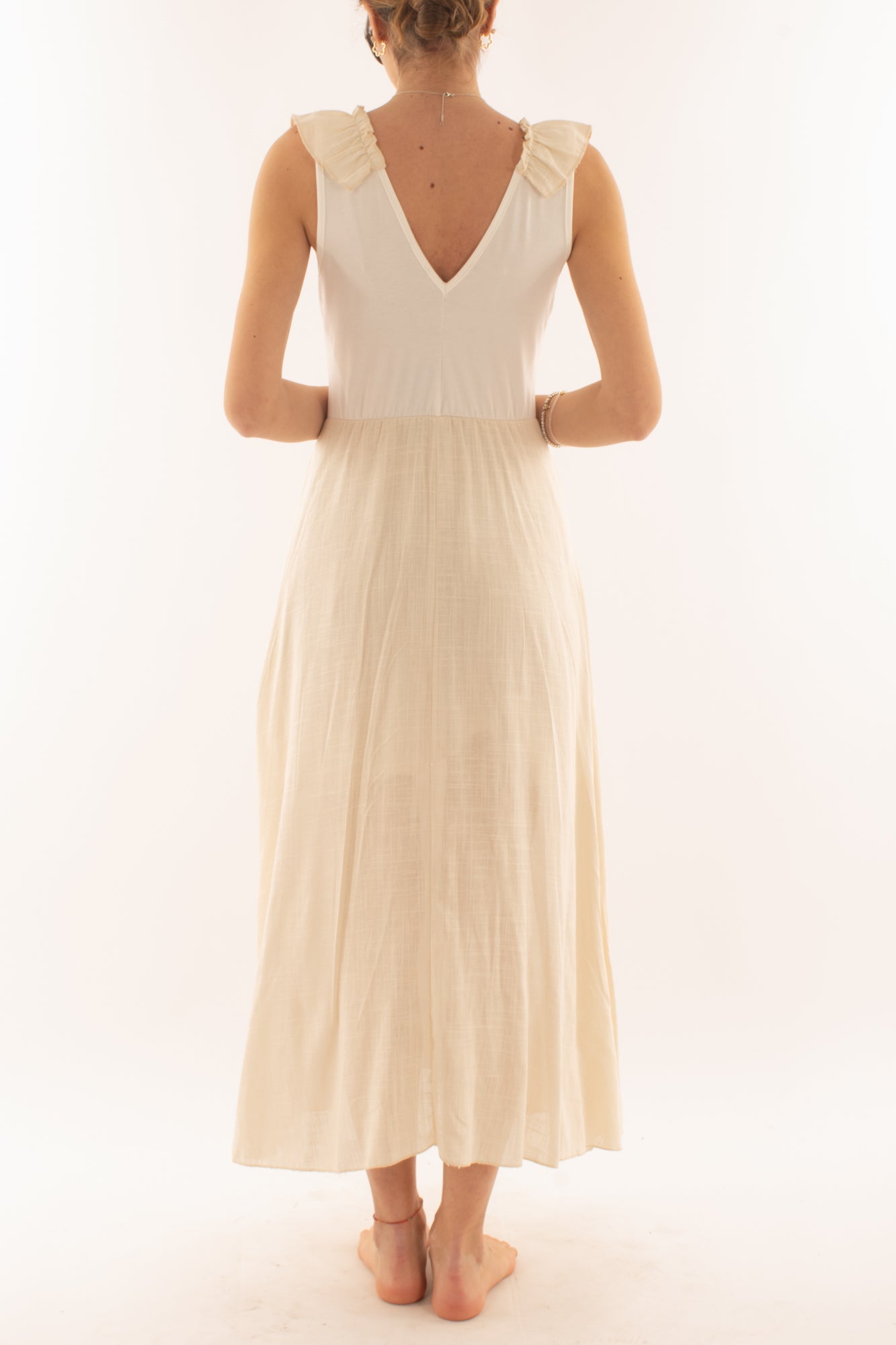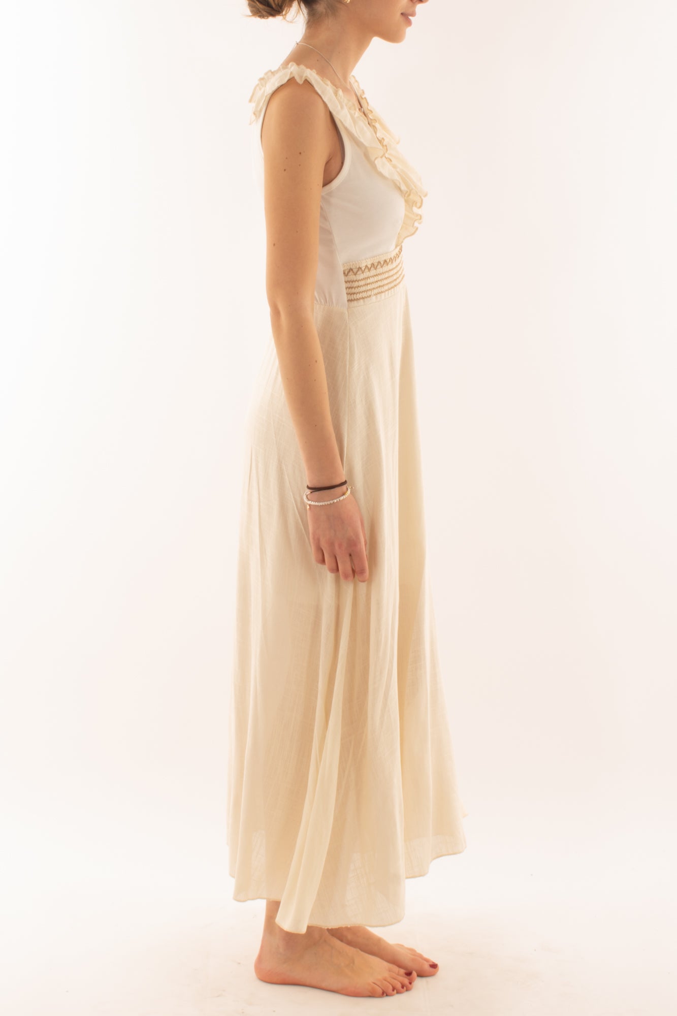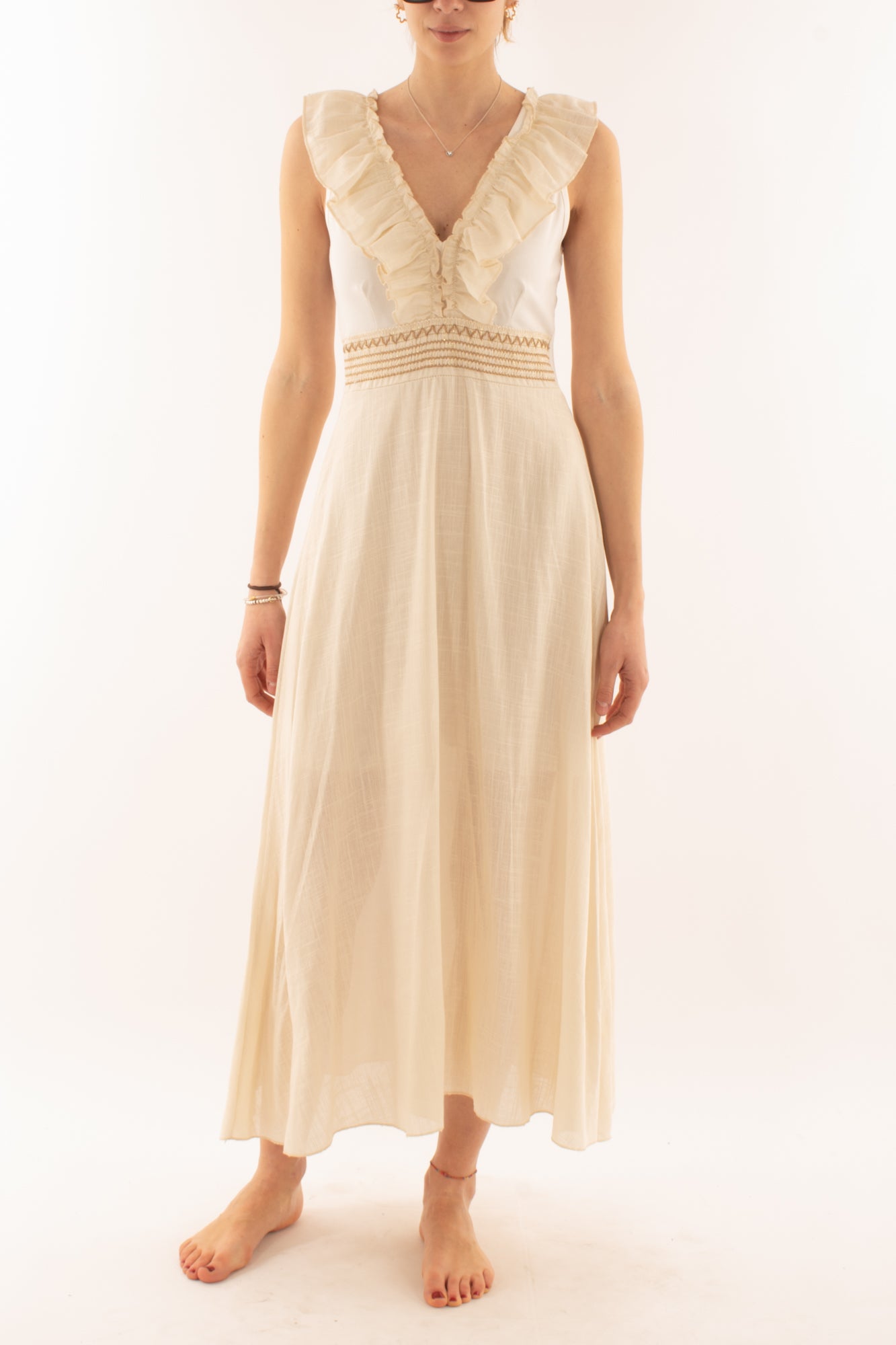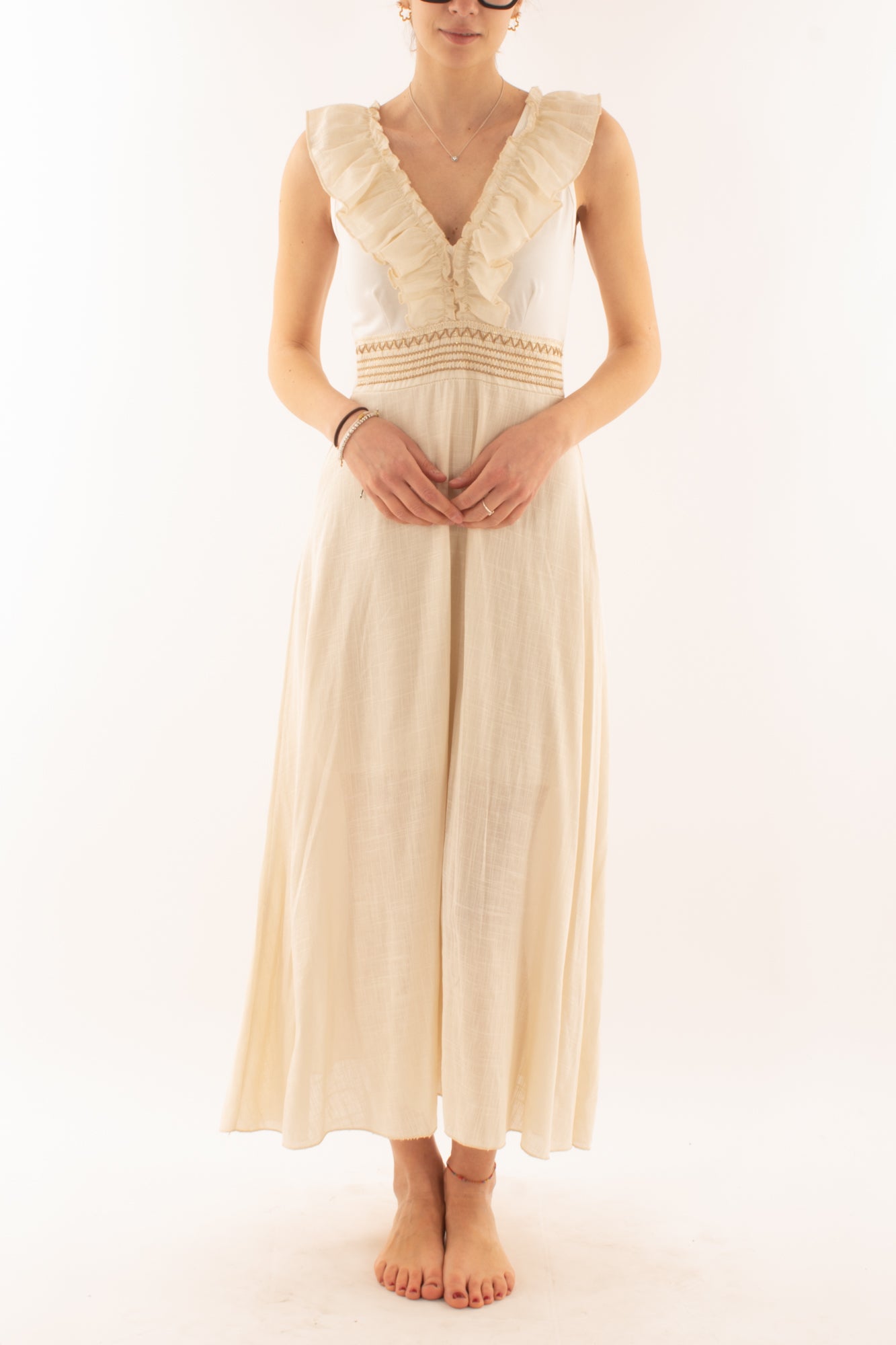 "Esalta la tua femminilità con l'abito lungo in viscosa e lino, caratterizzato da una sofisticata scollatura davanti e dietro e un punto vita ricamato. Un capo elegante e confortevole per ogni occasione."