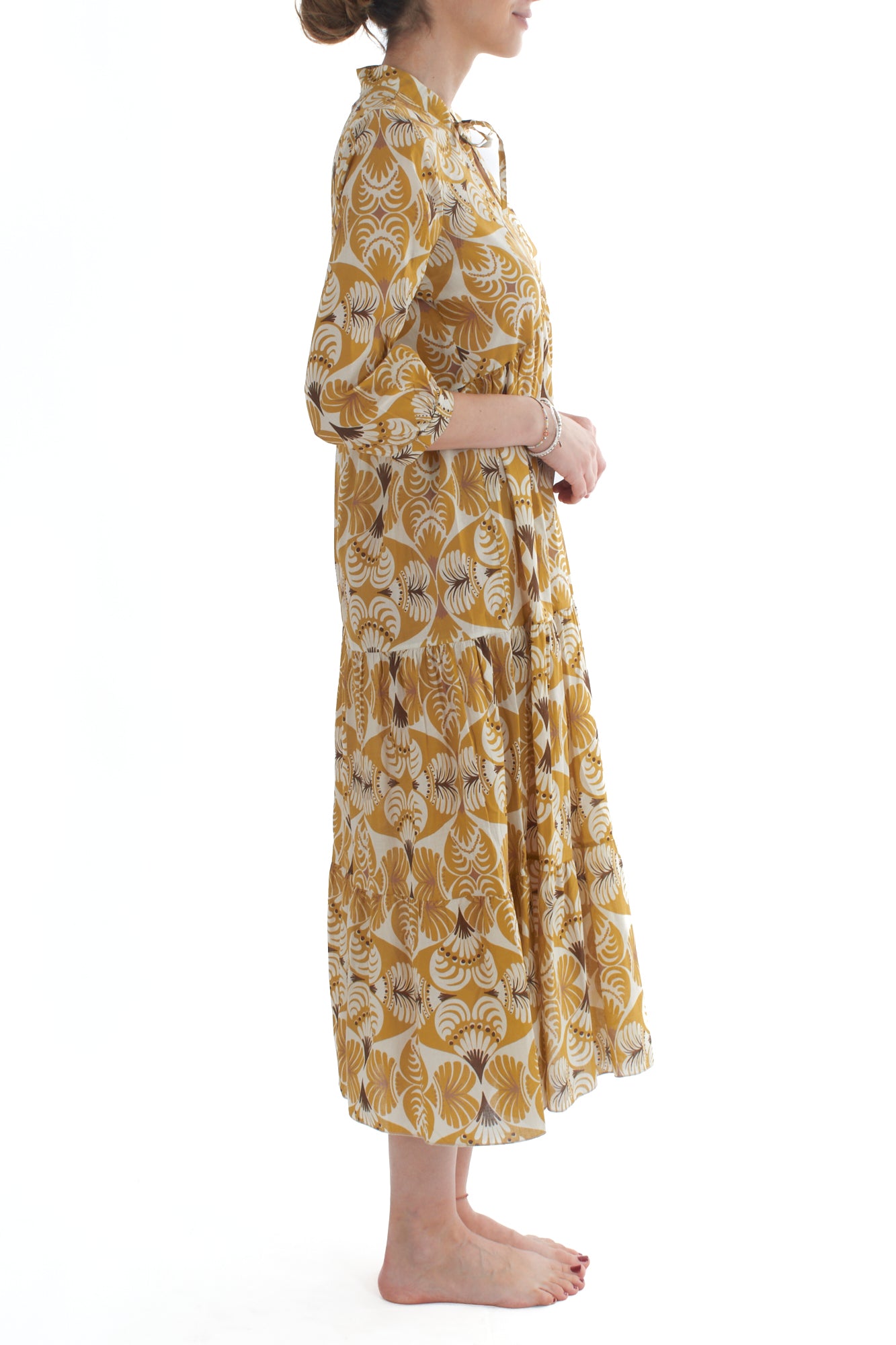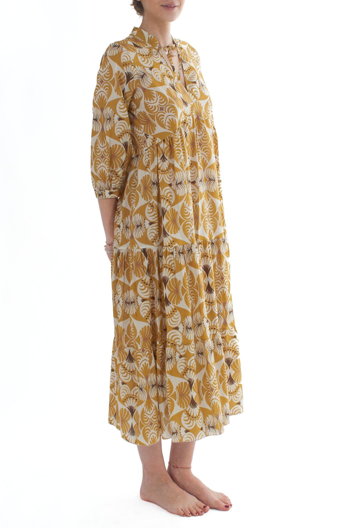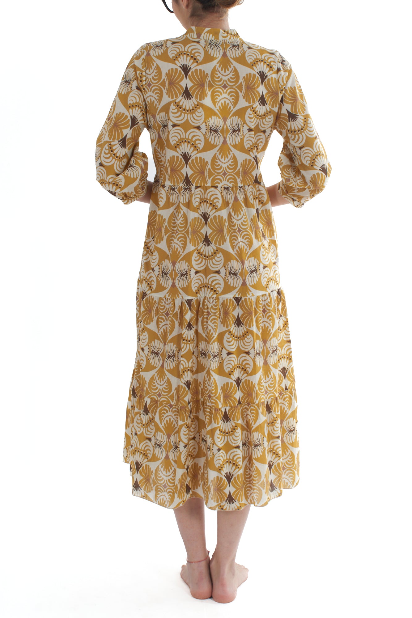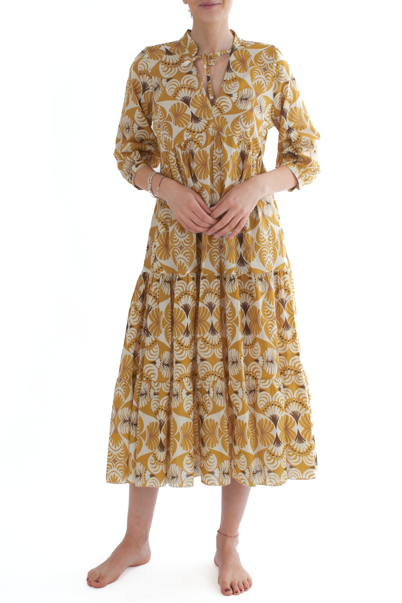 Abito in cotone con scollo a V e maniche a 3/4, decorato con una vivace fantasia. Il tessuto leggero e traspirante garantisce comfort e stile, perfetto per ogni occasione. Sottolinea la tua eleganza con un tocco di colore e design distintivo.