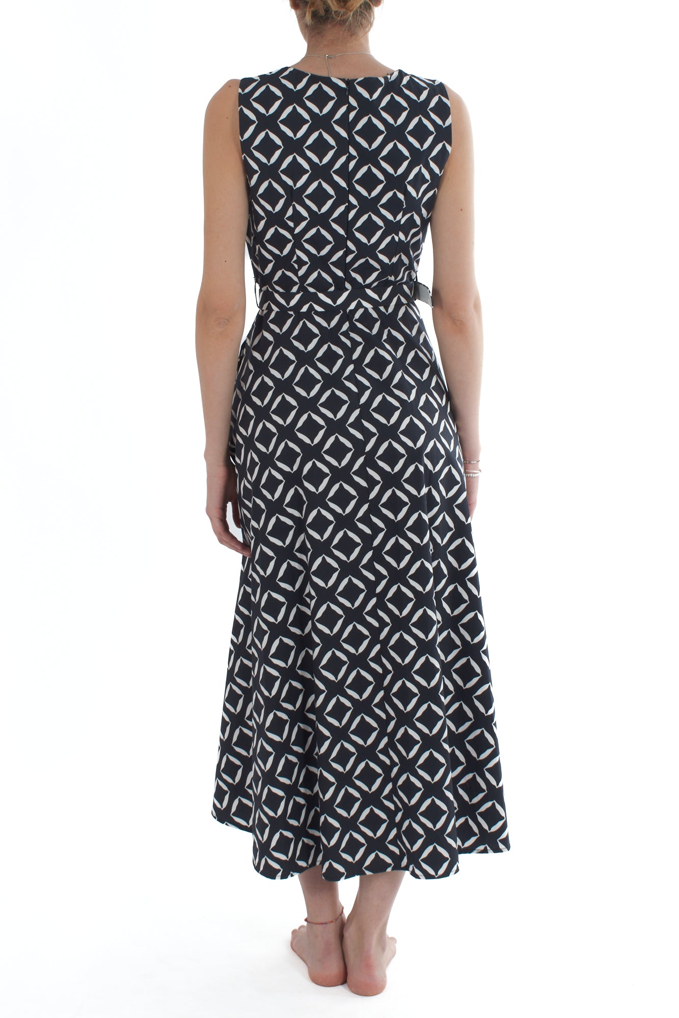 Abito smanicato lungo a V con fantasia geometrica e cintura. Perfetto per ogni occasione, questo vestito unisce eleganza e modernità, valorizzando la figura con il suo design unico e la cintura che esalta la vita. Un capo distintivo per un look sofisticato e alla moda.