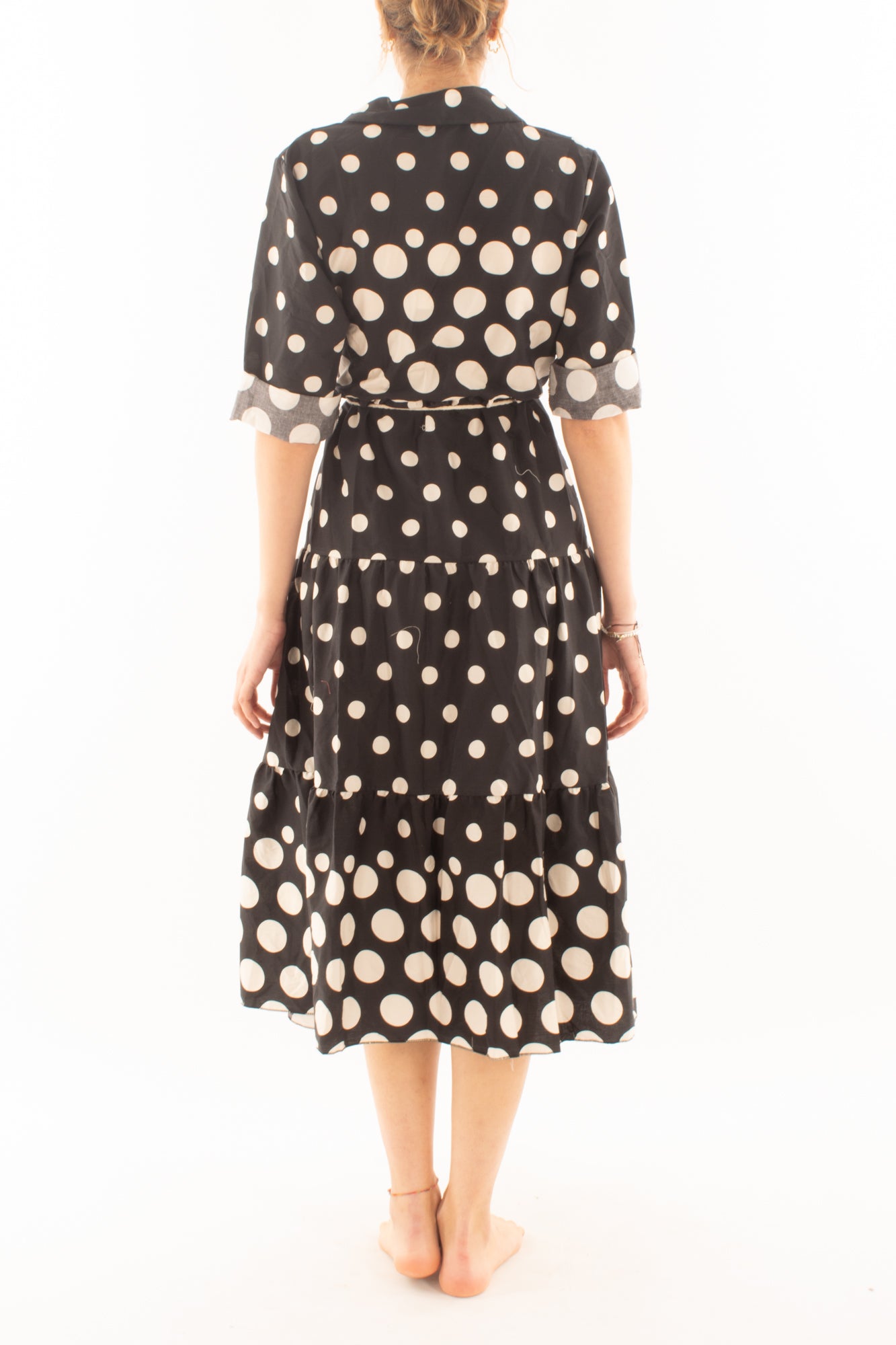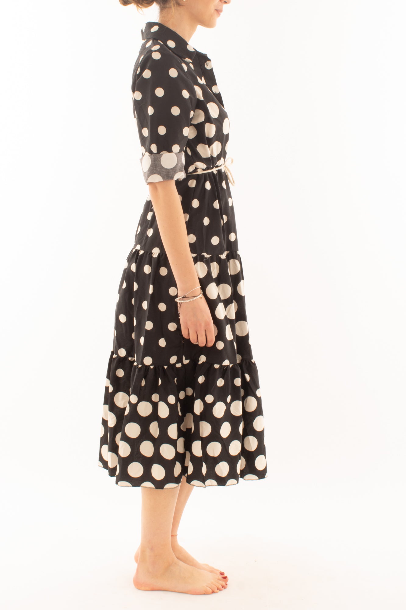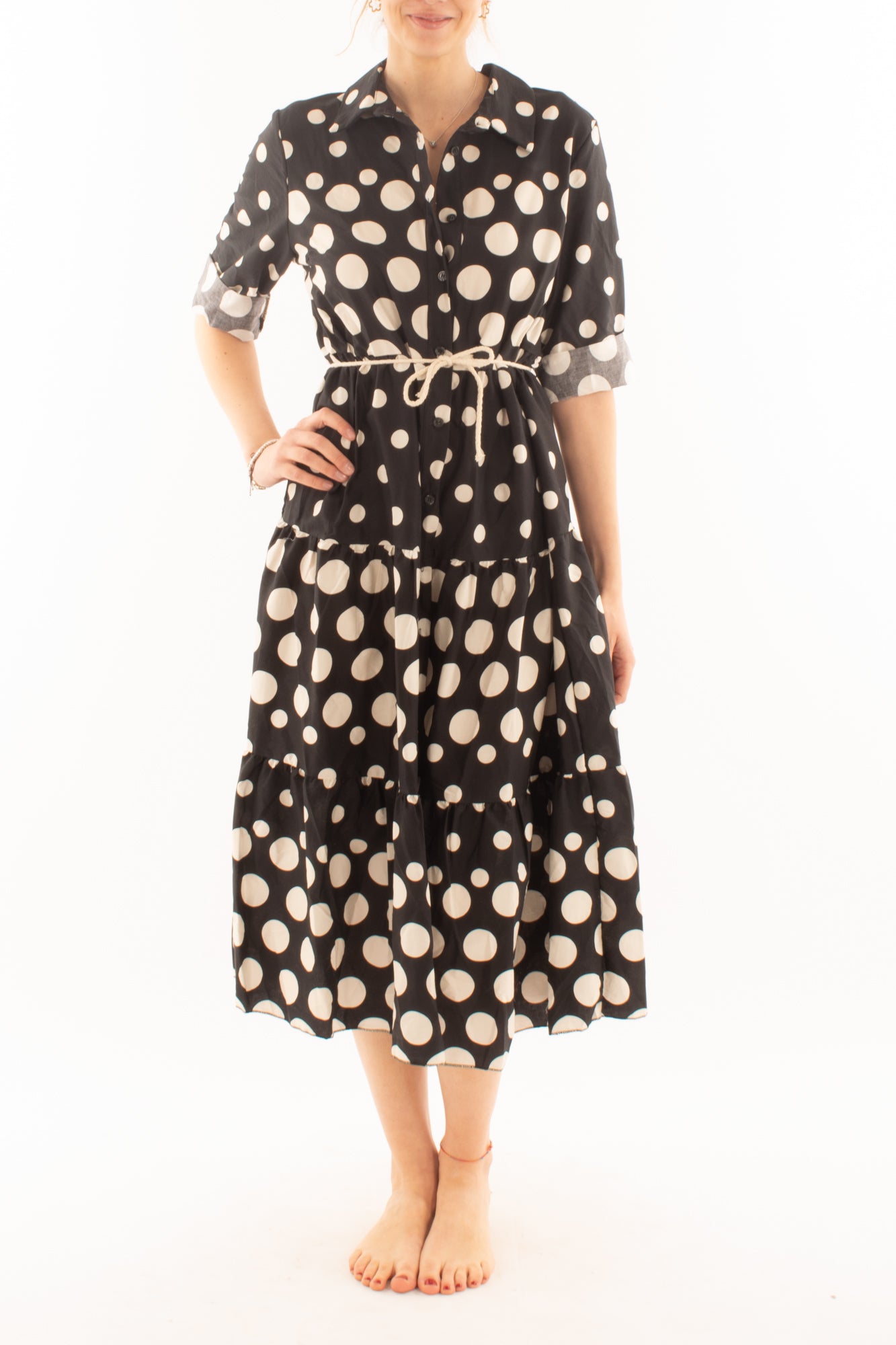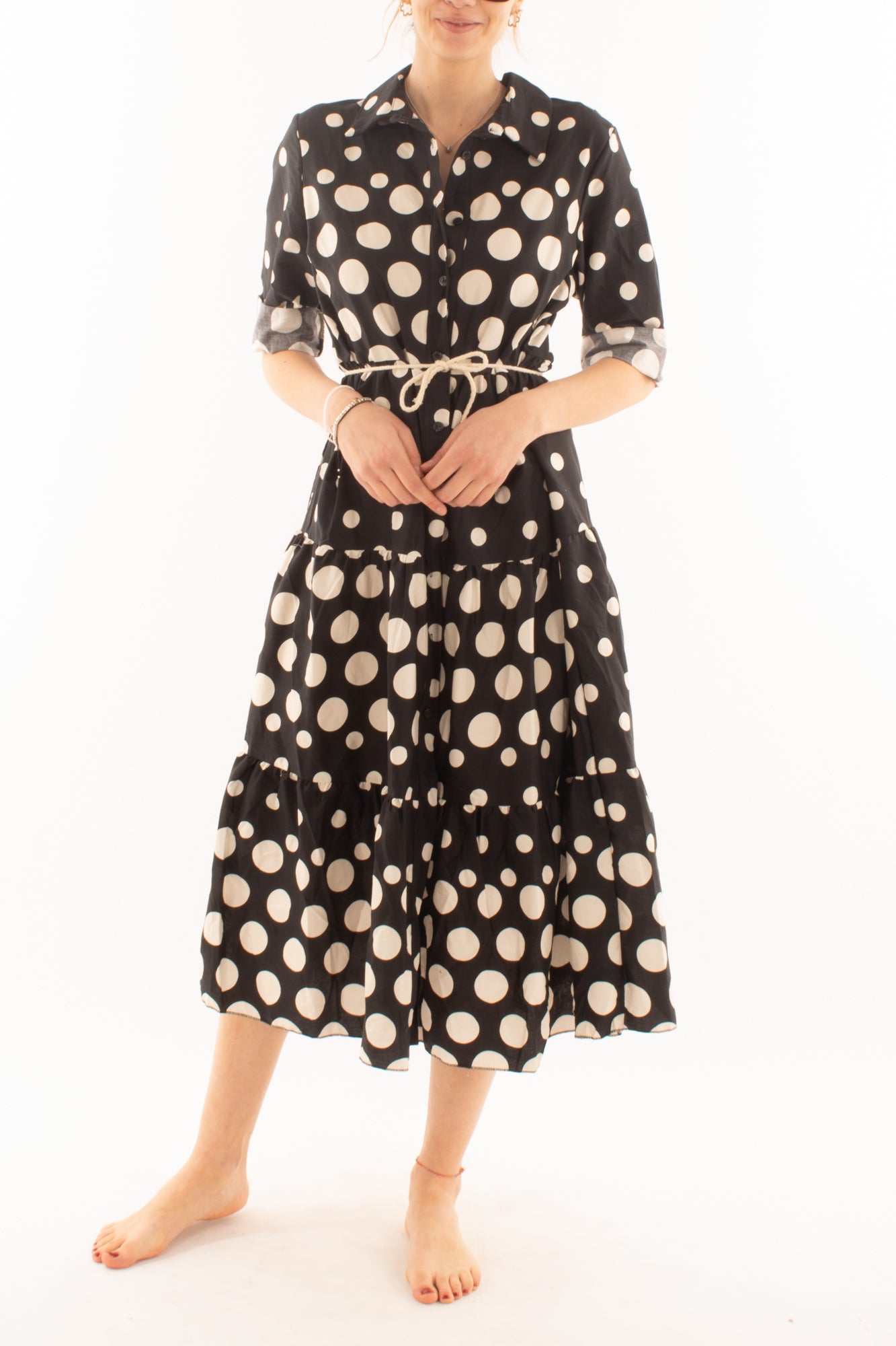 Scopri il fascino senza tempo del nostro abito lungo in cotone con raffinata stampa a pois di diverse dimensioni. Elegante e confortevole, è perfetto per ogni occasione, dal quotidiano alle serate speciali. La vestibilità fluida valorizza ogni silhouette, garantendo stile e comodità.