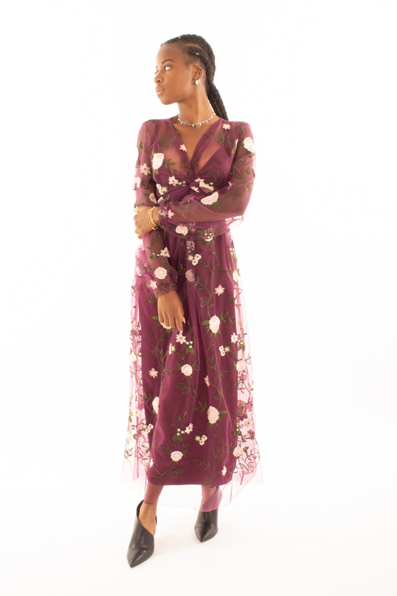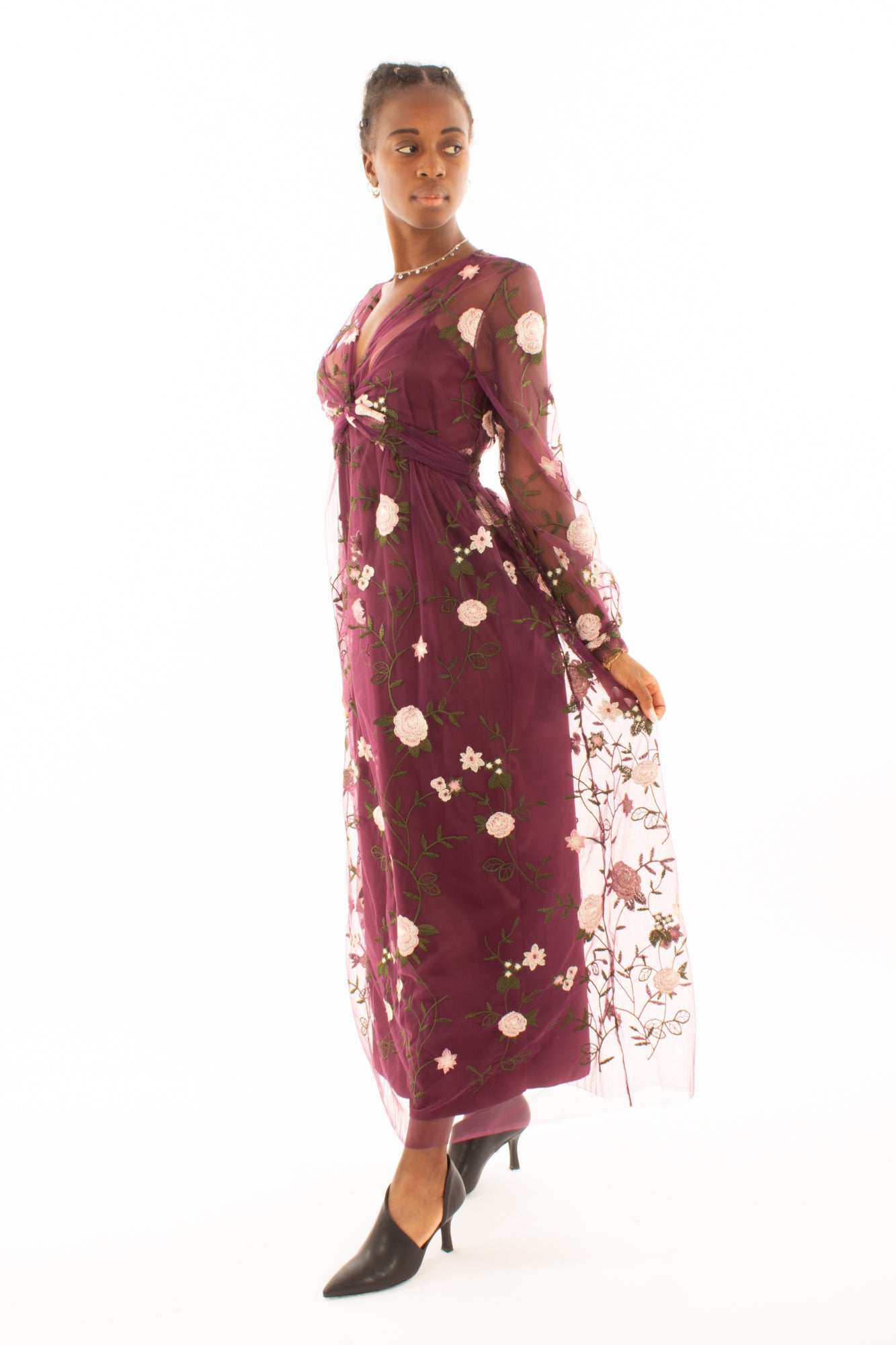 L'abito presenta uno stile senza tempo ed elegante. Realizzato in tulle con ricami floreali, questo abito ha una lunghezza fino ai piedi per un look sofisticato con uno scollo a V che ti mette in risalto. È perfetto da indossare per un matrimonio o una festa raffinata.