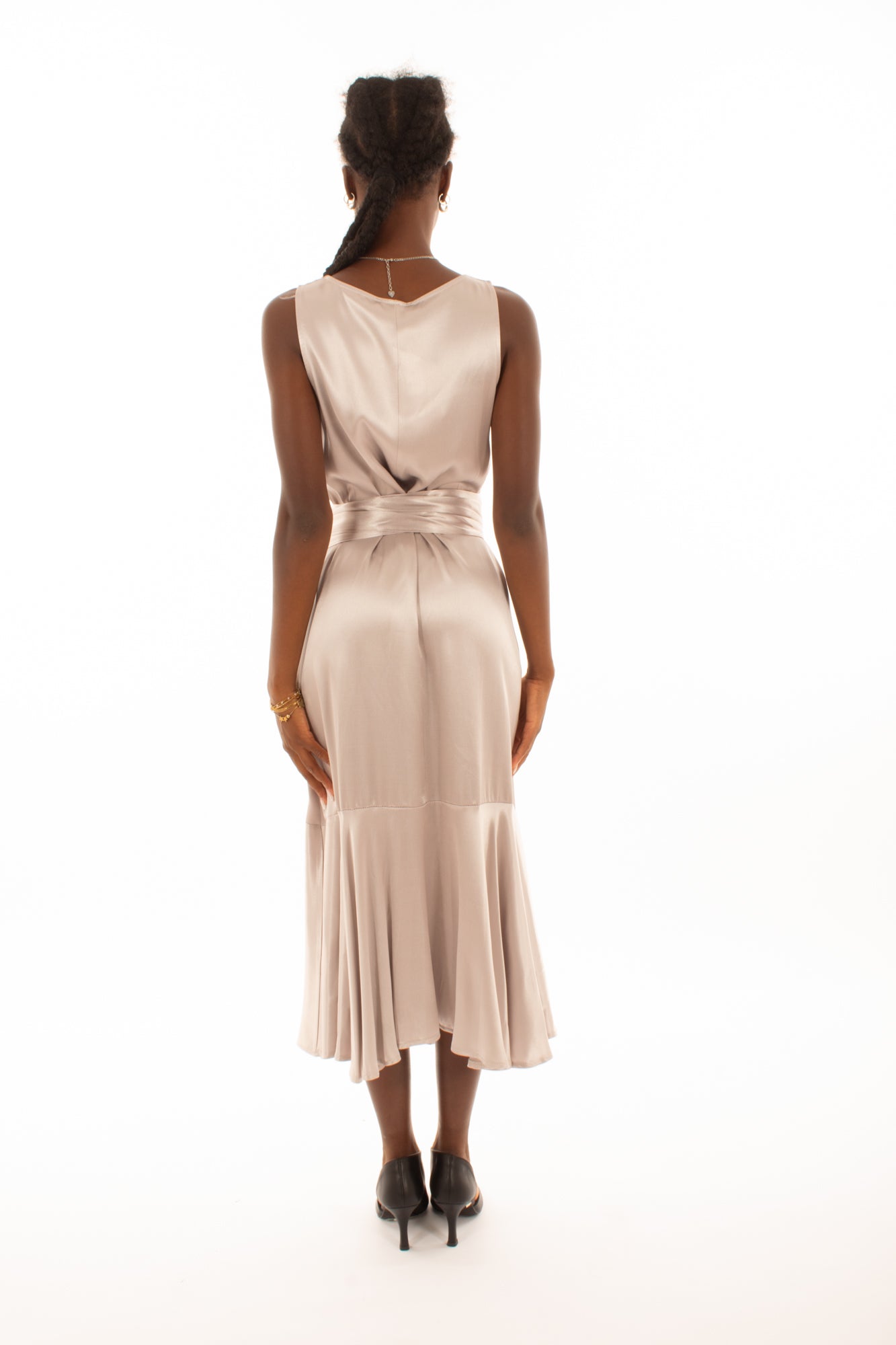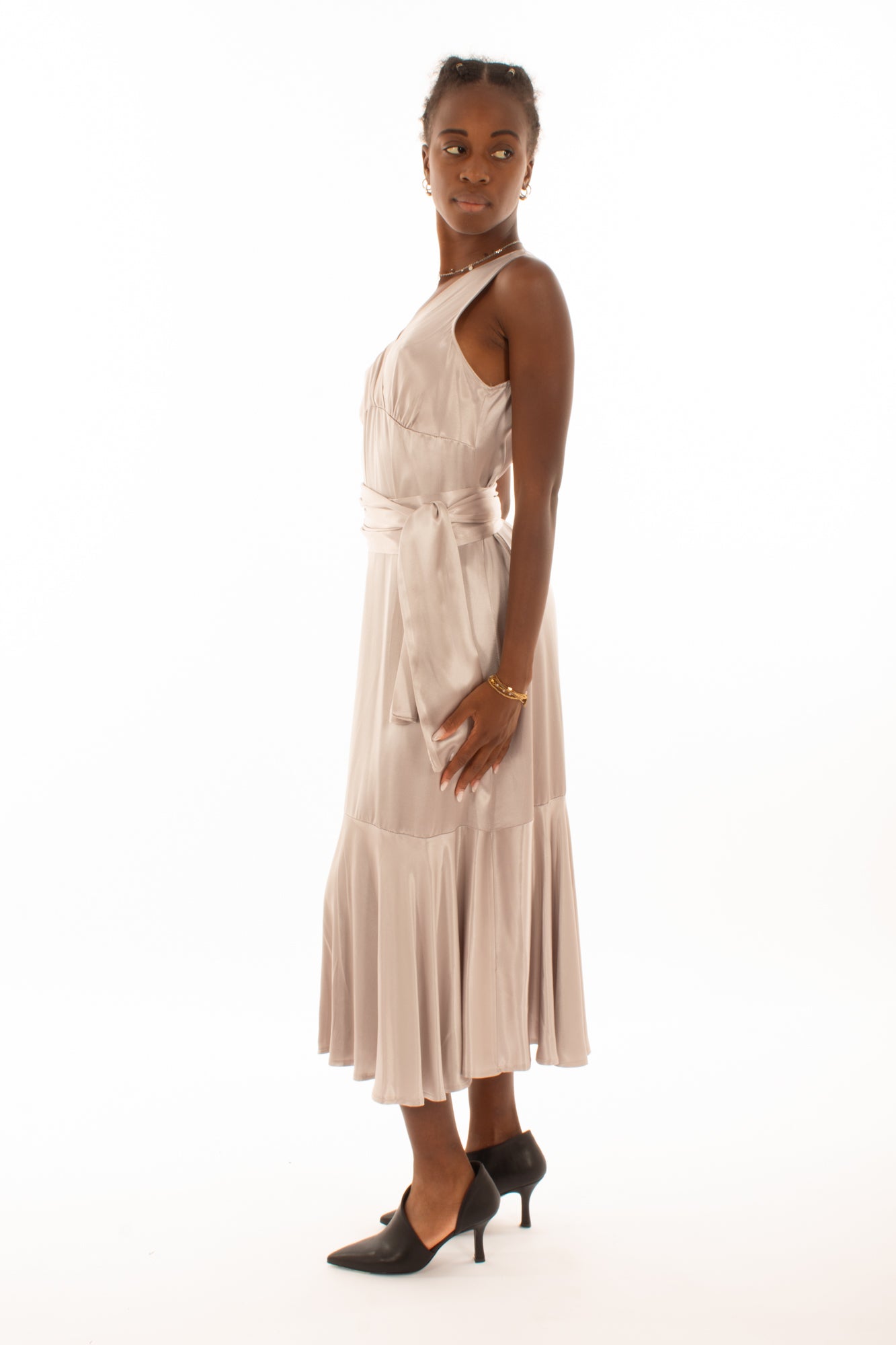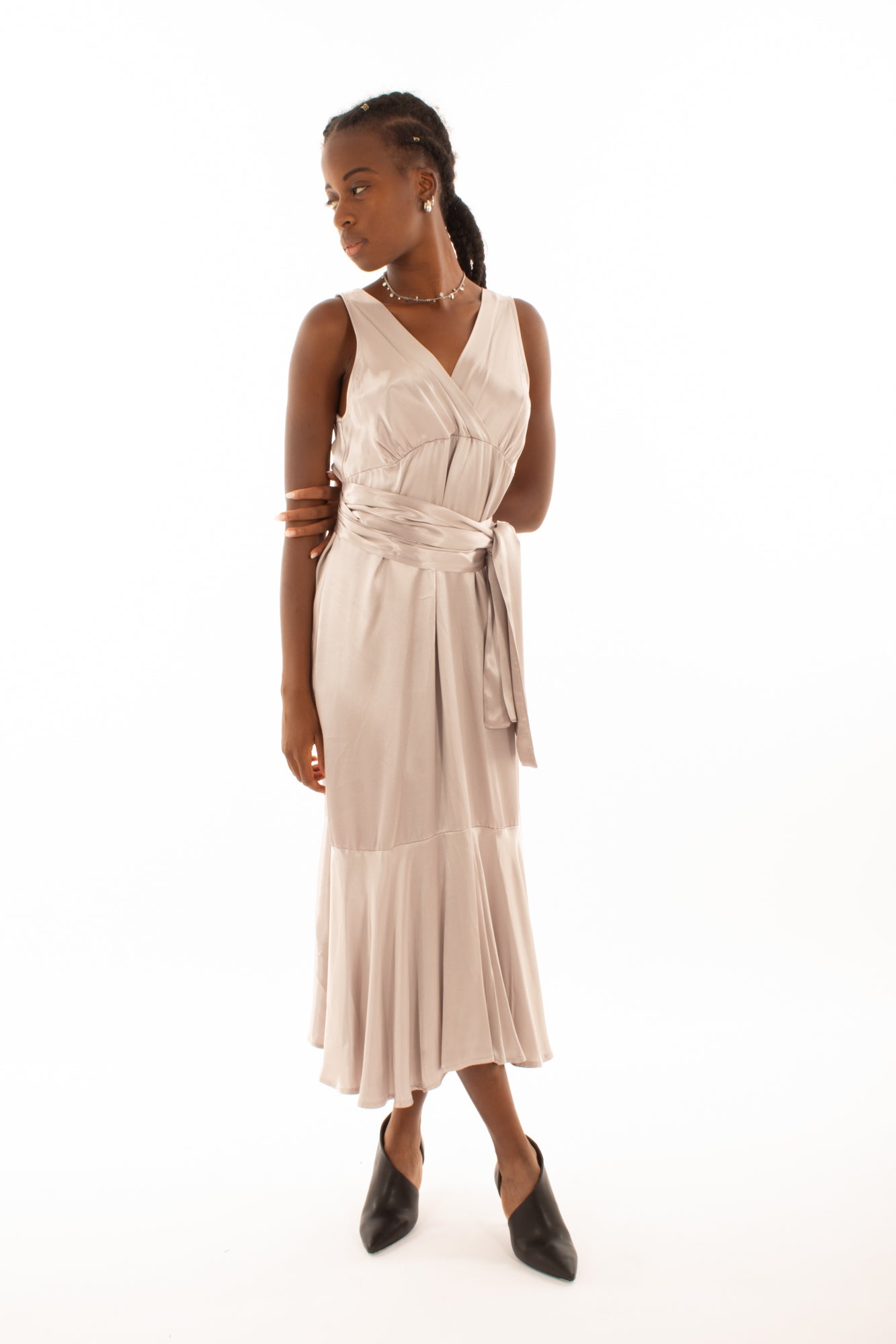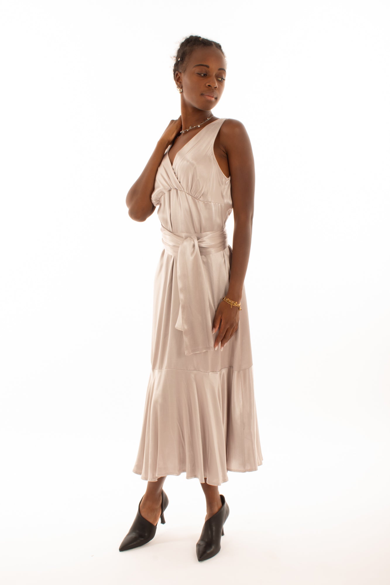 Abbraccia l'eleganza con il nostro sofisticato abito smanicato incrociato, realizzato con una finitura impeccabile in satin di alta qualità. La fusciacca aggiunge un tocco raffinato e distintivo al look, elevando questo capo al di sopra delle tendenze comuni.