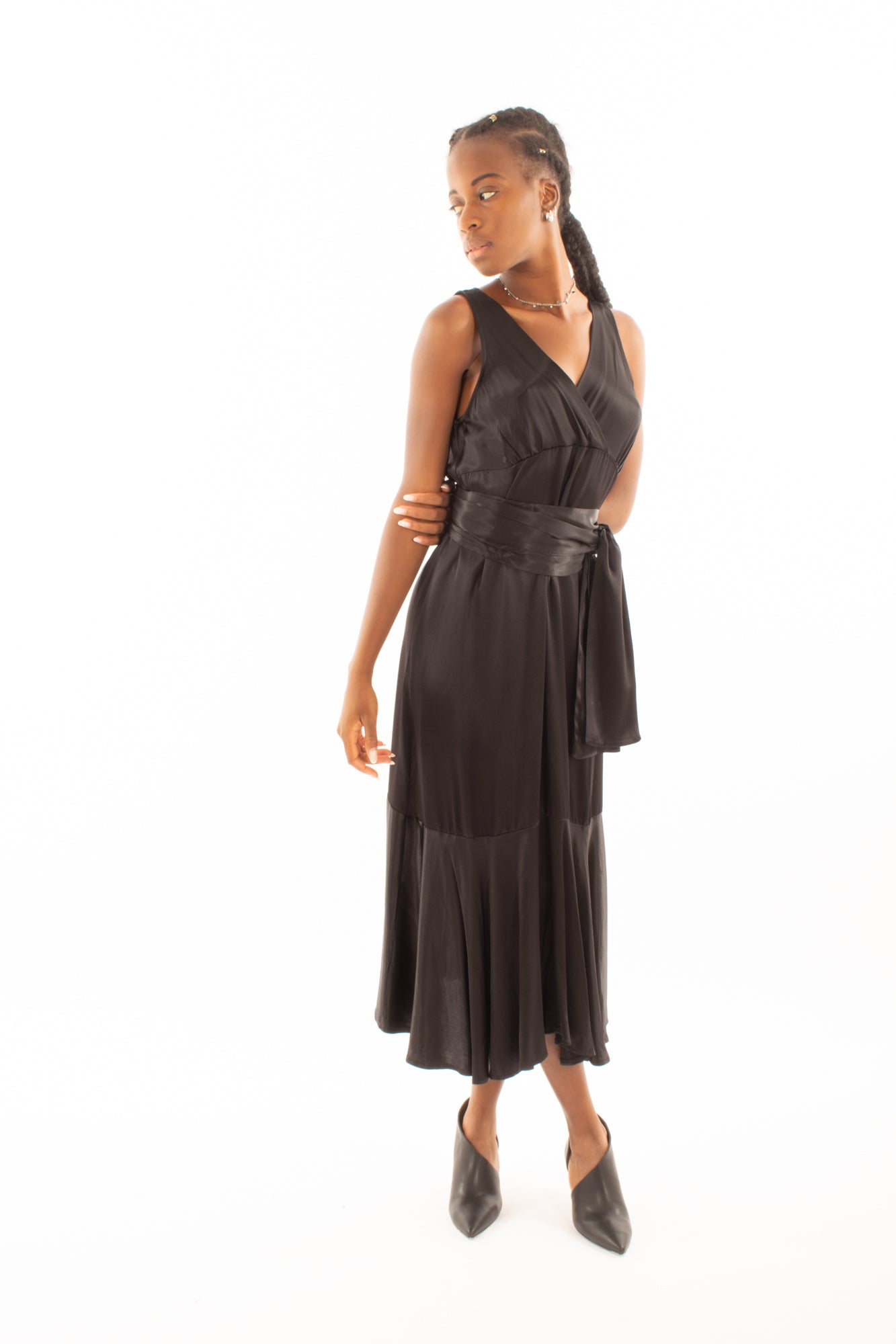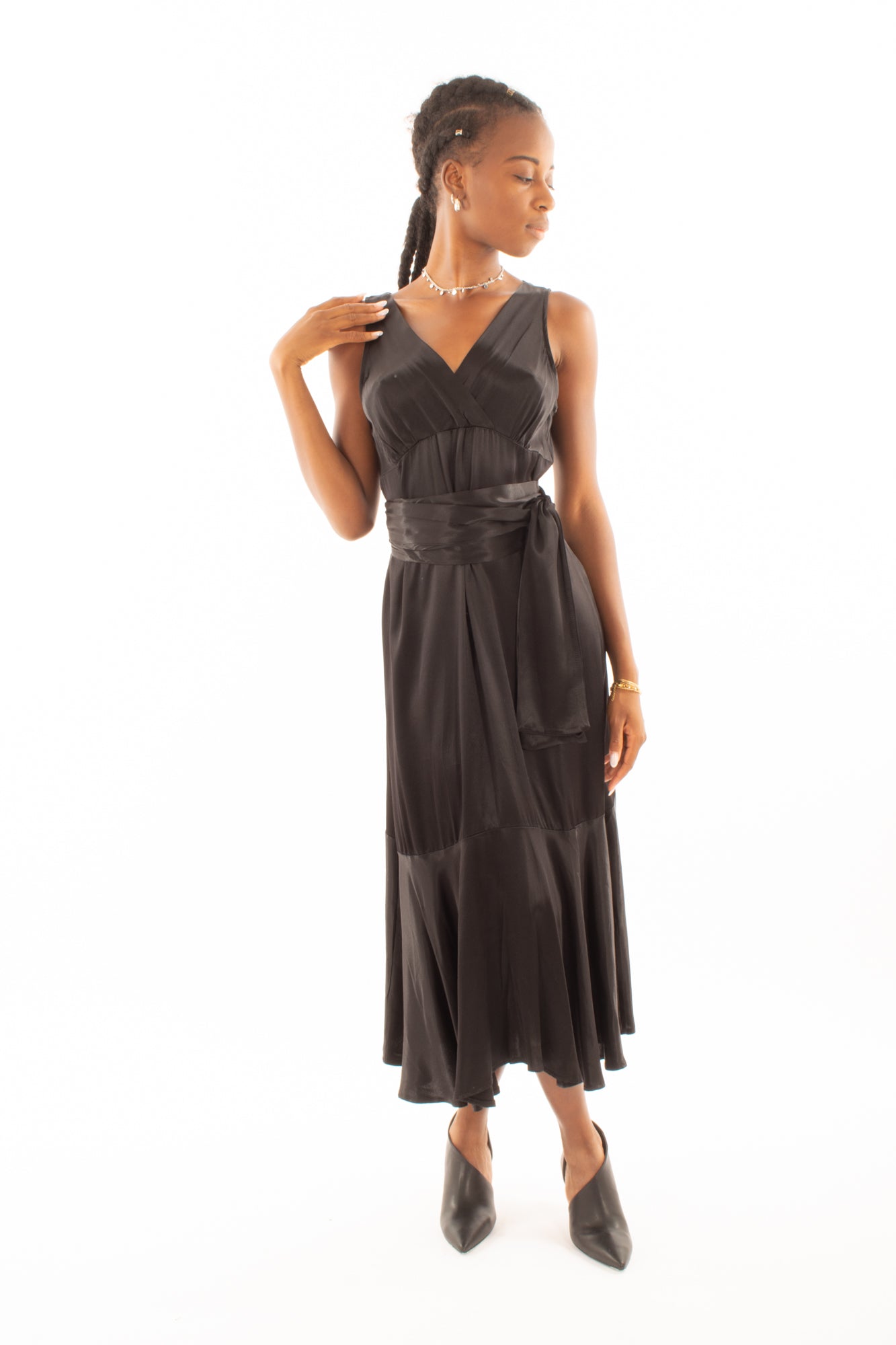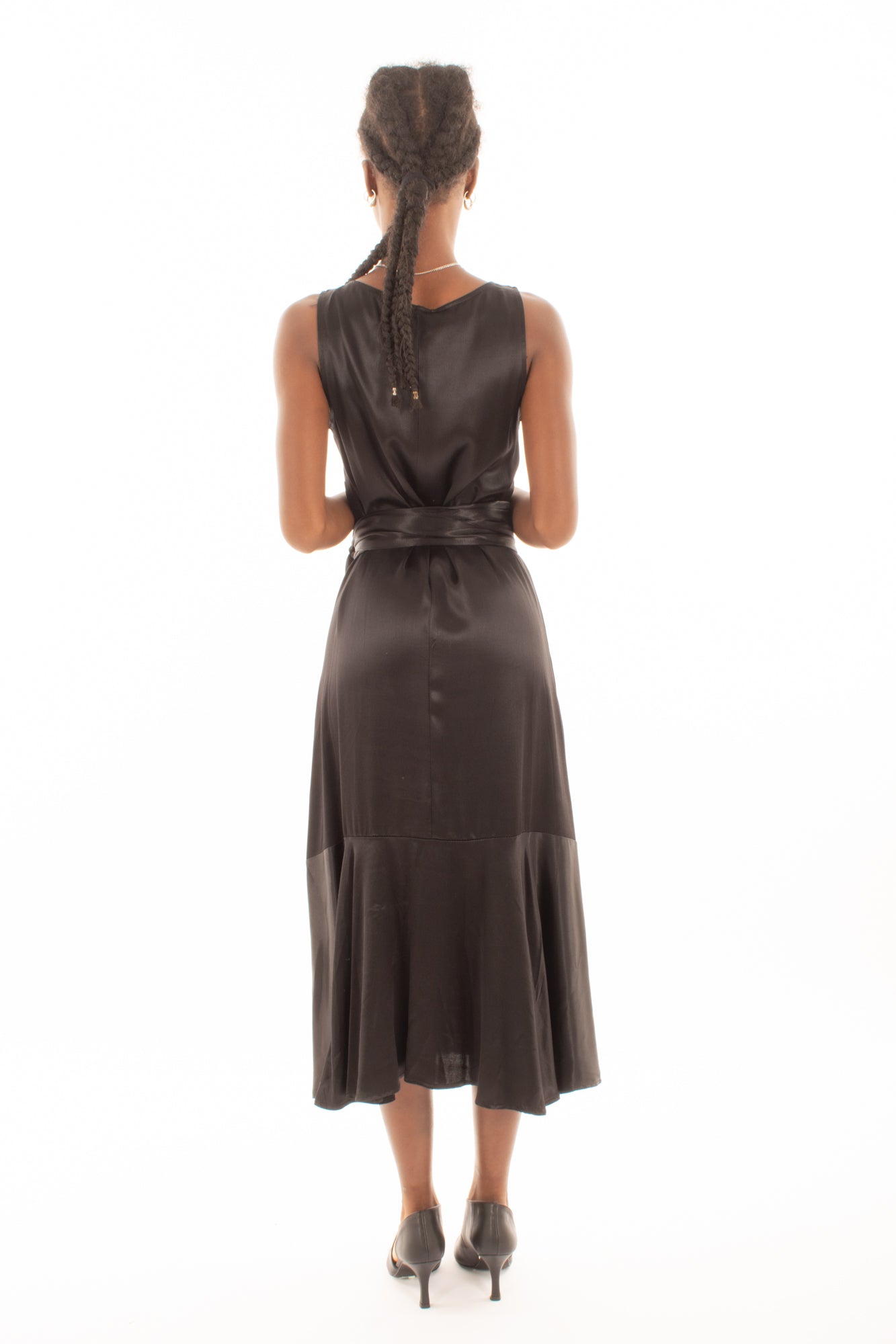 L'abito ha una finitura elegante ed è realizzato in satin di qualità. Lo stile smanicato incrociato è impreziosito da una fusciacca che conferisce un tocco raffinato al look. Un capo must-have per la tua stagione autunnale.