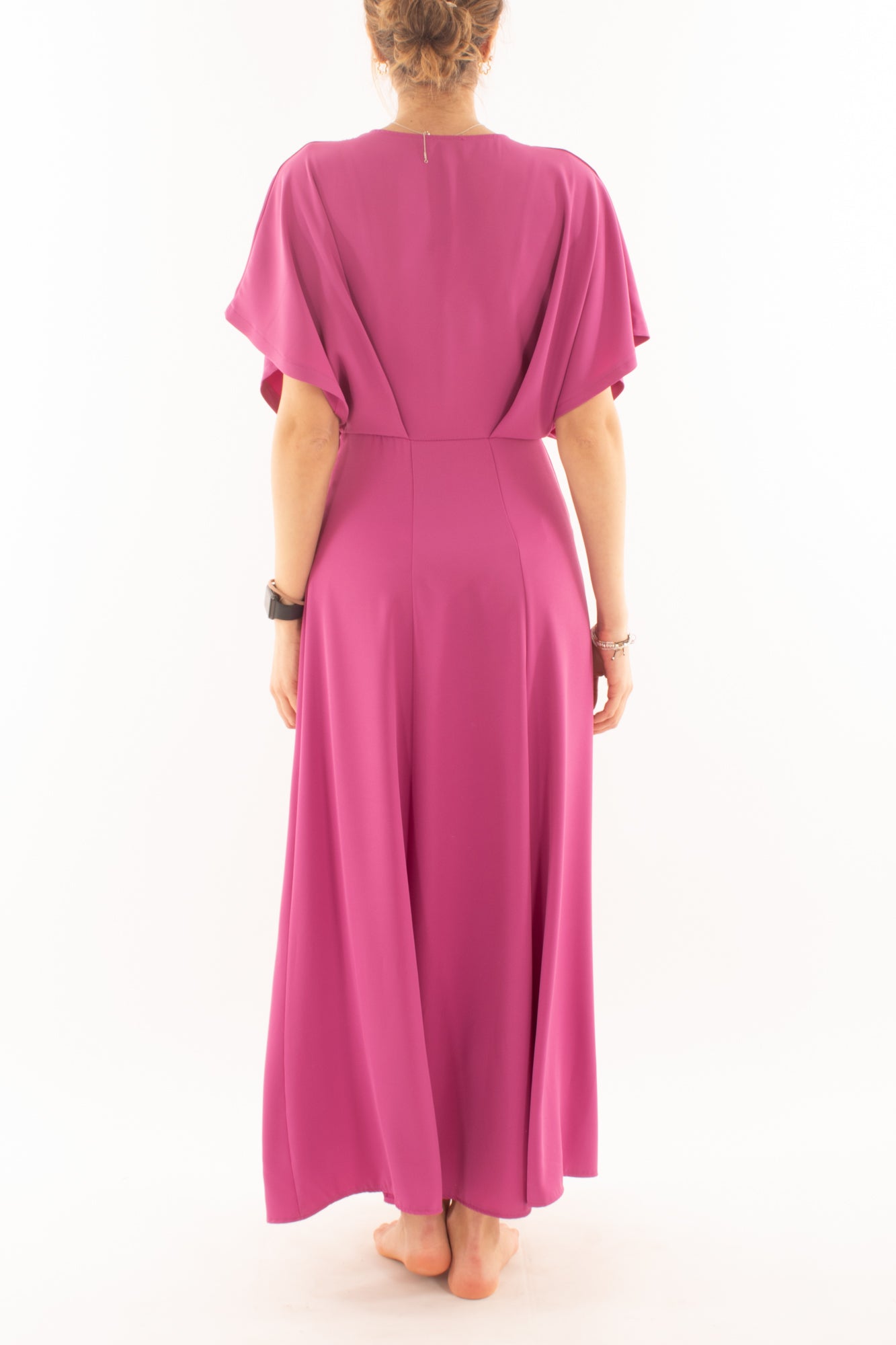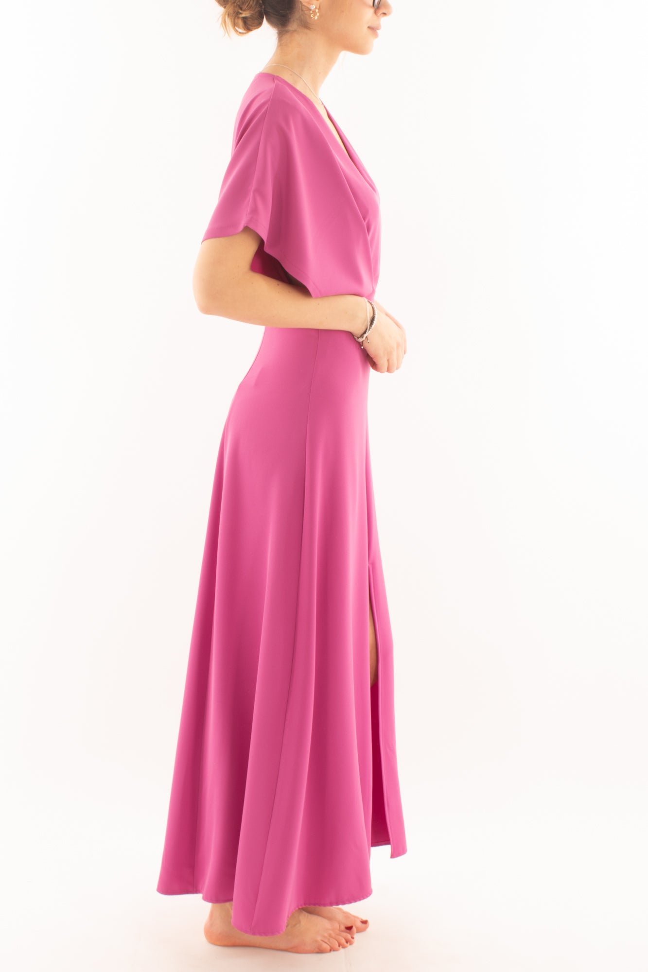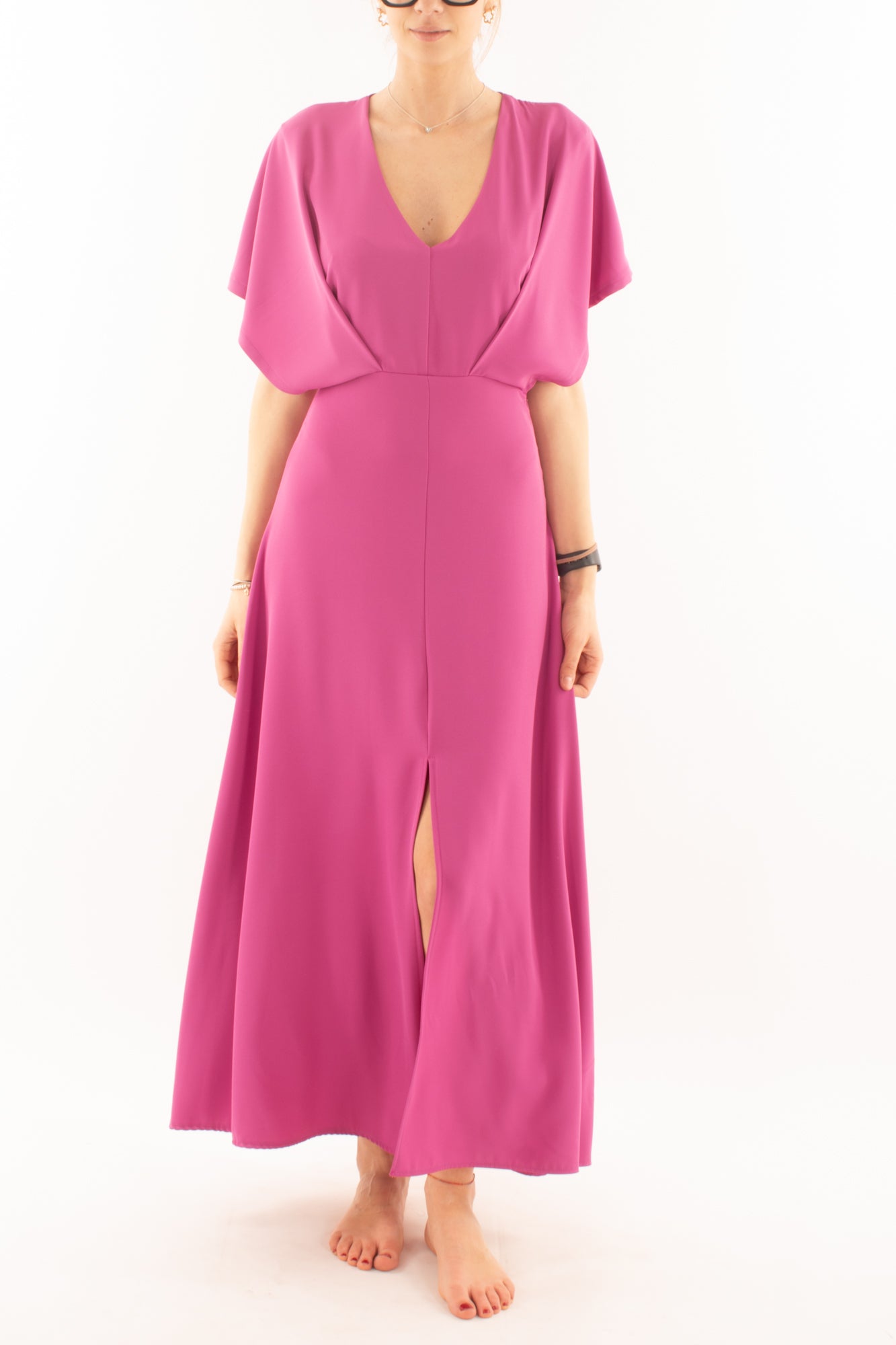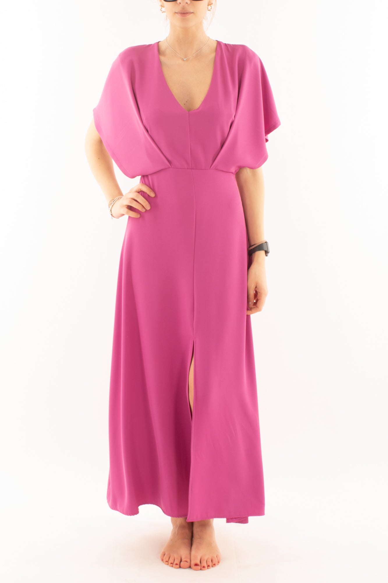 Elegante abito lungo a mezza manica con scollo a V e spacco centrale, perfetto per occasioni speciali. Realizzato con tessuti di alta qualità, garantisce comfort e stile