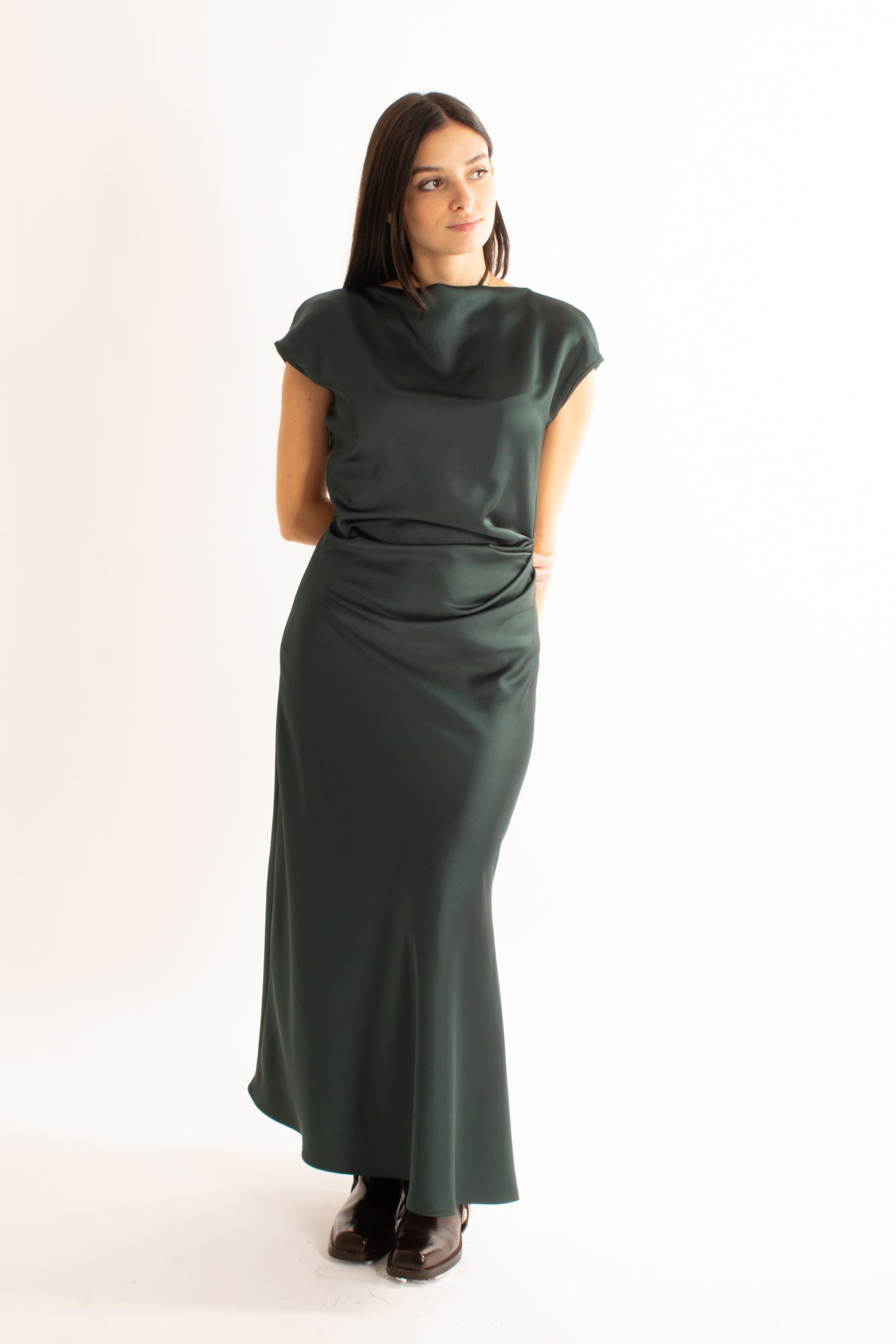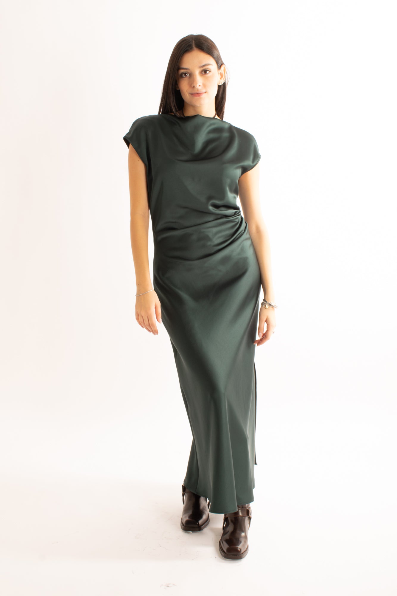 Abito lungo con arricciatura di lato e spacco, veste aderente.