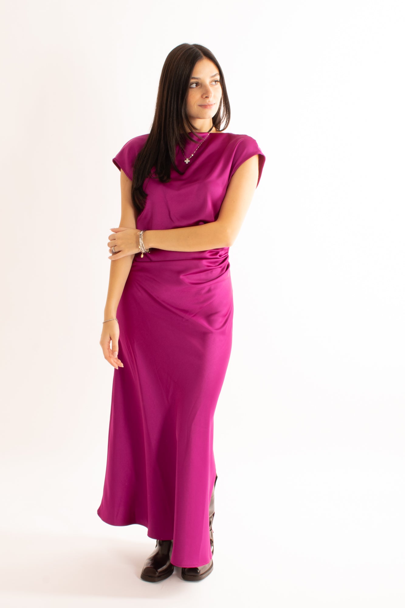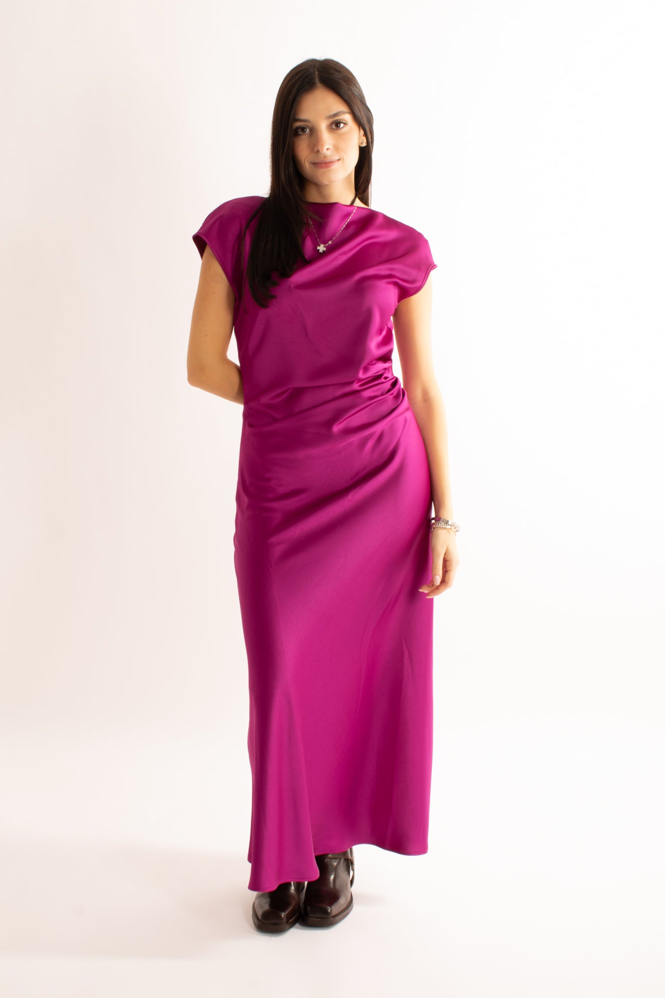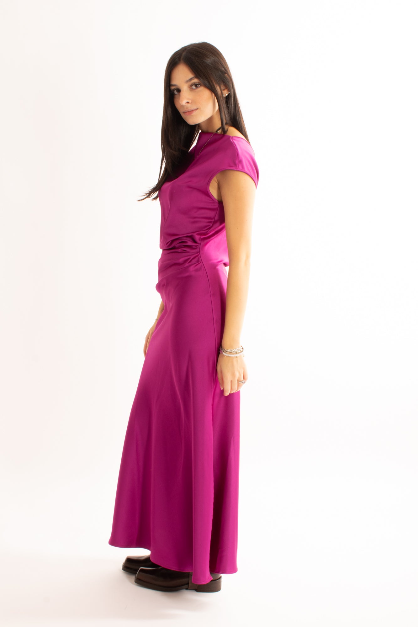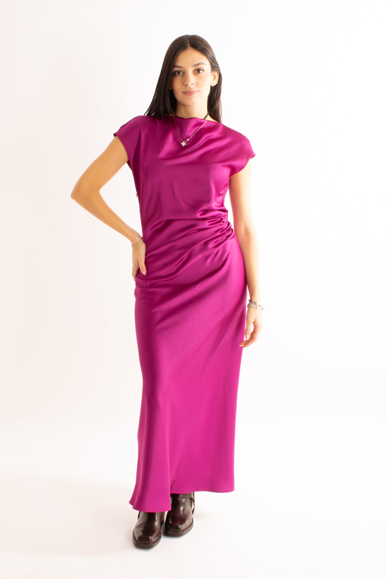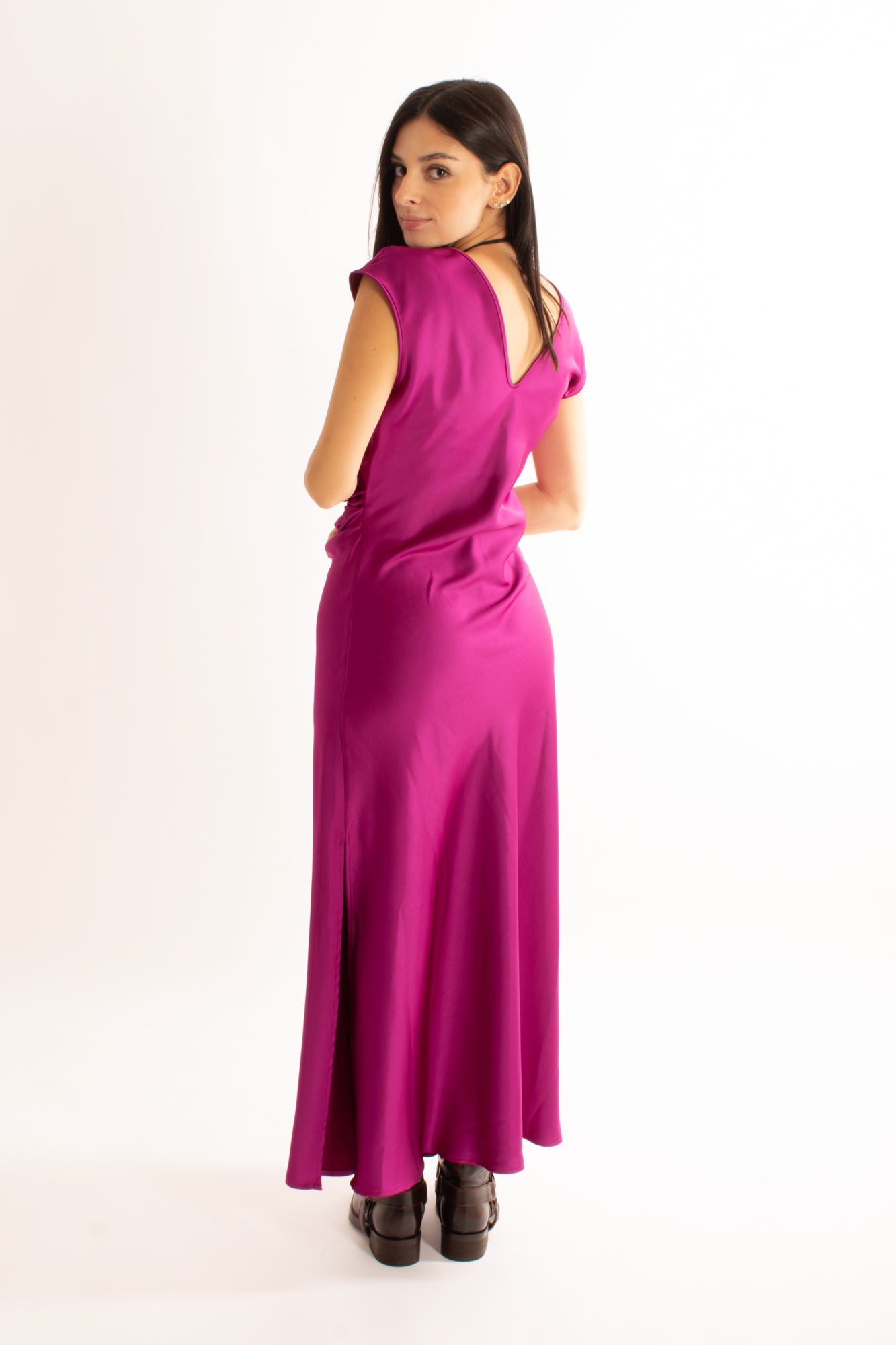 Abito lungo con arricciatura di lato e spacco, veste aderente.