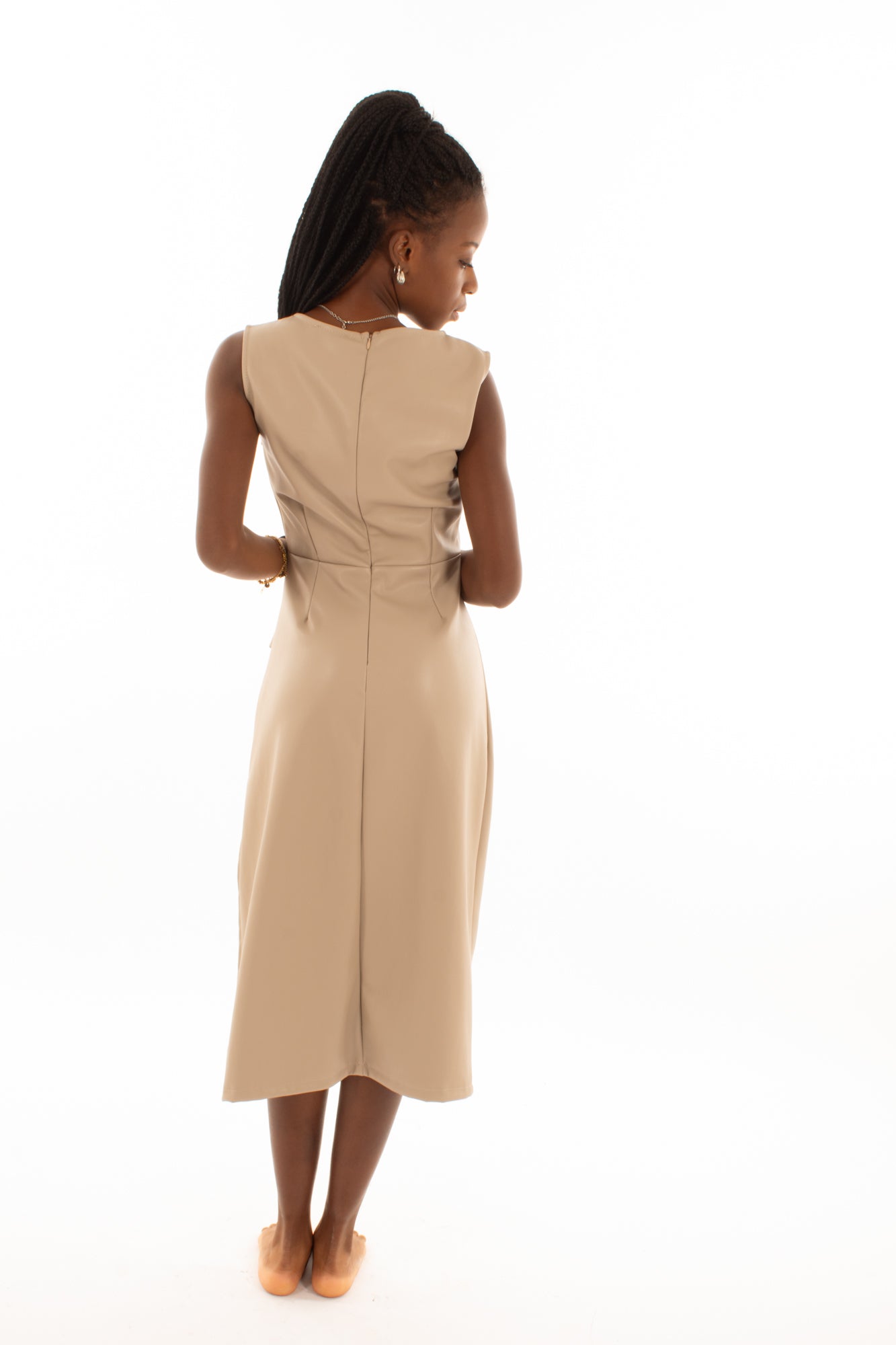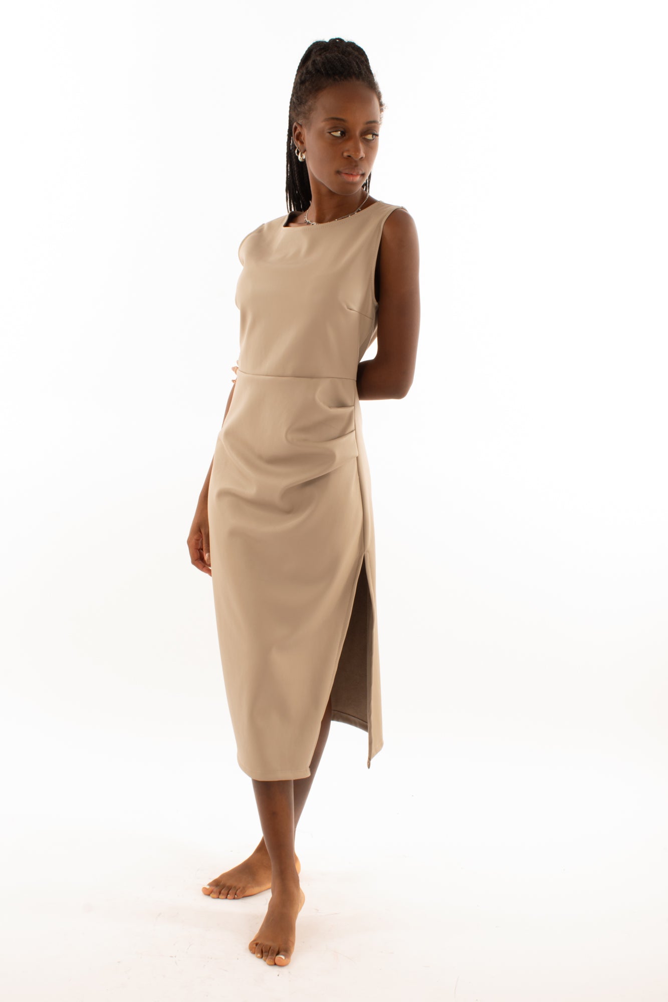 "Elegante abito lungo in eco pelle con affascinante arricciatura laterale. Perfetto per un look sofisticato e sostenibile. Scopri il comfort e lo stile unici di questo capo ecologico."