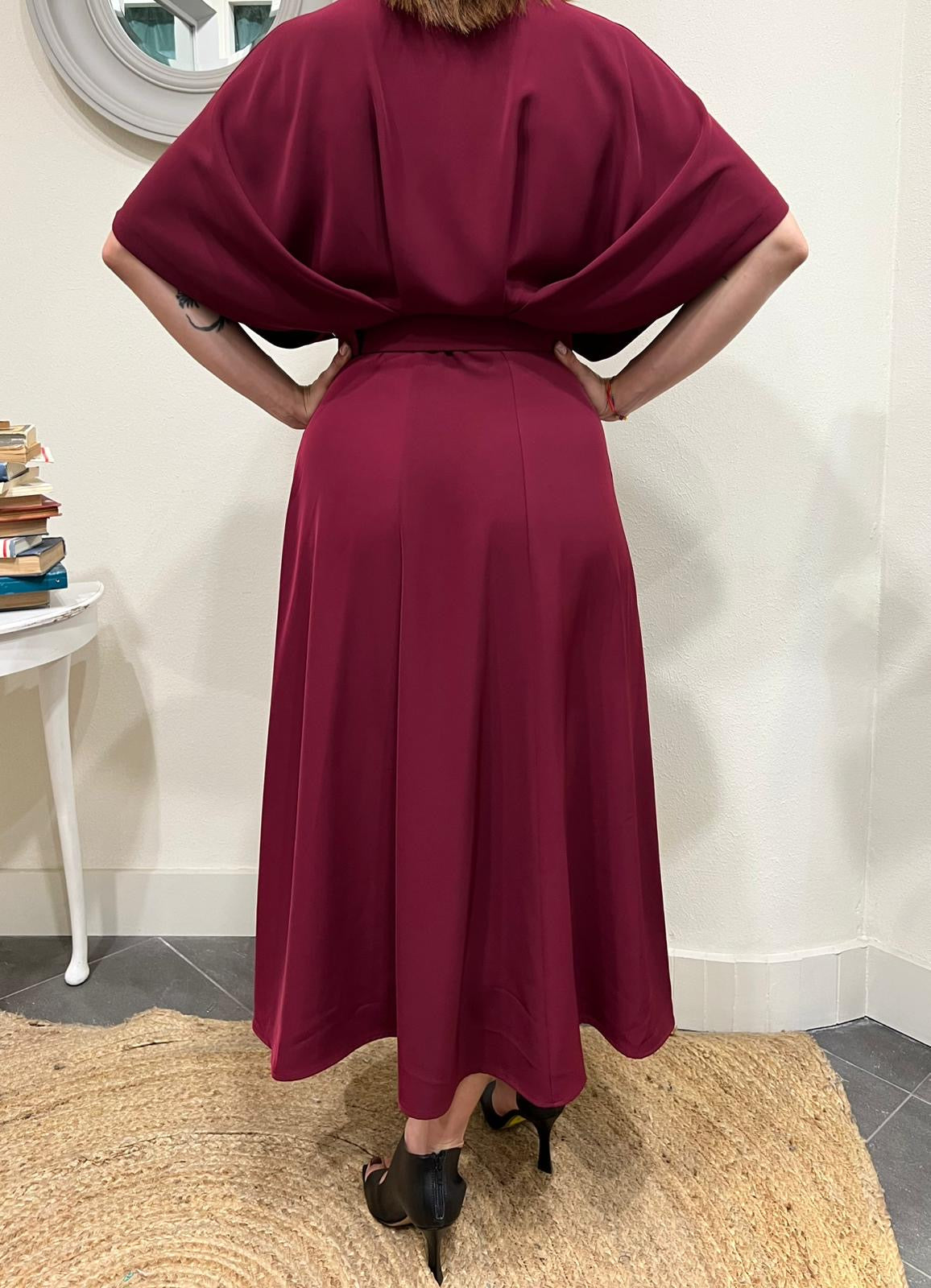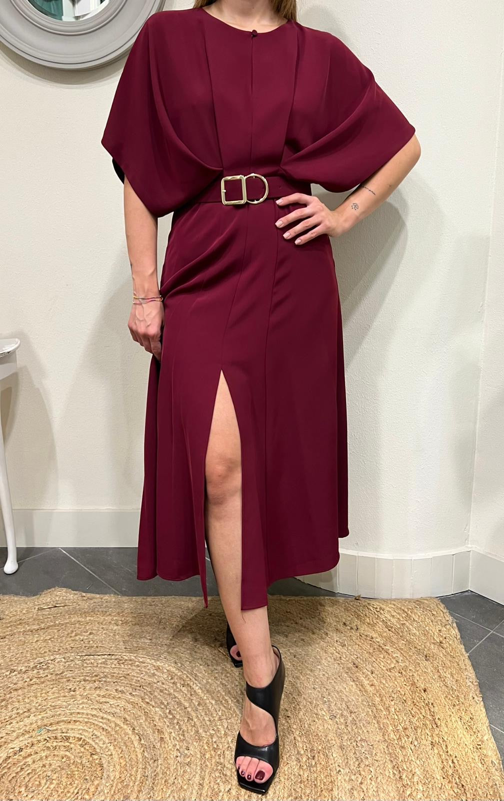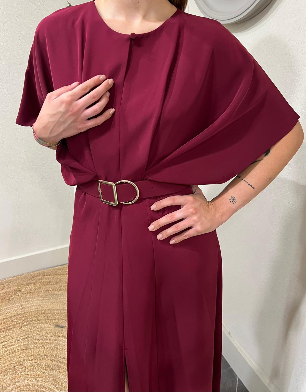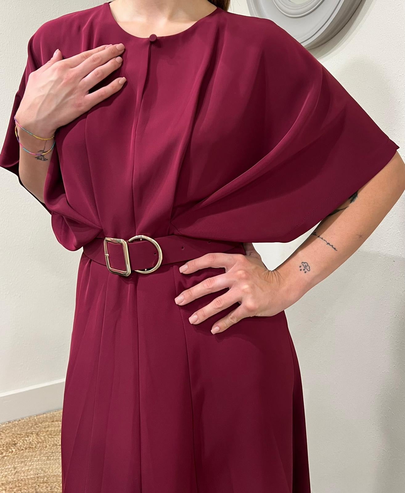 Esplora il nostro abito da donna con drappeggio e manica a pipistrello. La cinta valorizza la silhouette, creando un look elegante e moderno. Ideale per ogni occasione, il capo unisce comfort e stile.