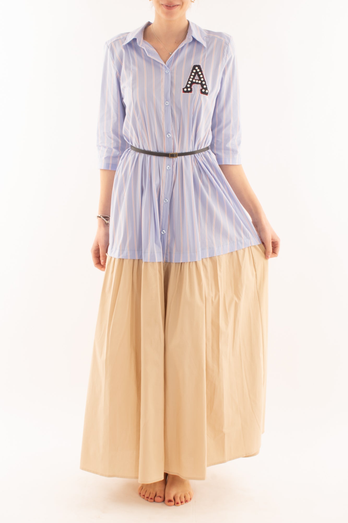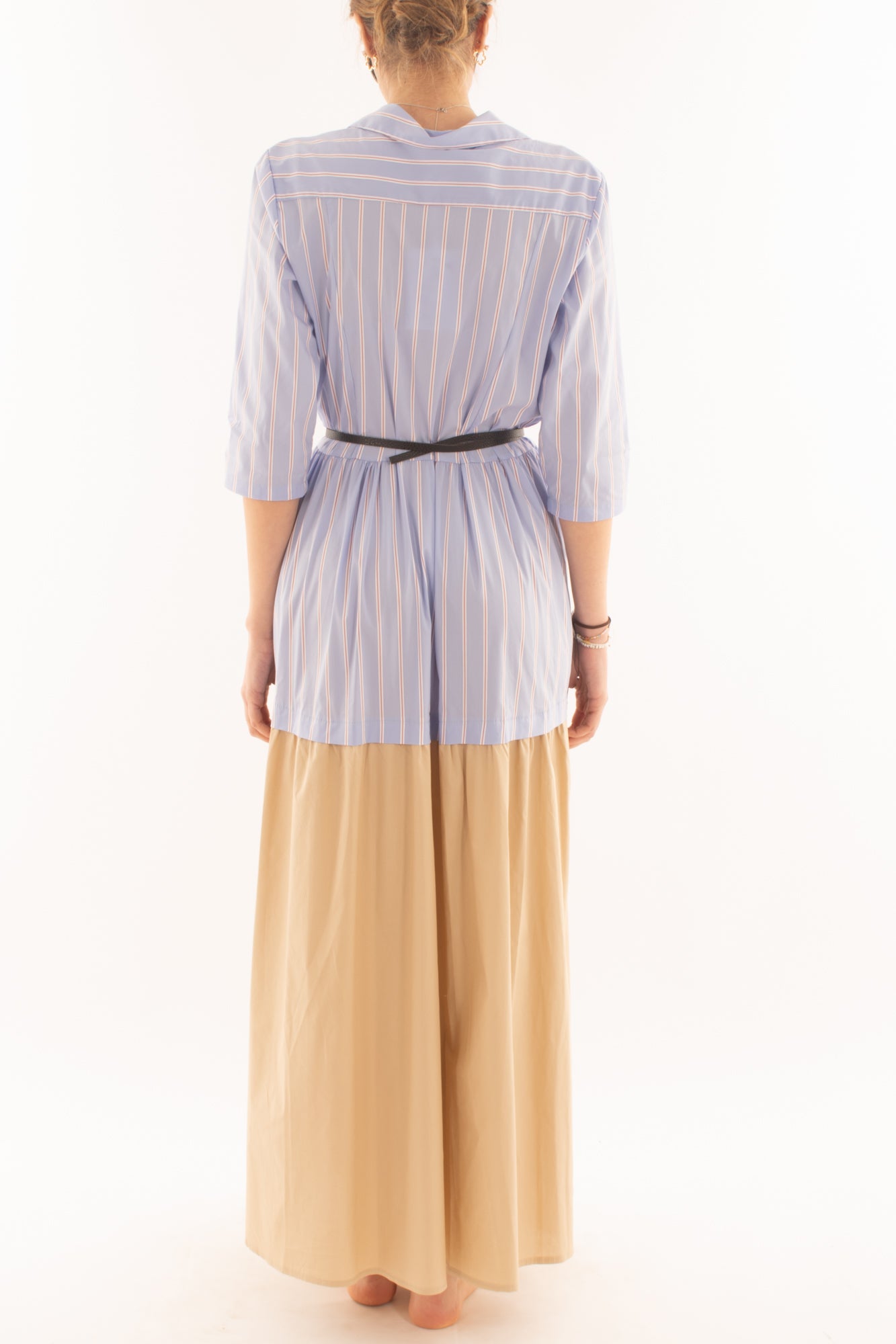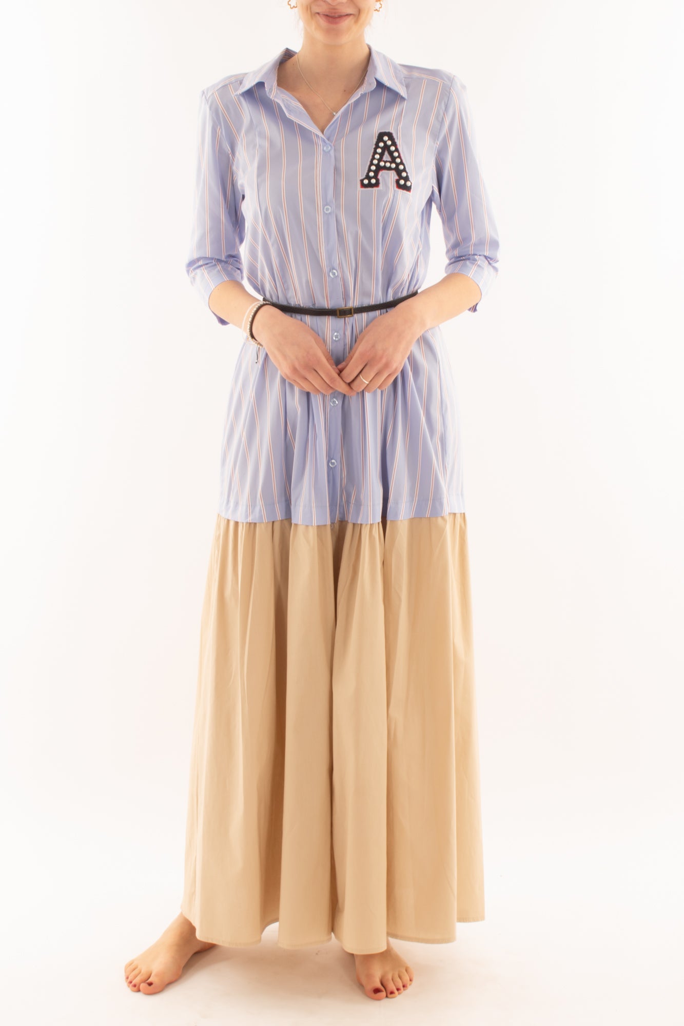 "Scopri l'eleganza senza tempo di questo abito lungo chemisier con maniche 3/4. Con un design distintivo di righe verticali nella parte superiore e un colore solido nella parte inferiore, questo abito unisce stile e comfort in un'unica creazione."