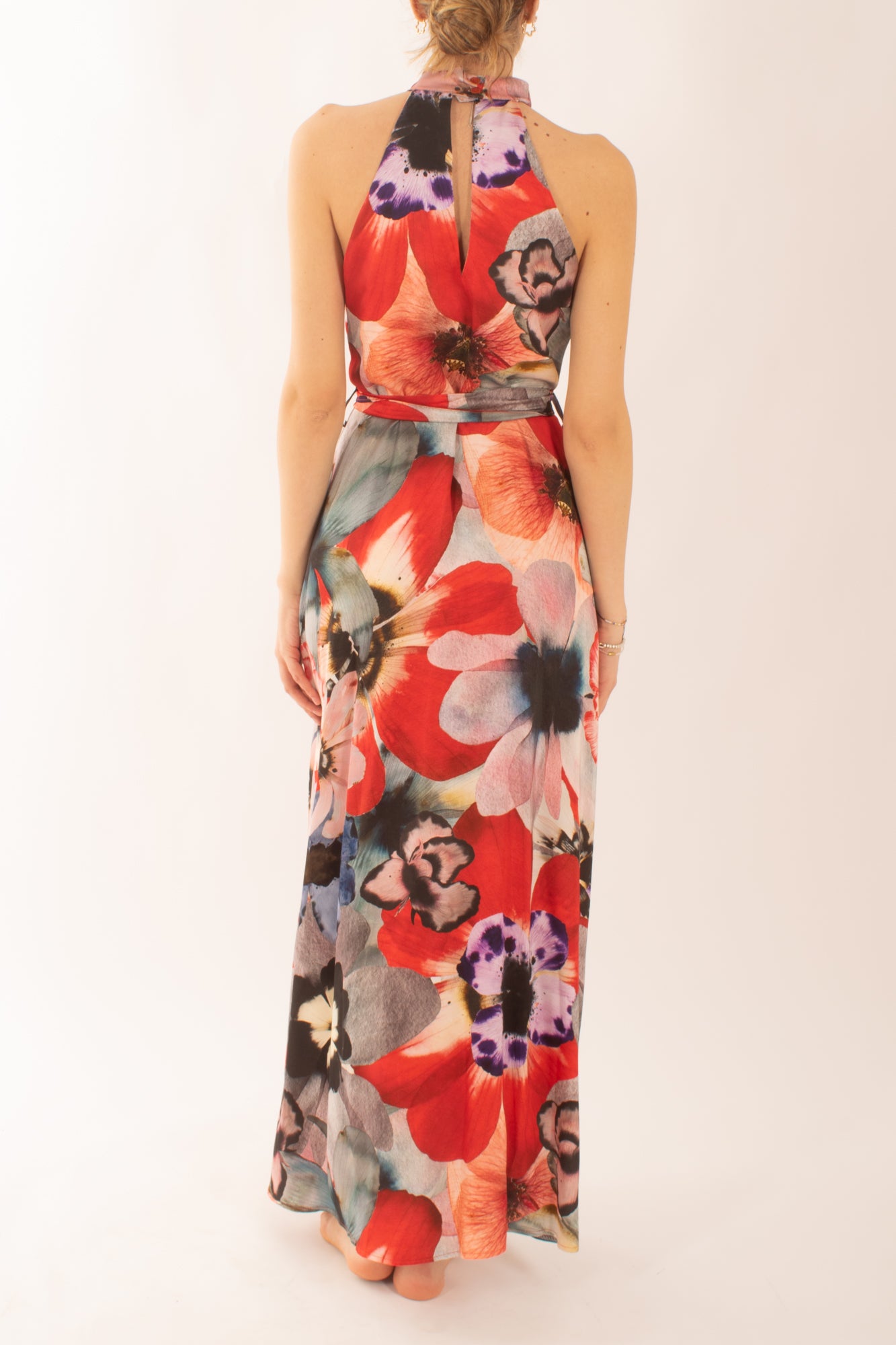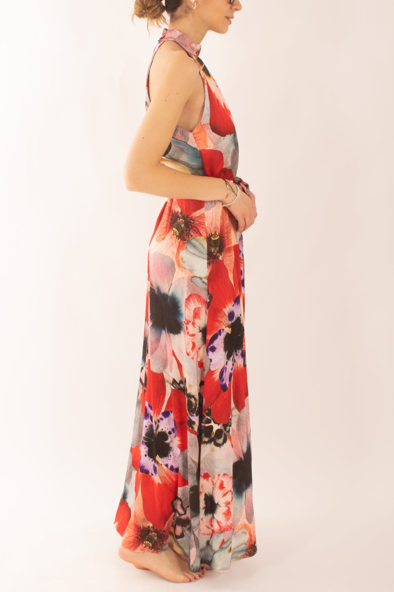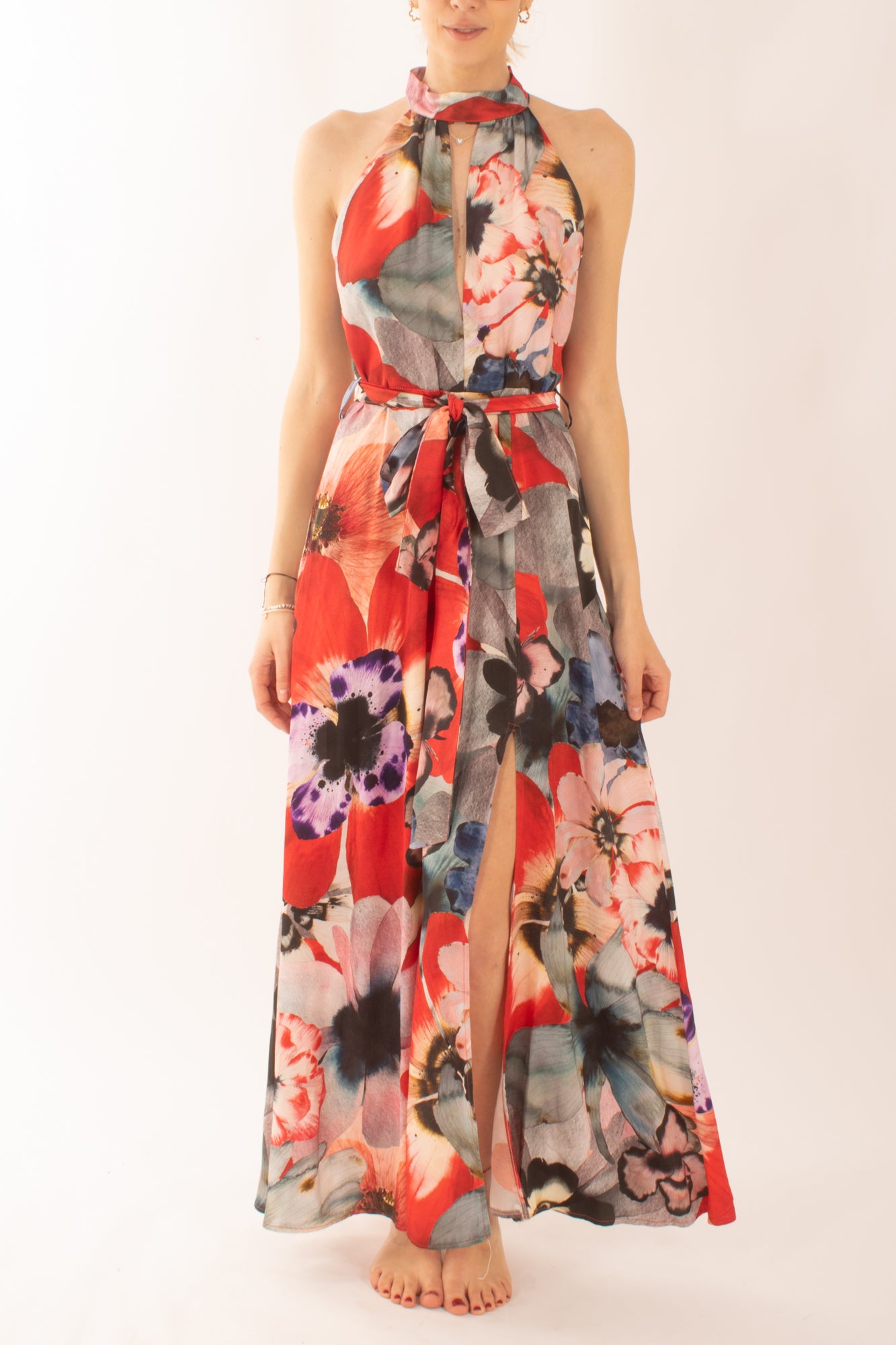 Elegante abito lungo fantasia in morbida viscosa, perfetto per ogni occasione. Allacciato al collo, esalta la figura con un tocco di raffinatezza. Il design unico e i dettagli curati rendono questo capo un must-have per il tuo guardaroba estivo.