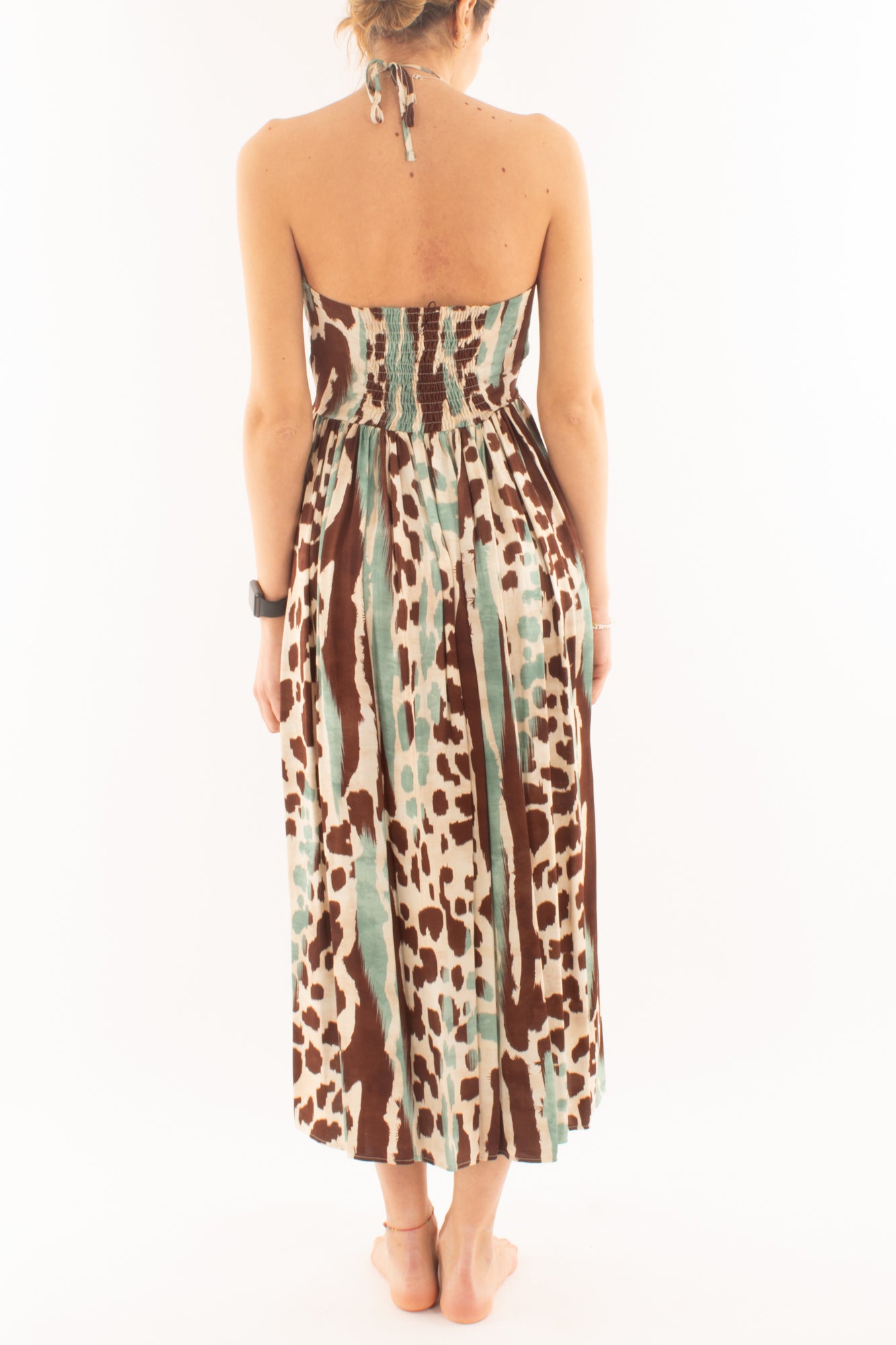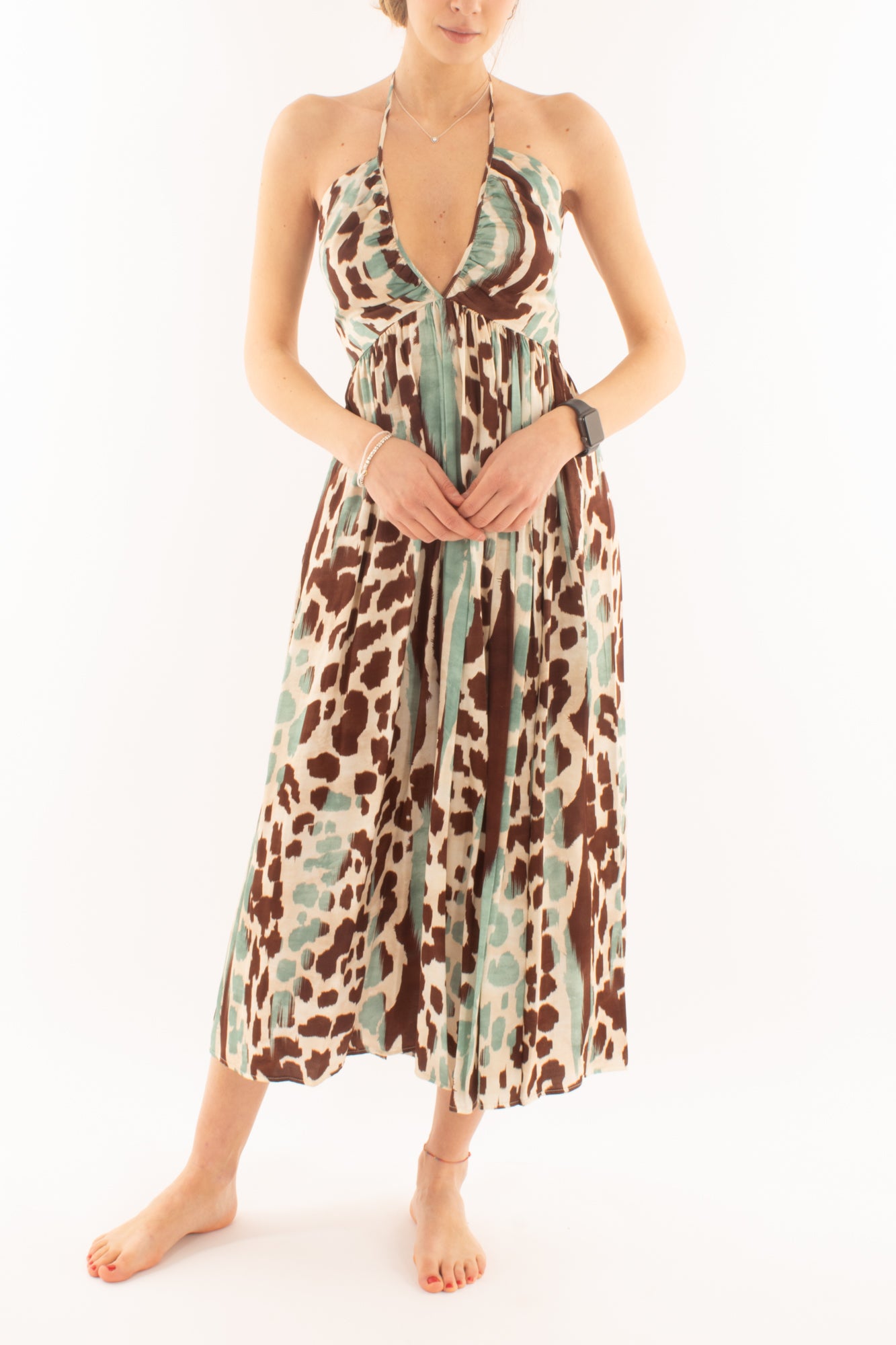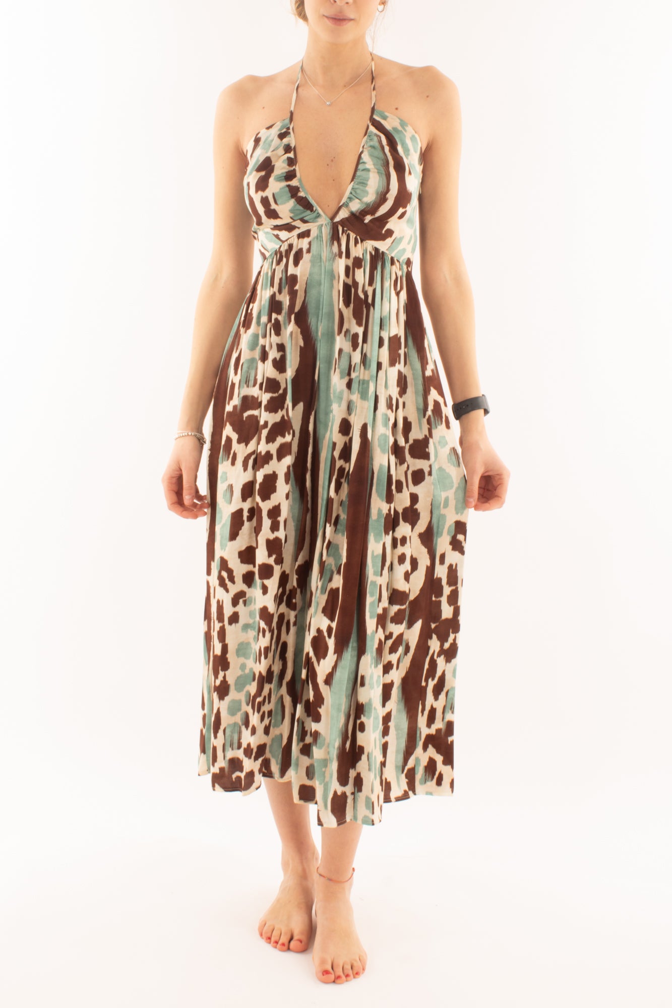 Scopri l'eleganza senza tempo con il nostro abito lungo a fantasia, caratterizzato da una seducente allacciatura sul collo. Scegli il tuo stile unico e lasciati avvolgere dalla grazia di questo capo versatile e sofisticato.