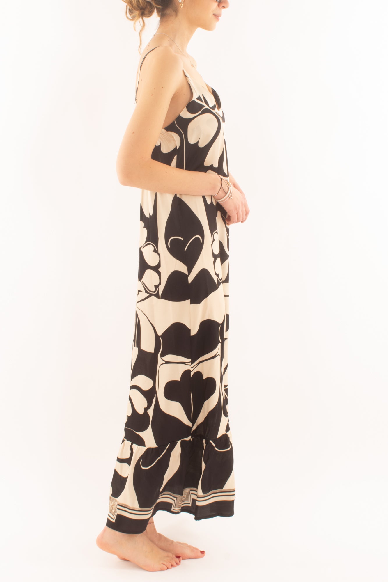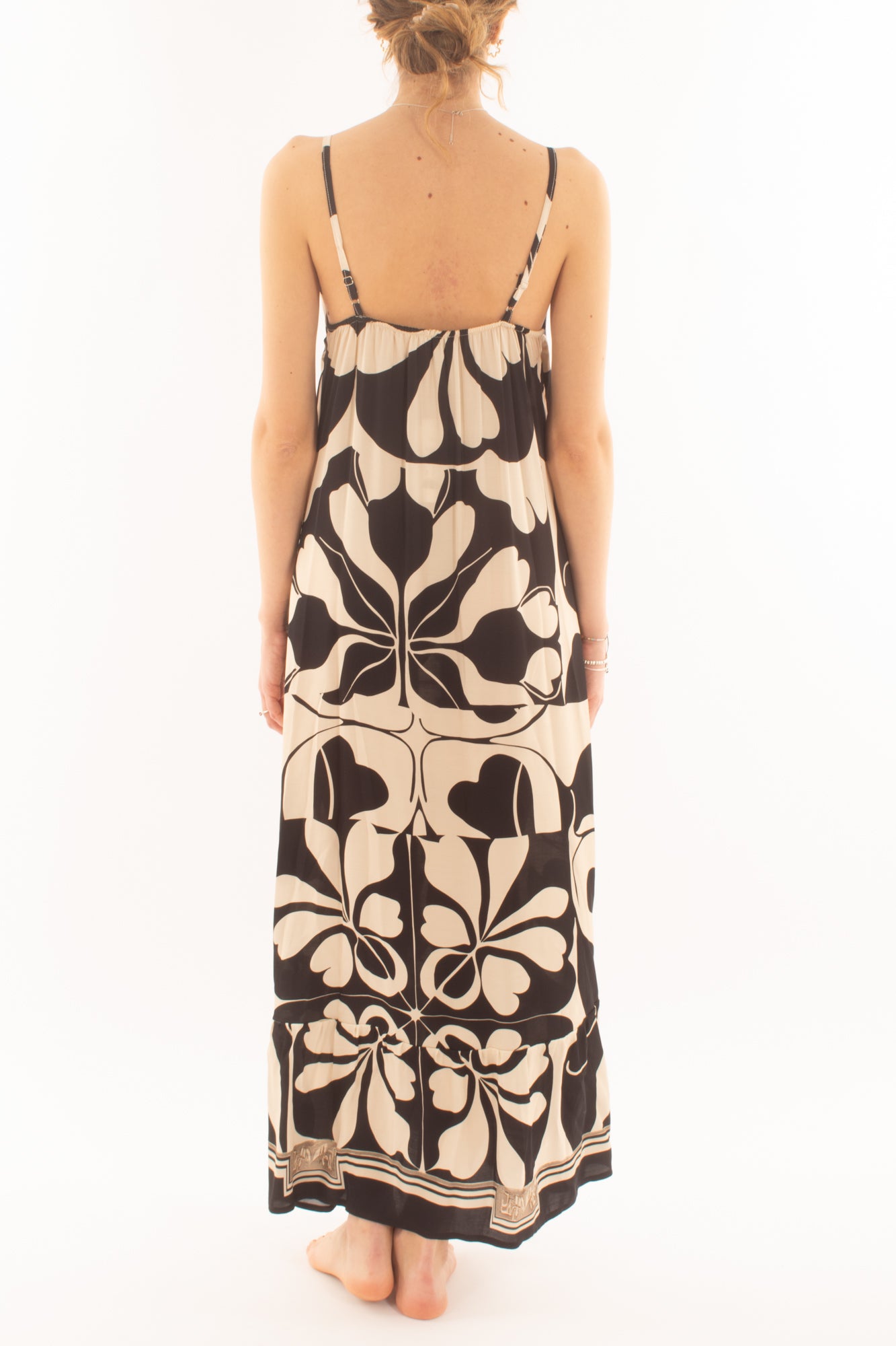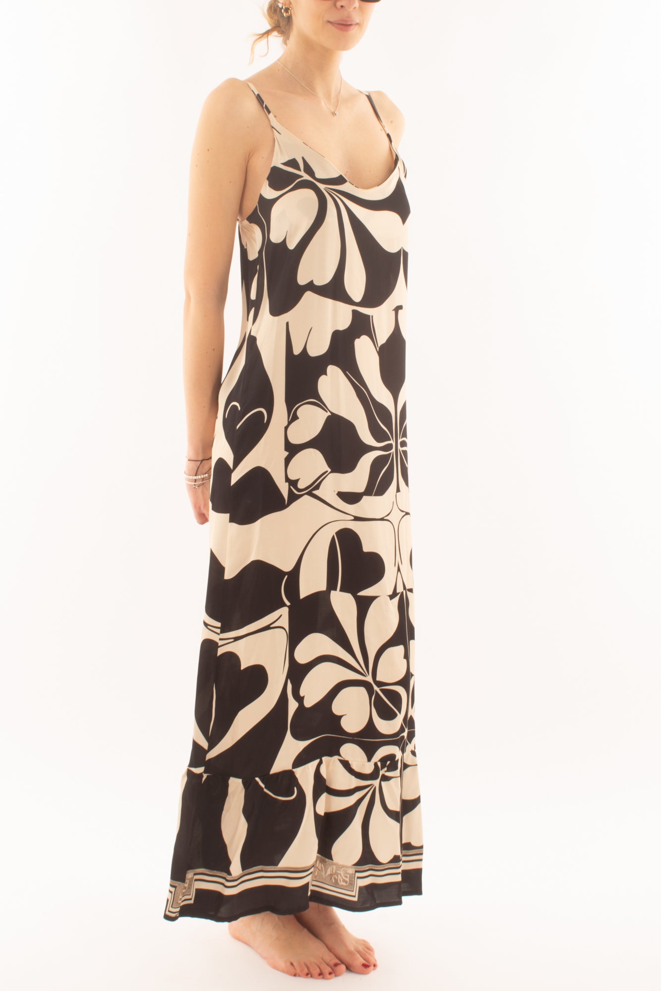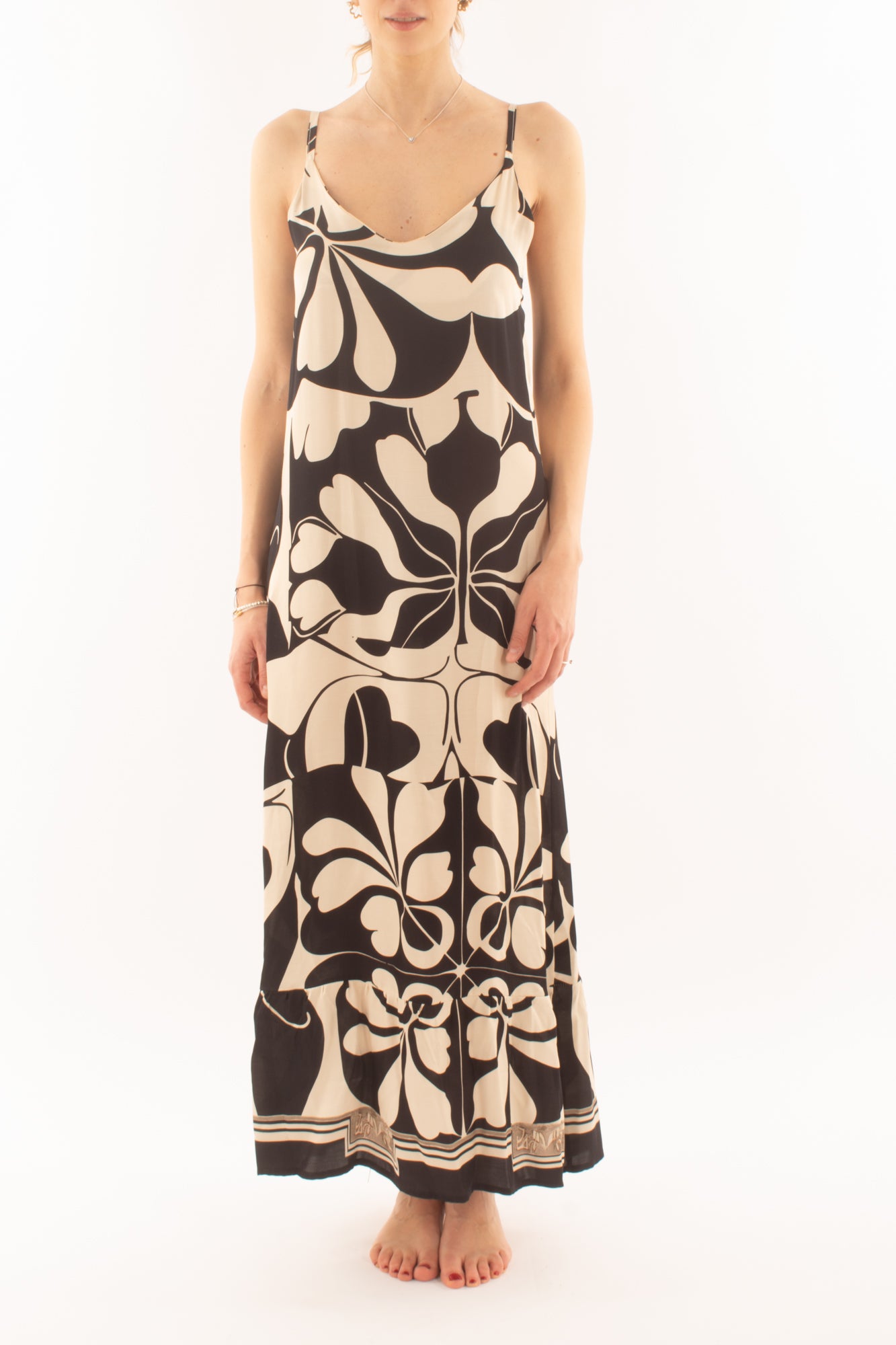 "Esalta la tua femminilità con l'abito lungo a bretellina in viscosa, un'esplosione di stile e comfort. Perfetto per ogni occasione, questo capo unico aggiunge un tocco di vivacità al tuo guardaroba primaverile