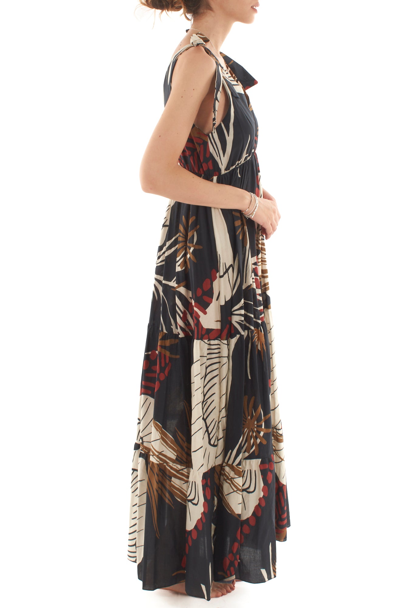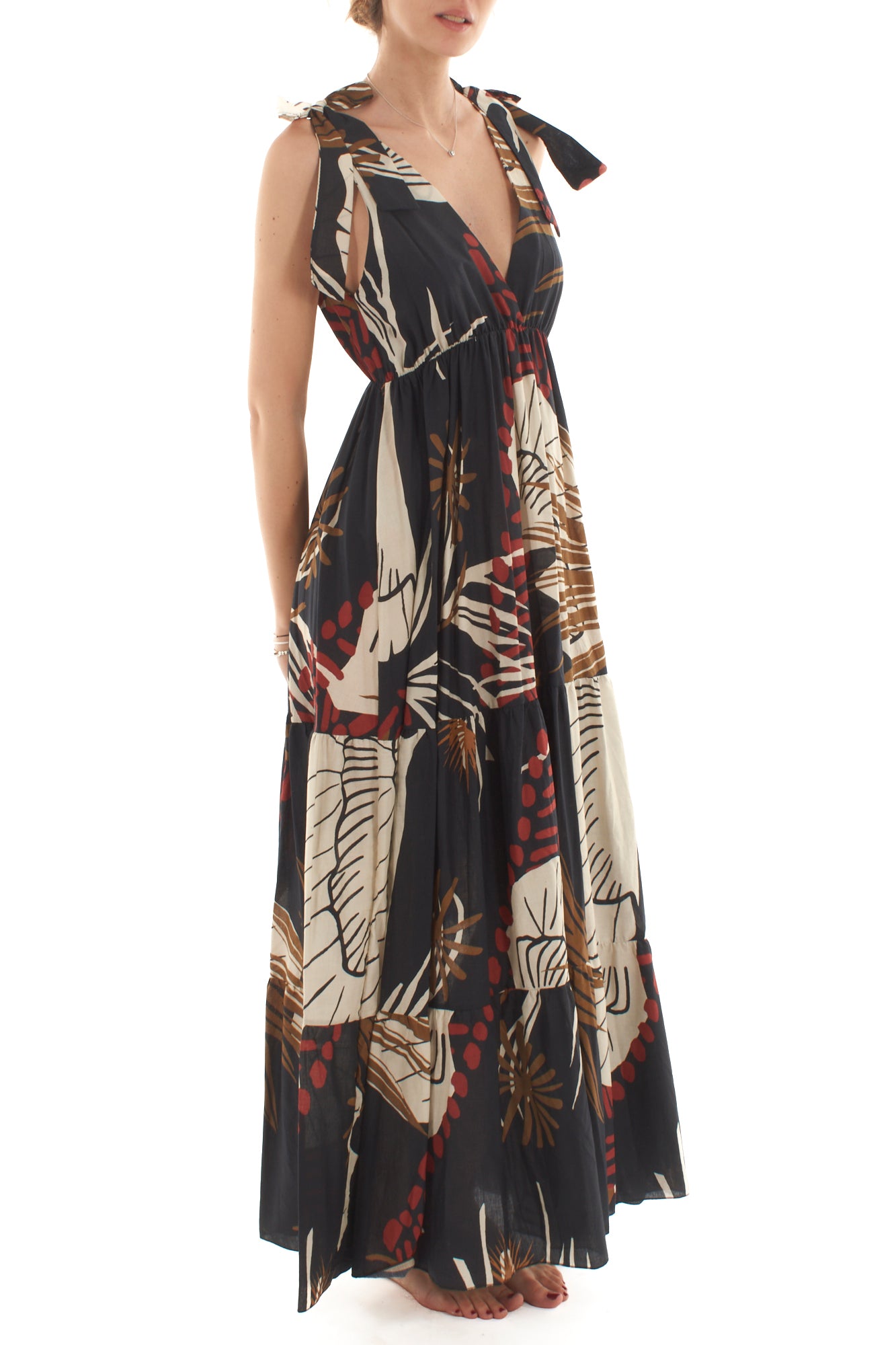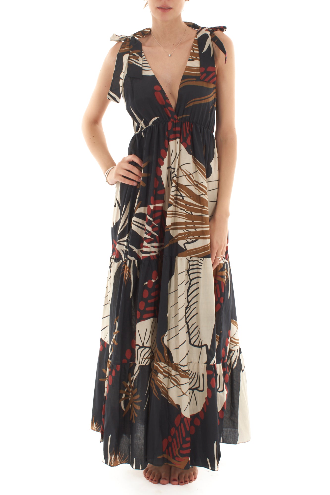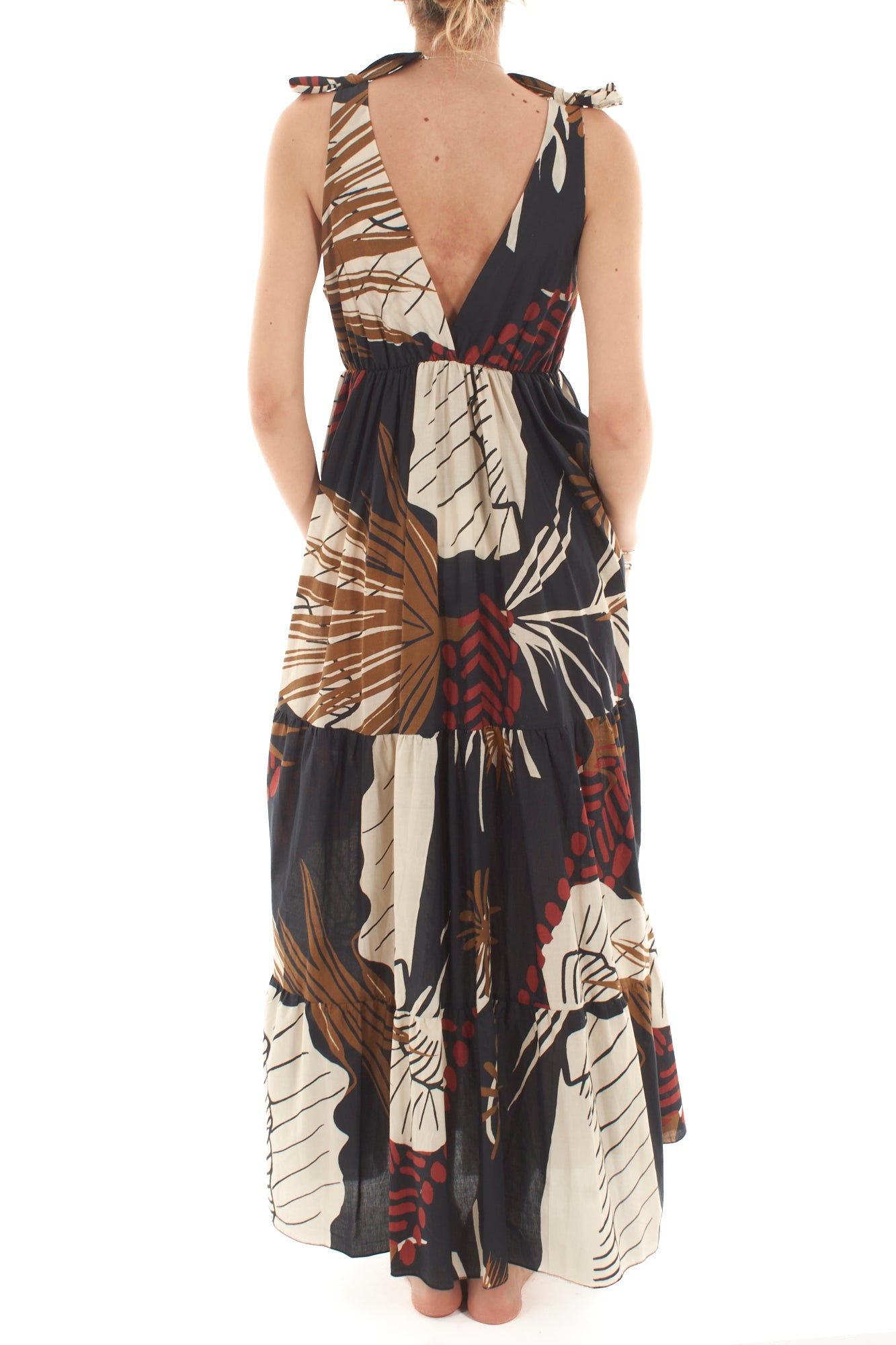 Abito lungo a fantasia con scollatura a V doppia e manica a 3/4, perfetto per un look elegante e sofisticato. La scollatura a V aggiunge un tocco sensuale, mentre la lunghezza e le maniche 3/4 garantiscono comfort e stile. Ideale per eventi speciali o serate chic.