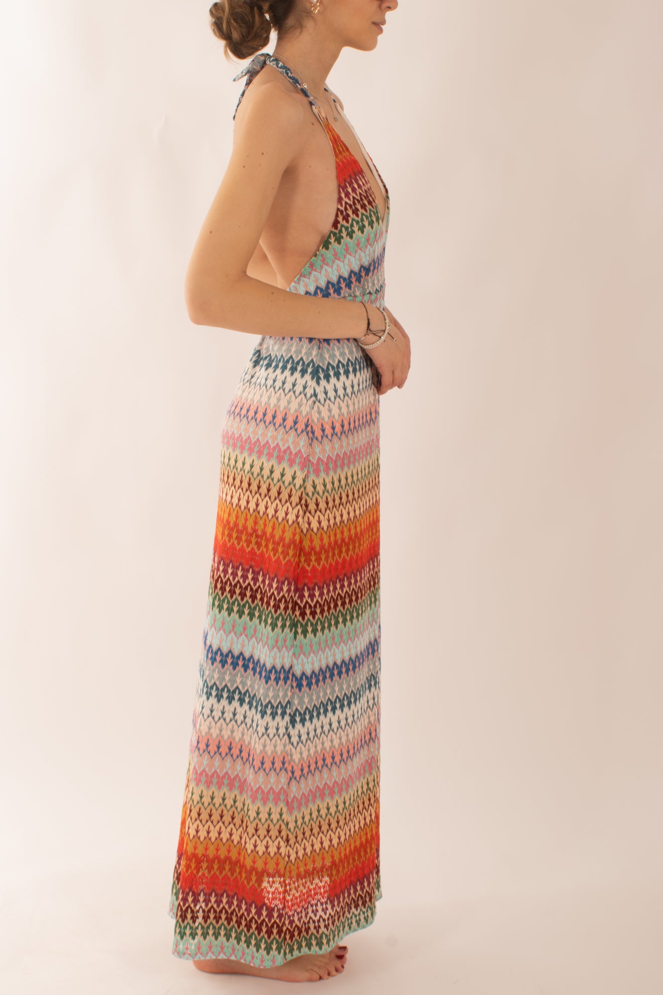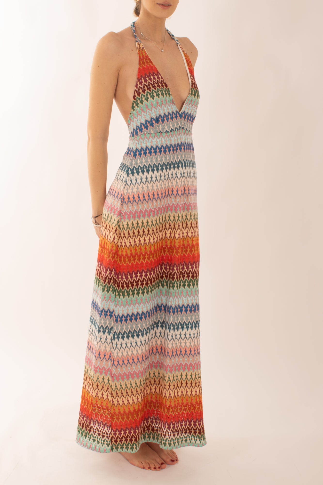 Abito lungo fantasia stile Missoni, con schiena scoperta e allacciatura al collo. Elegante e raffinato, perfetto per serate estive e occasioni speciali. Il design unico e i motivi vivaci catturano l'essenza dello stile italiano, rendendoti protagonista di ogni evento.