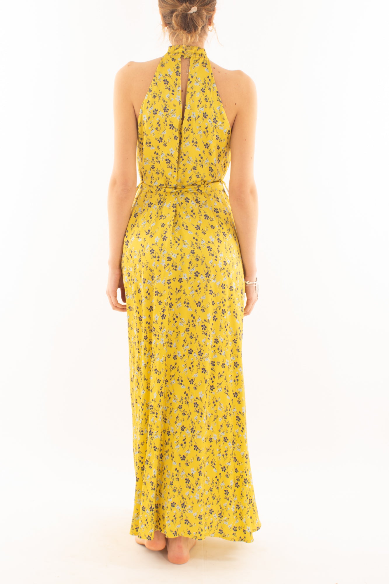 "Esalta la tua femminilità con l'abito lungo floreale allacciato al collo: uno stile senza tempo con un tocco di eleganza primaverile. Smanicato e con uno spacco seducente, questo capo aggiunge un tocco di freschezza al tuo guardaroba estivo.