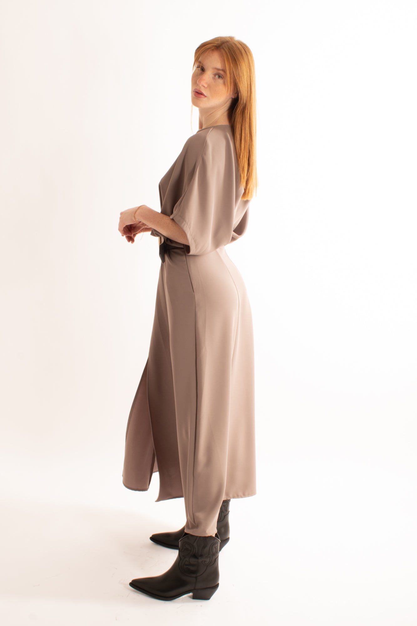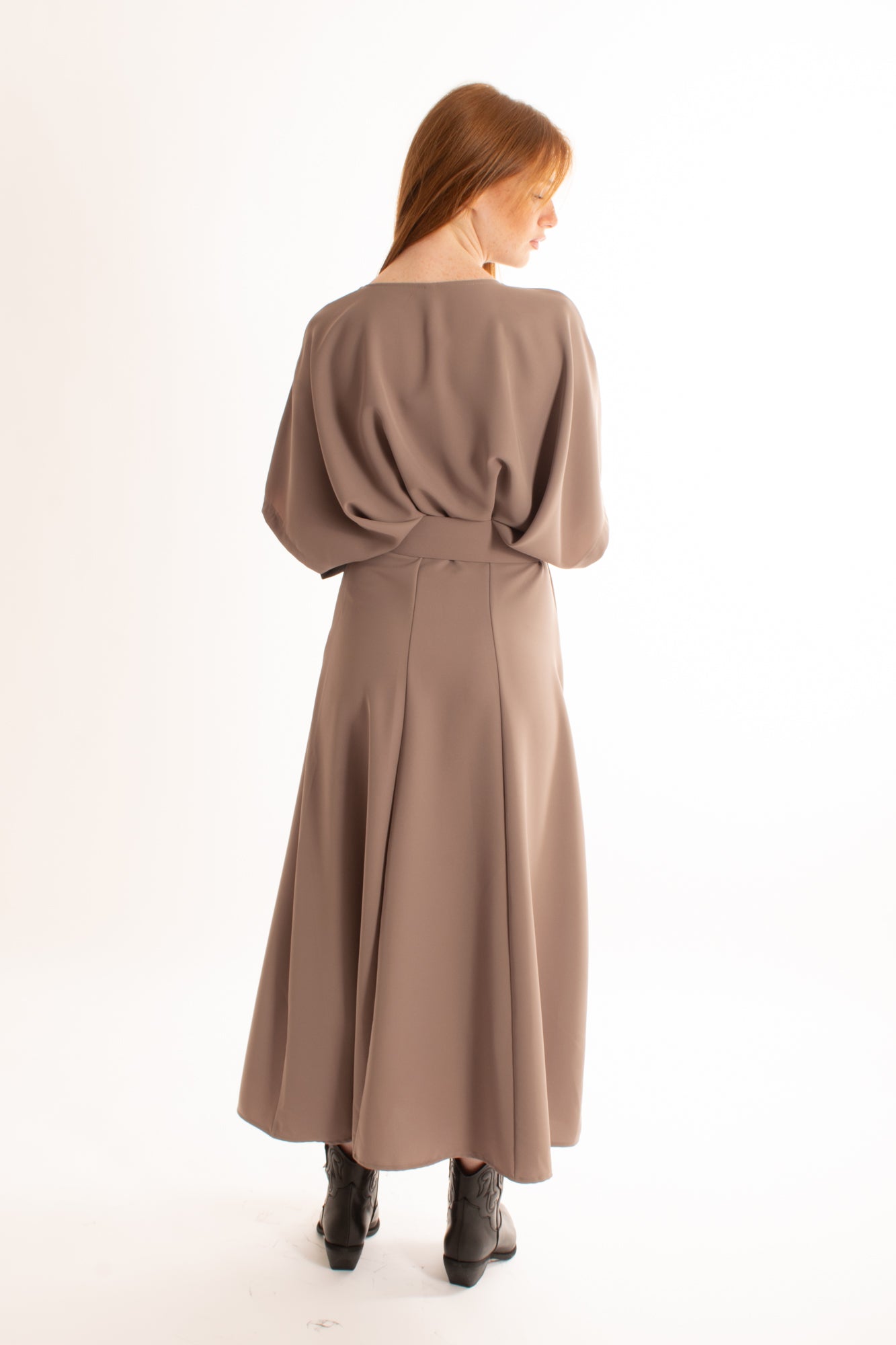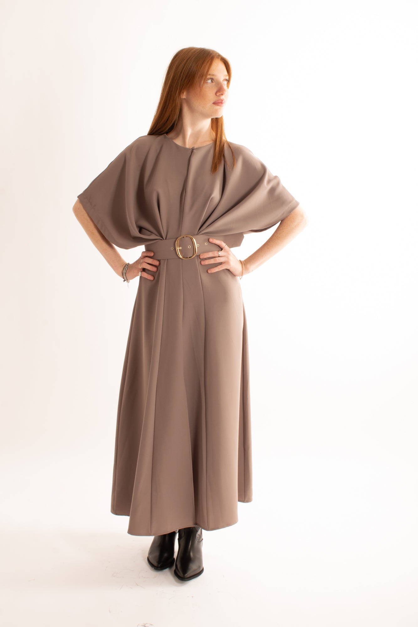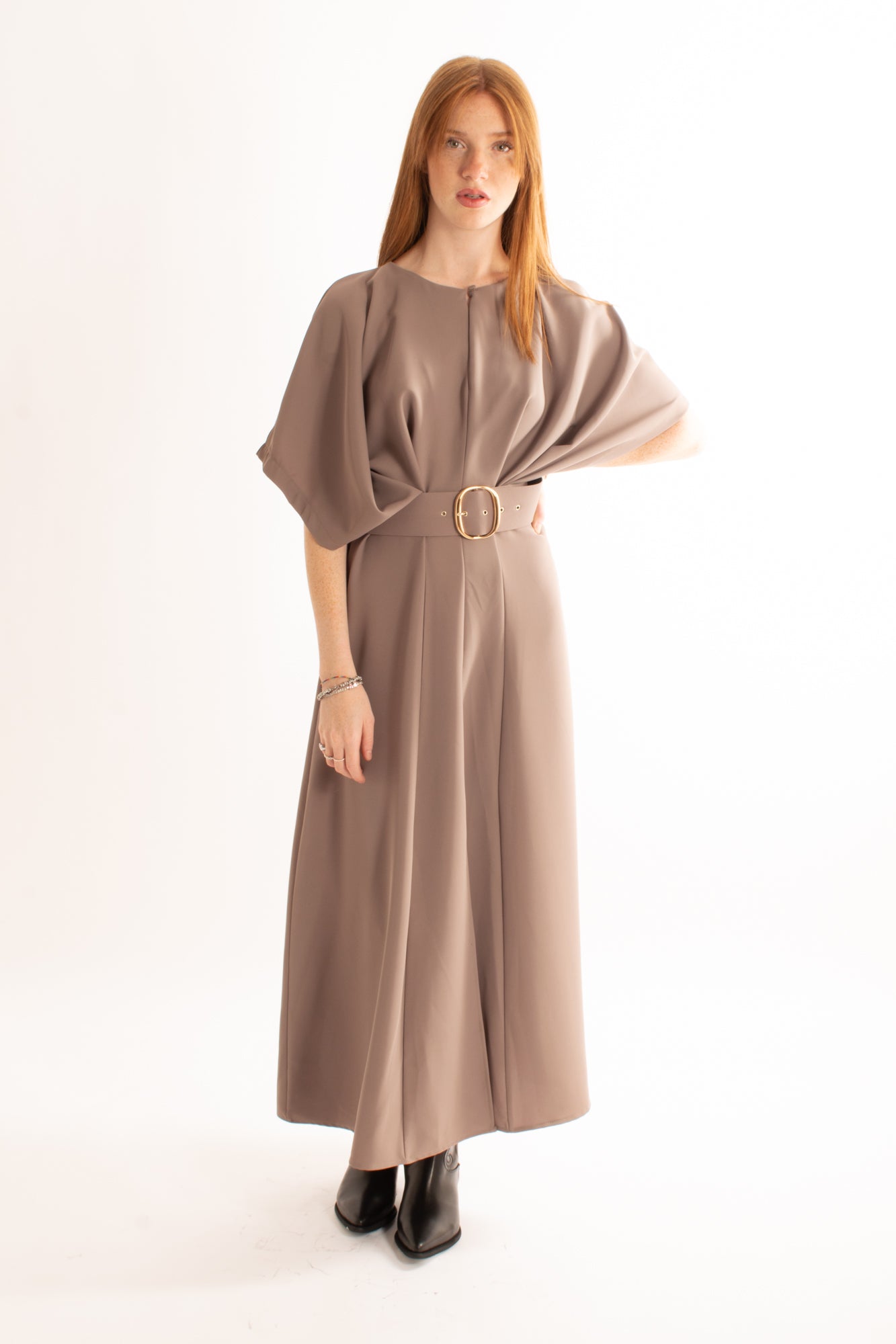 Abito lungo girocollo con arricciatura e manica corta molto ampia, veste regolare.