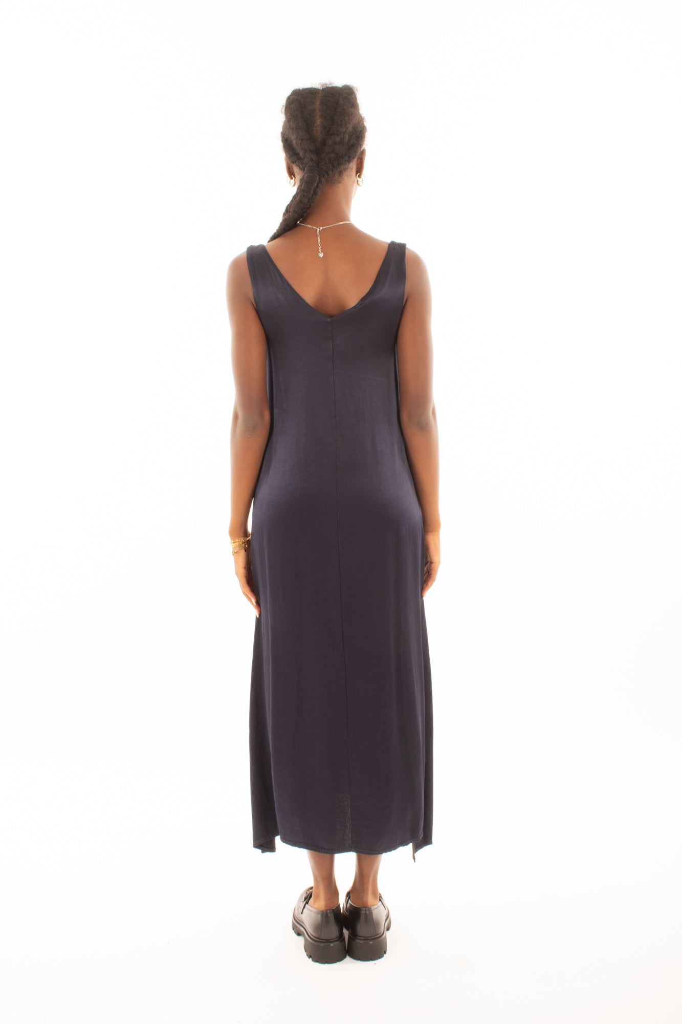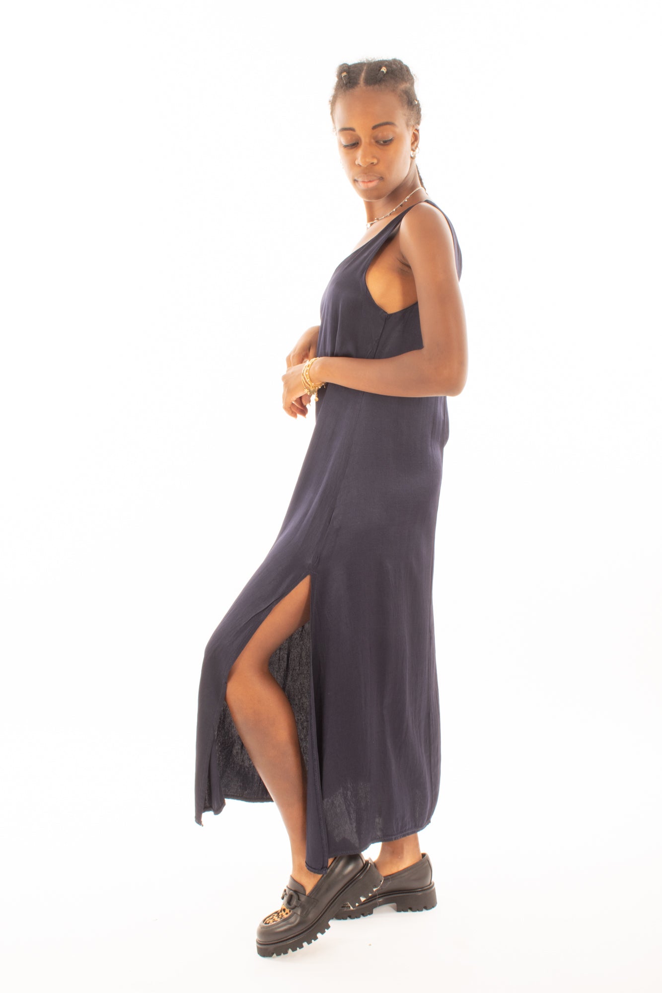 Immergiti nell'eleganza senza tempo con il nostro Abito Lungo in Viscosa Miamata - Blu. Questo capo pregiato, composto al 55% da viscosa e al 45% da rayon, abbraccia il tuo stile con un taglio a V lungo e raffinati spacchi laterali che creano una silhouette delicata e affascinante.