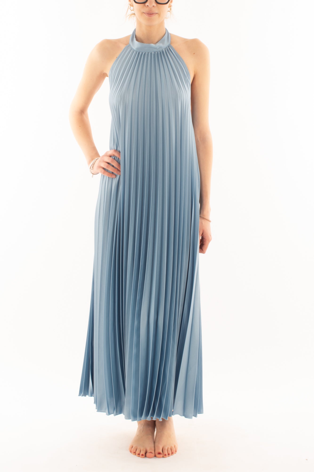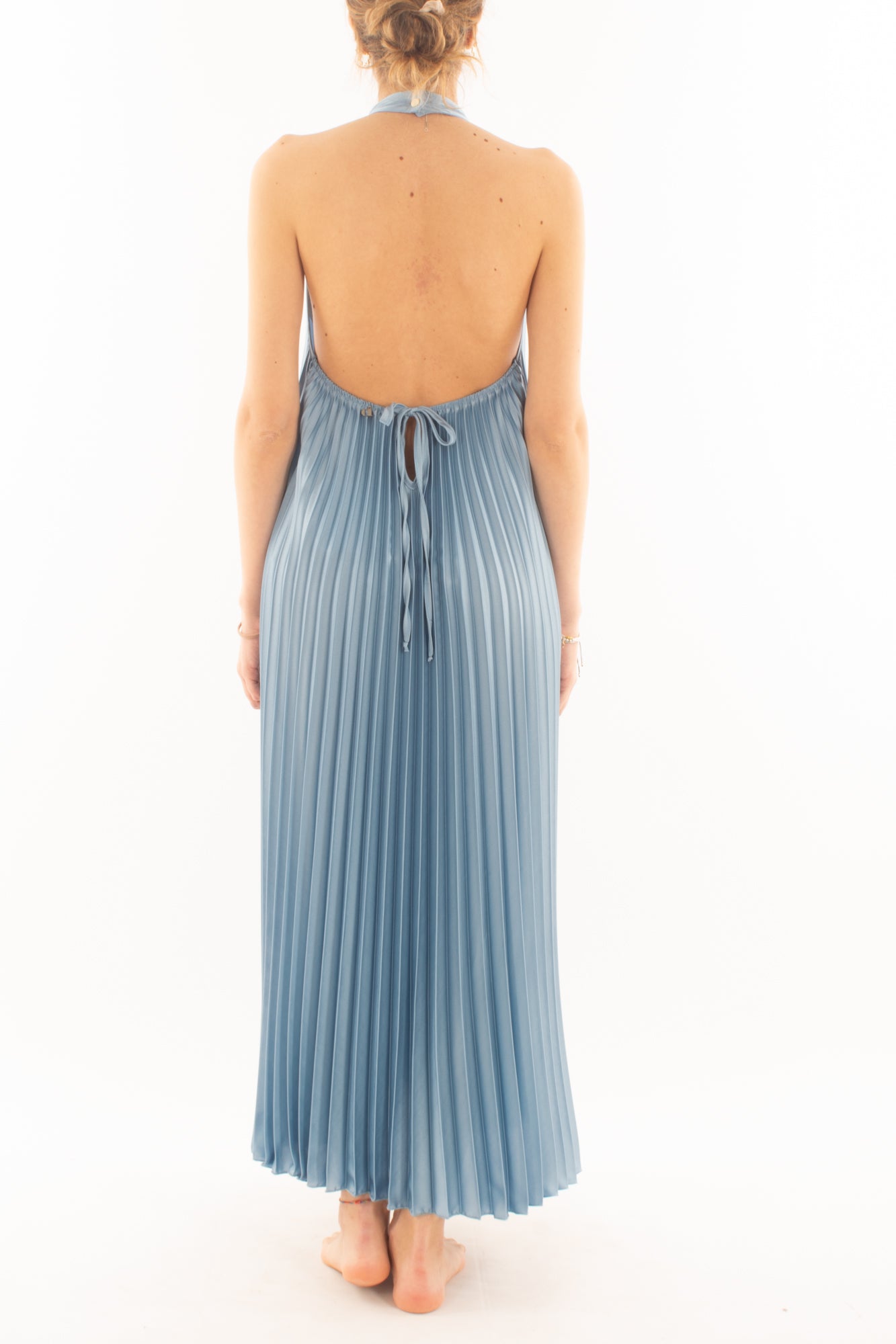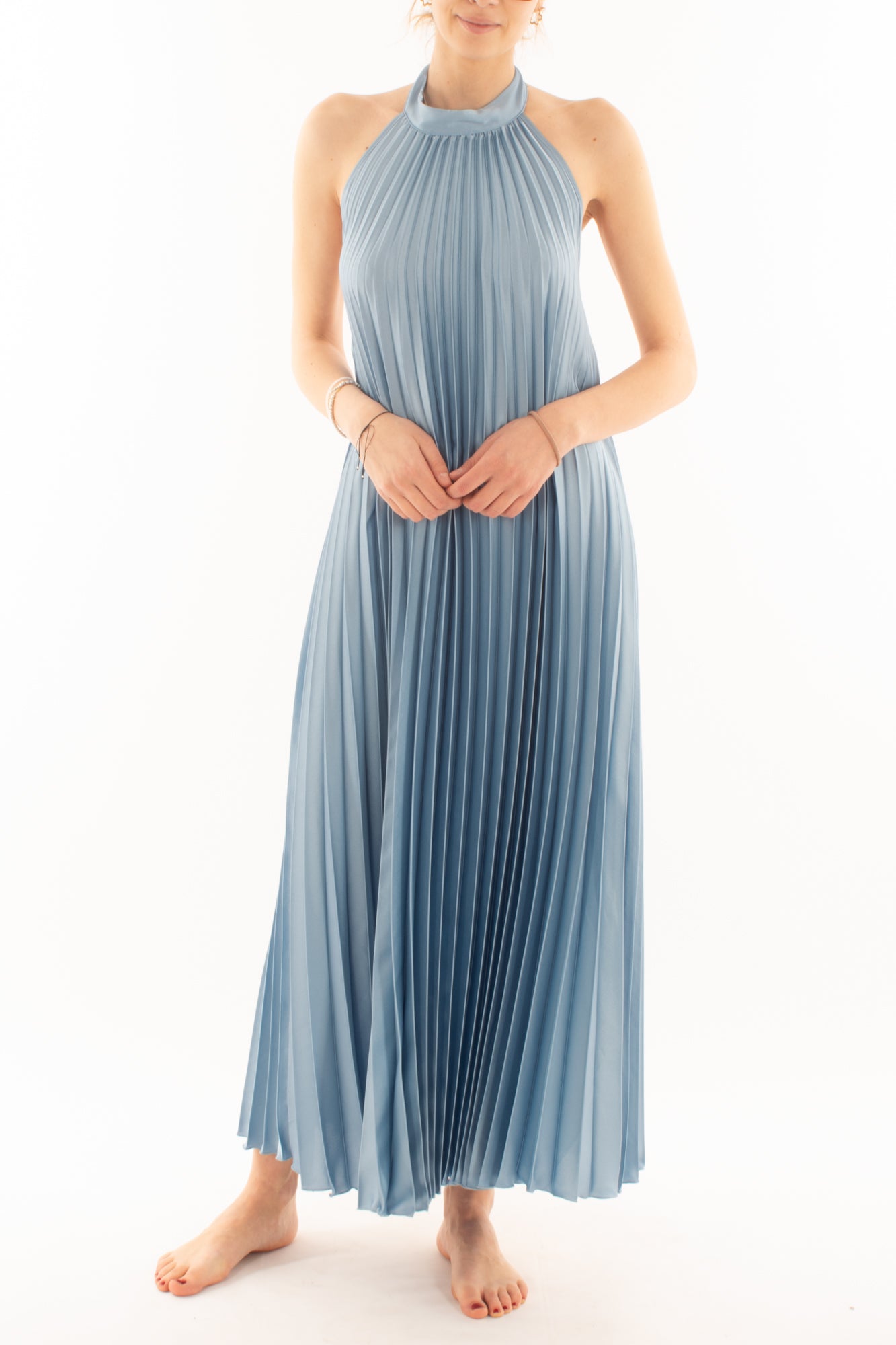 "Scopri l'eleganza senza tempo con il nostro abito lungo plissé. Realizzato con cura, il design allacciato al collo e la schiena scoperta aggiungono un tocco di glamour. Perfetto per ogni occasione speciale."