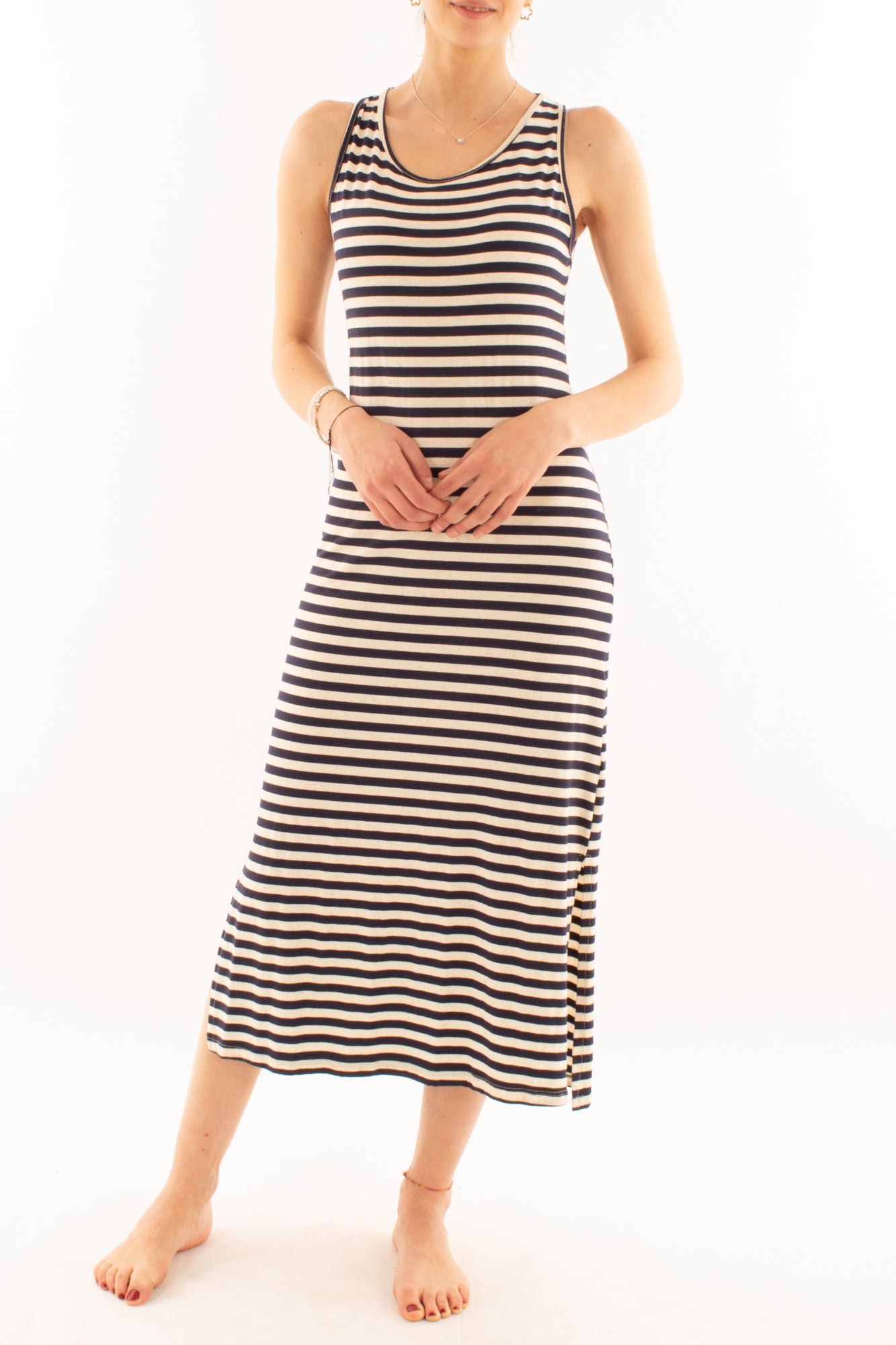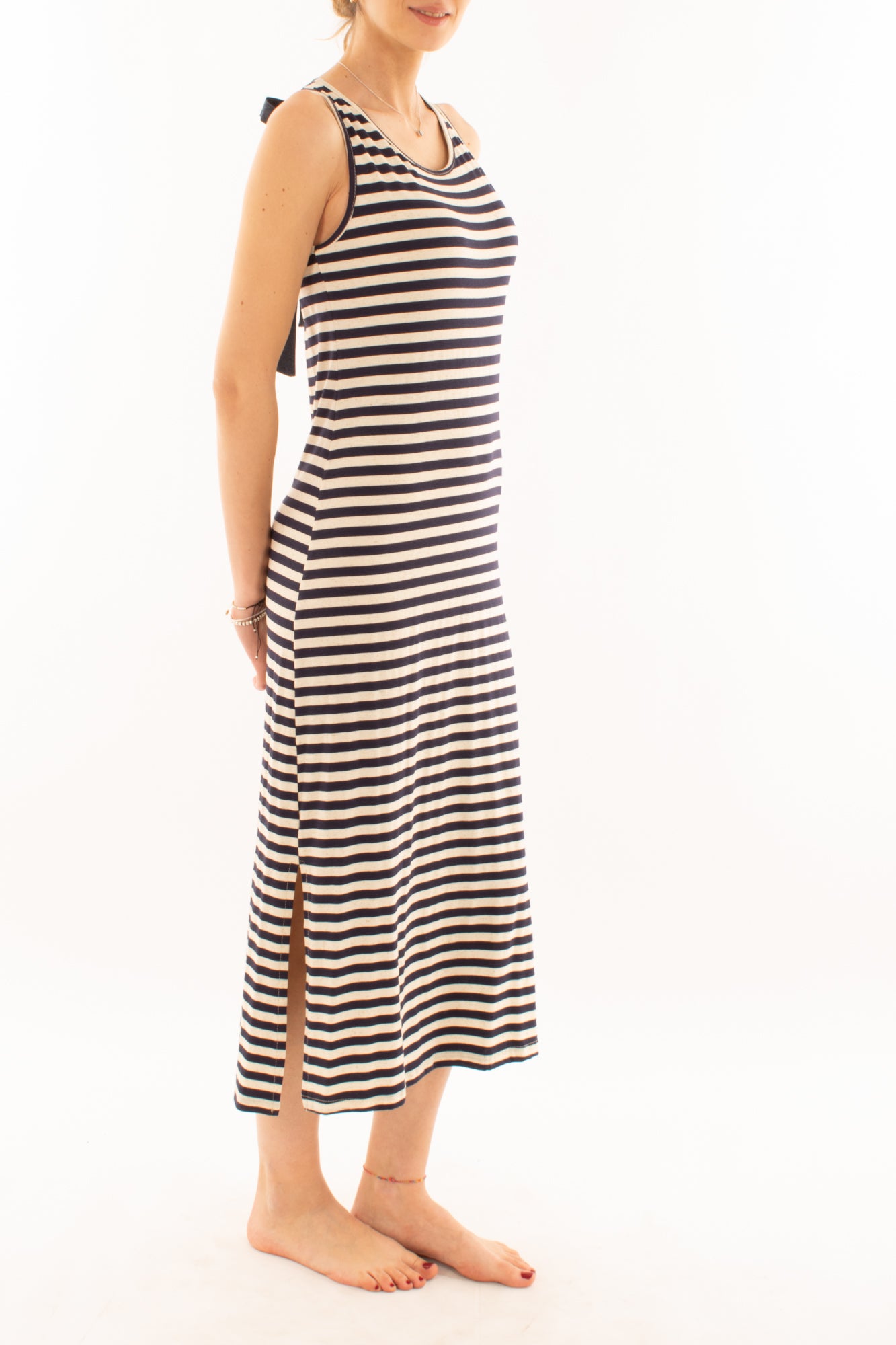Abito lungo rigato con fiocco sulla schiena: eleganza senza tempo per ogni occasione. Le righe verticali slanciano la figura, mentre il fiocco posteriore aggiunge un tocco di raffinatezza. Perfetto per eventi speciali e serate estive, combina stile e comfort in un'unica soluzione.