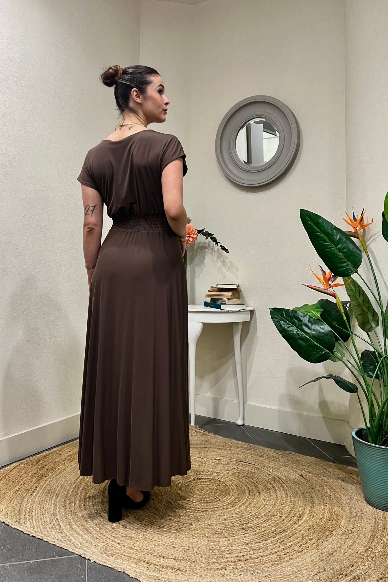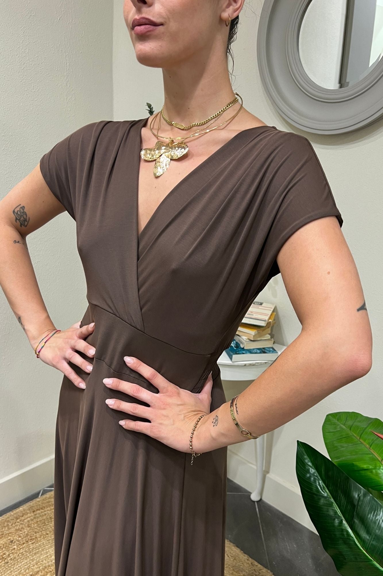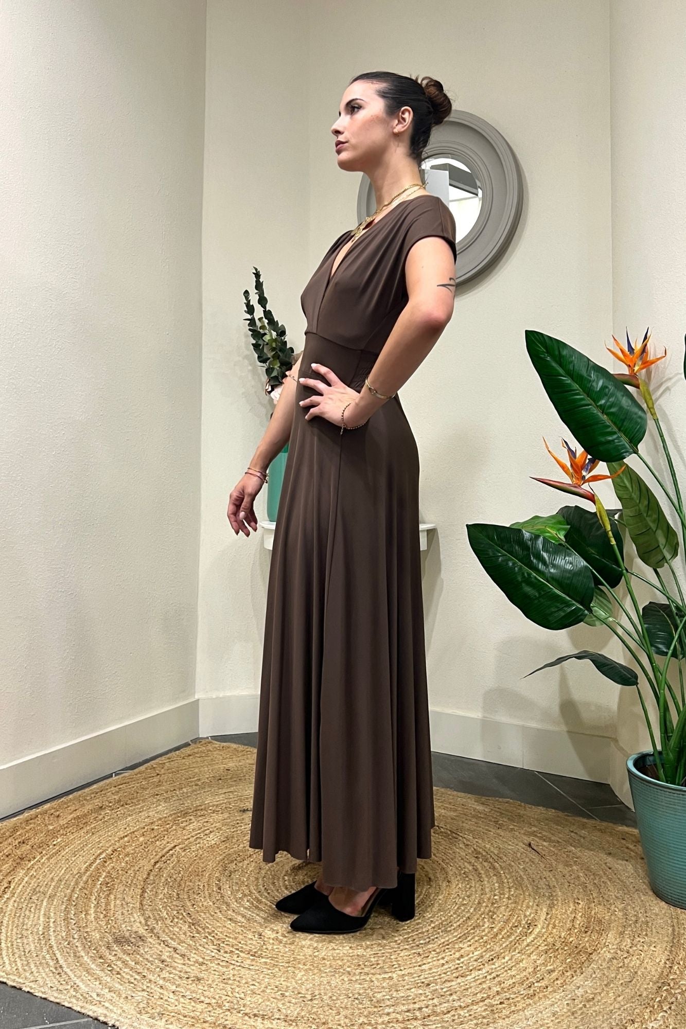 Eleganza e comfort si incontrano. Scopri il nostro abito lungo con scollo a V in un prezioso tessuto: 65% modal, 30% poliammide e 5% elastan. Un capo versatile e avvolgente per uno stile impeccabile.