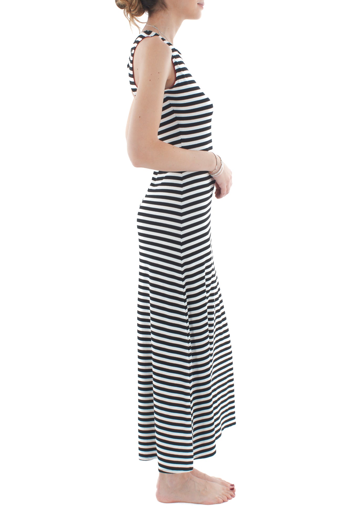 Abito lungo smanicato rigato con schiena scoperta. Design elegante e moderno, perfetto per le serate estive. La silhouette fluida e le righe verticali valorizzano la figura, mentre la schiena scoperta aggiunge un tocco di sensualità. Tessuto leggero e traspirante per un comfort ideale.