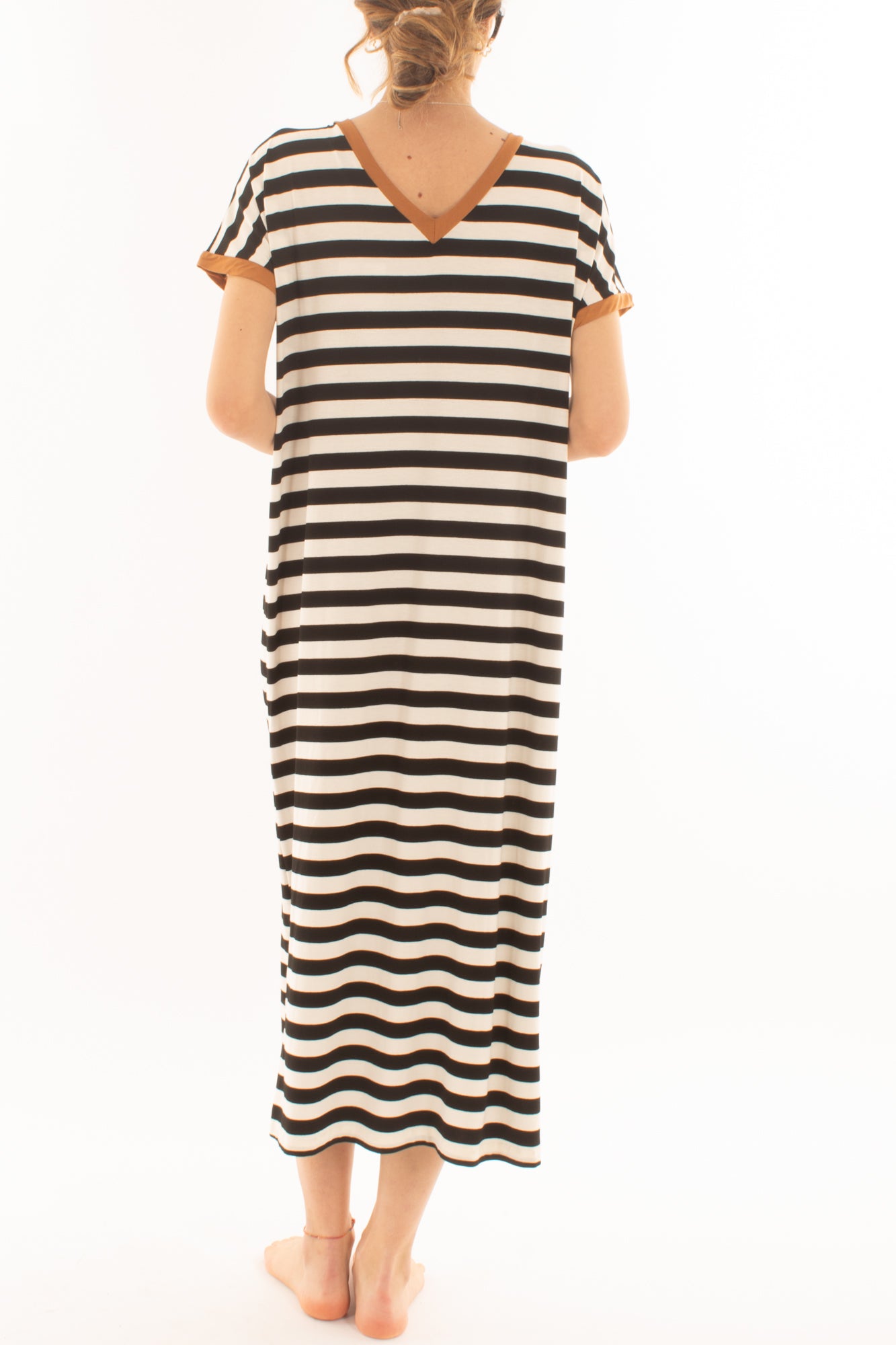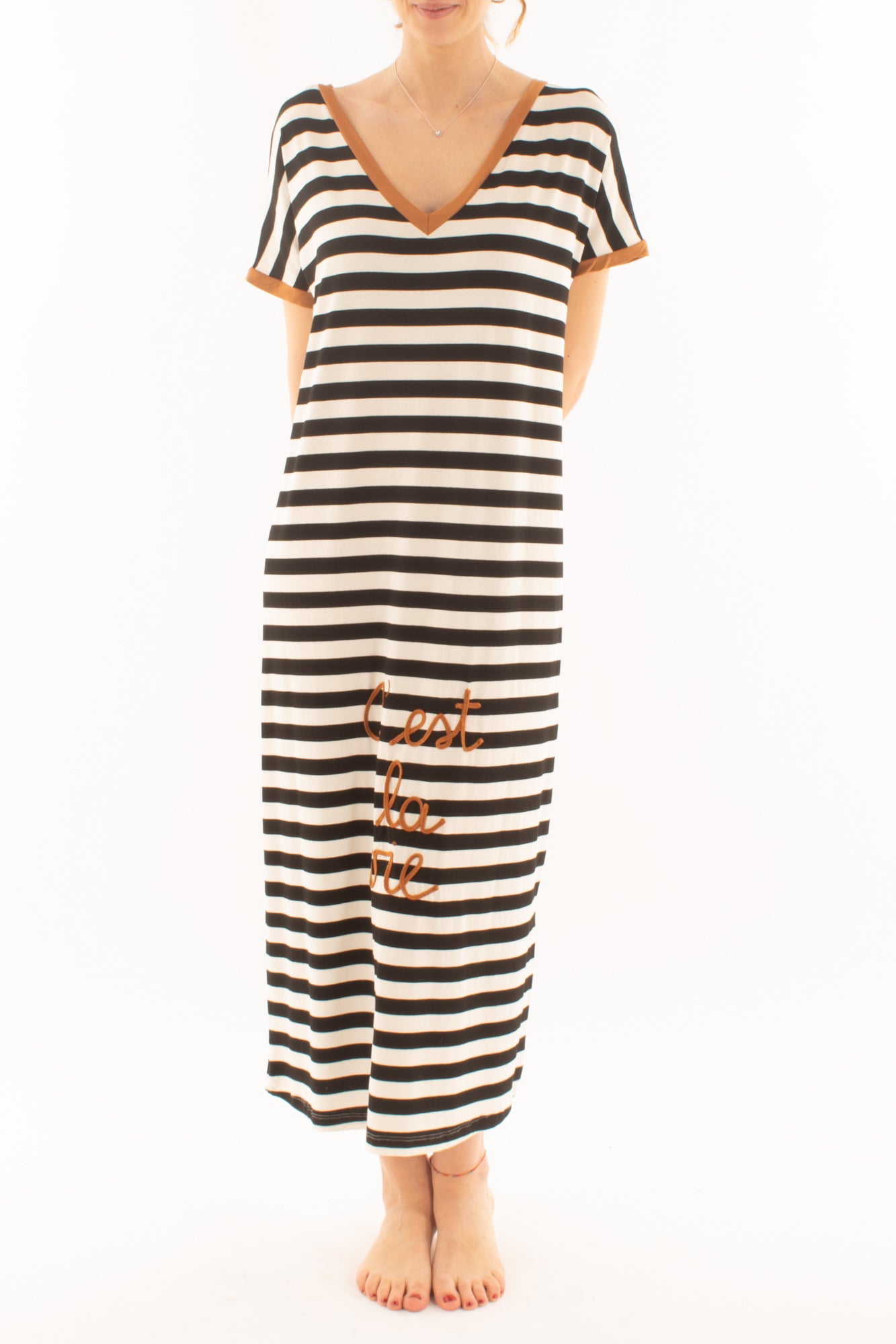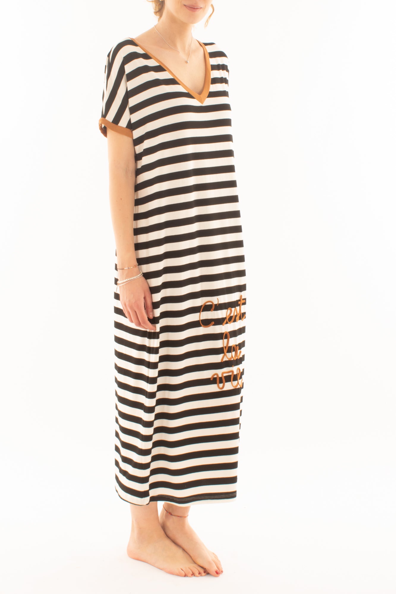 Scopri il nostro elegante abito lungo rigato con scritta, perfetto per un look sofisticato e moderno. Realizzato con tessuti di alta qualità, garantisce comfort e stile in ogni occasione. Ideale per eventi speciali o per un tocco chic nella vita quotidiana.