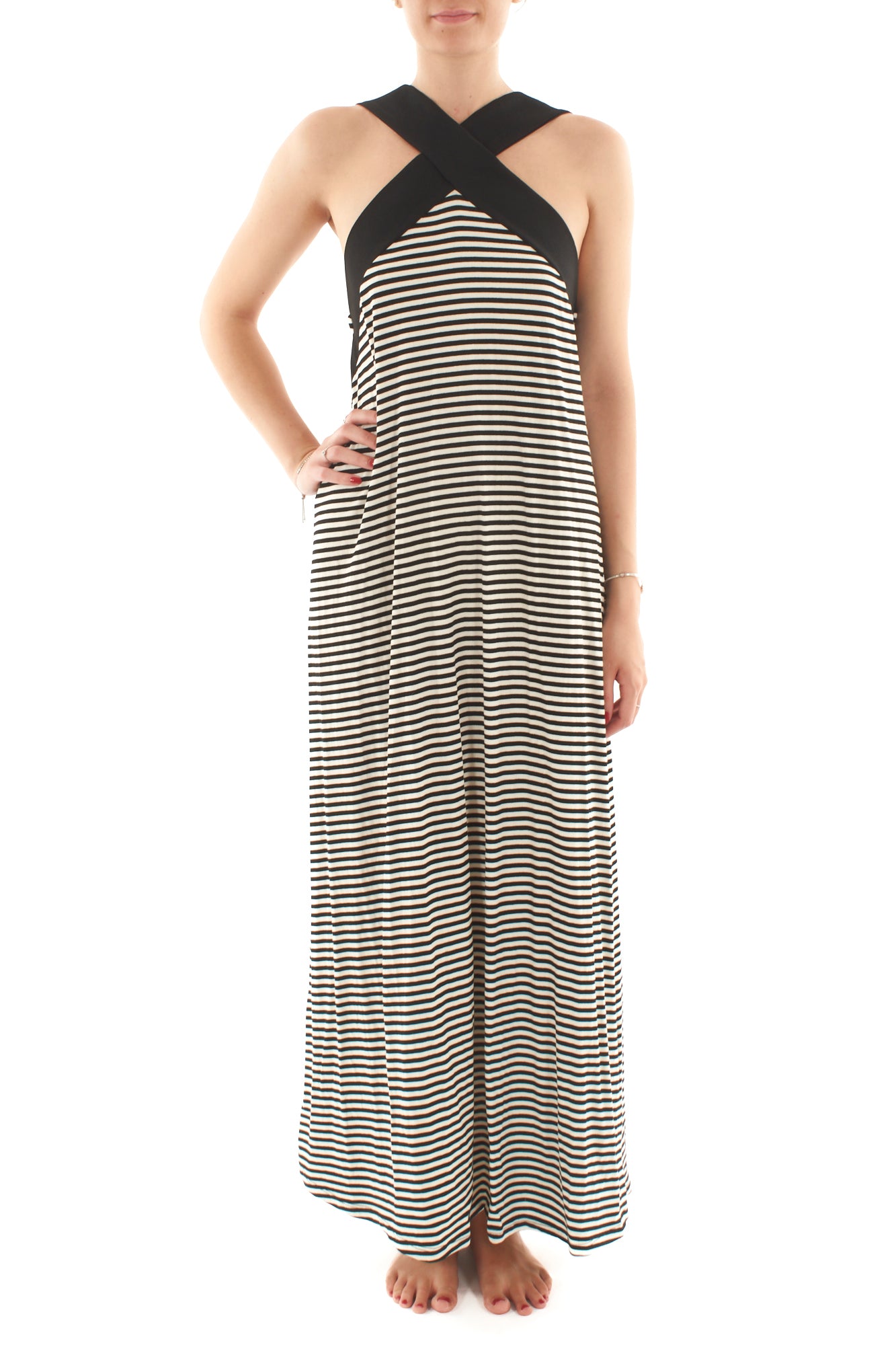 Ecco una descrizione SEO per un abito lungo rigato intrecciato al collo, mantenendo il limite di 300 caratteri: