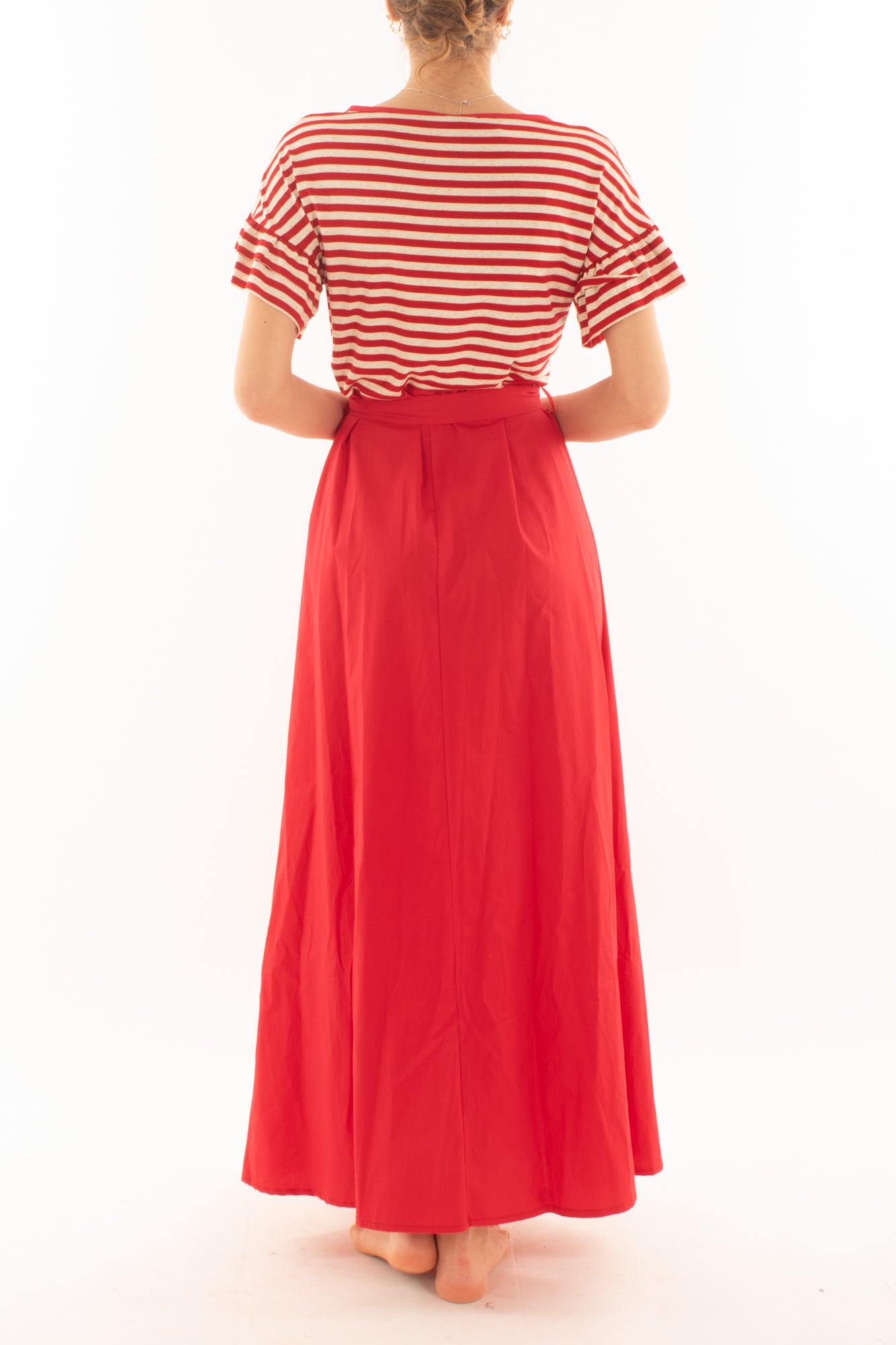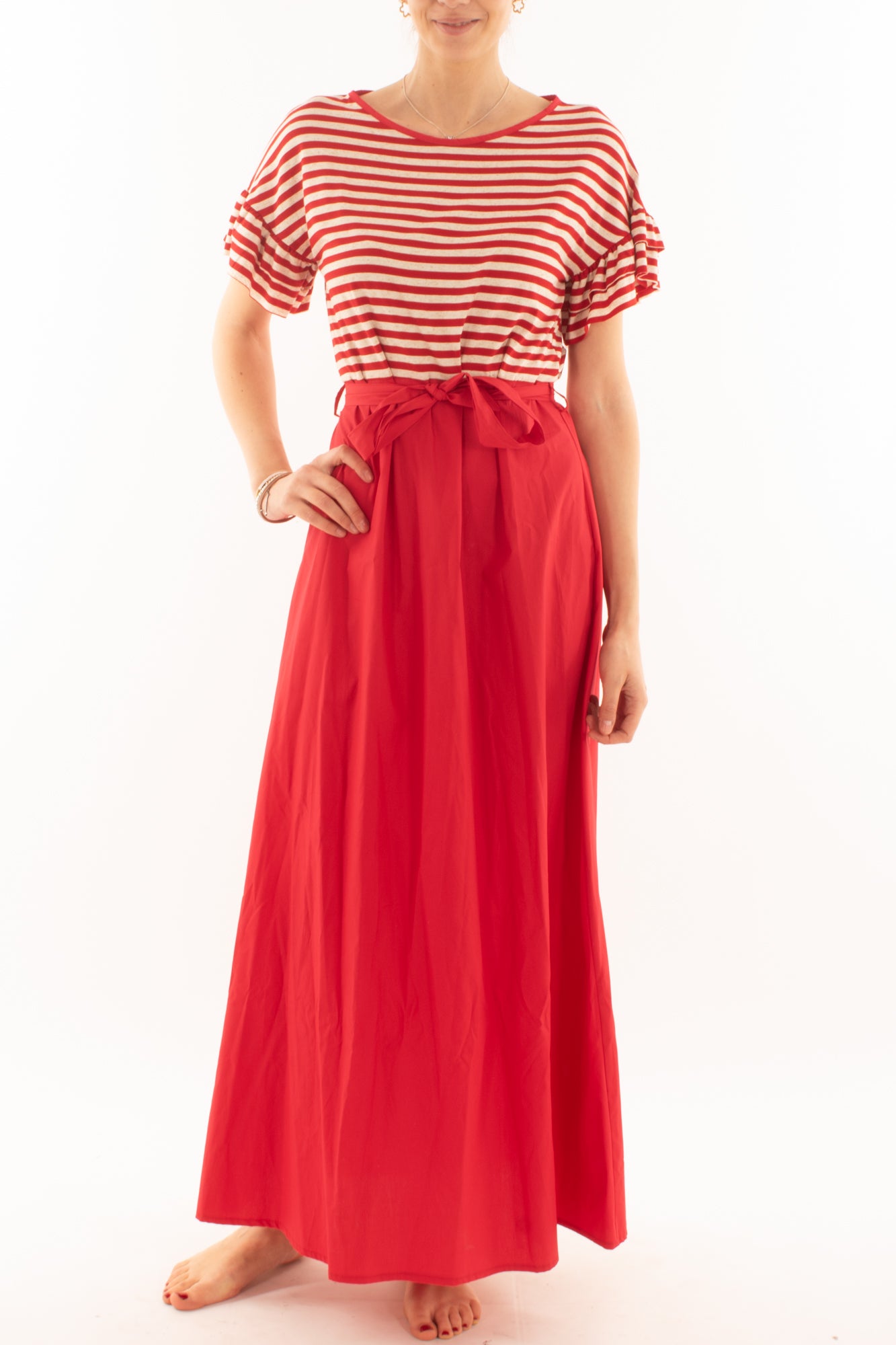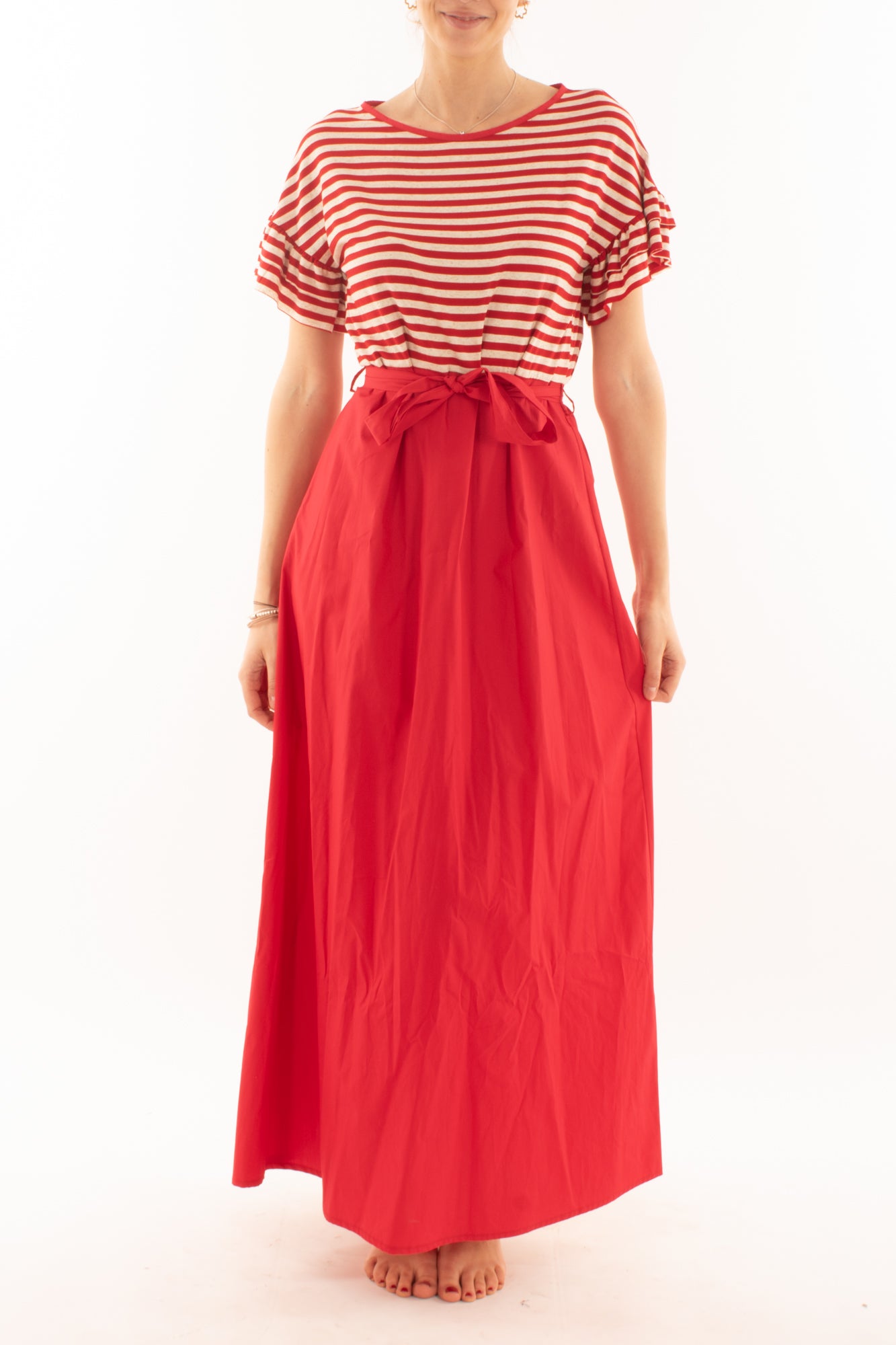 Scopri l'eleganza senza tempo con questo abito dalle righe sottili sulla parte superiore e una gonna liscia. Perfetto per un look raffinato e sofisticato, ideale per ogni occasione speciale.