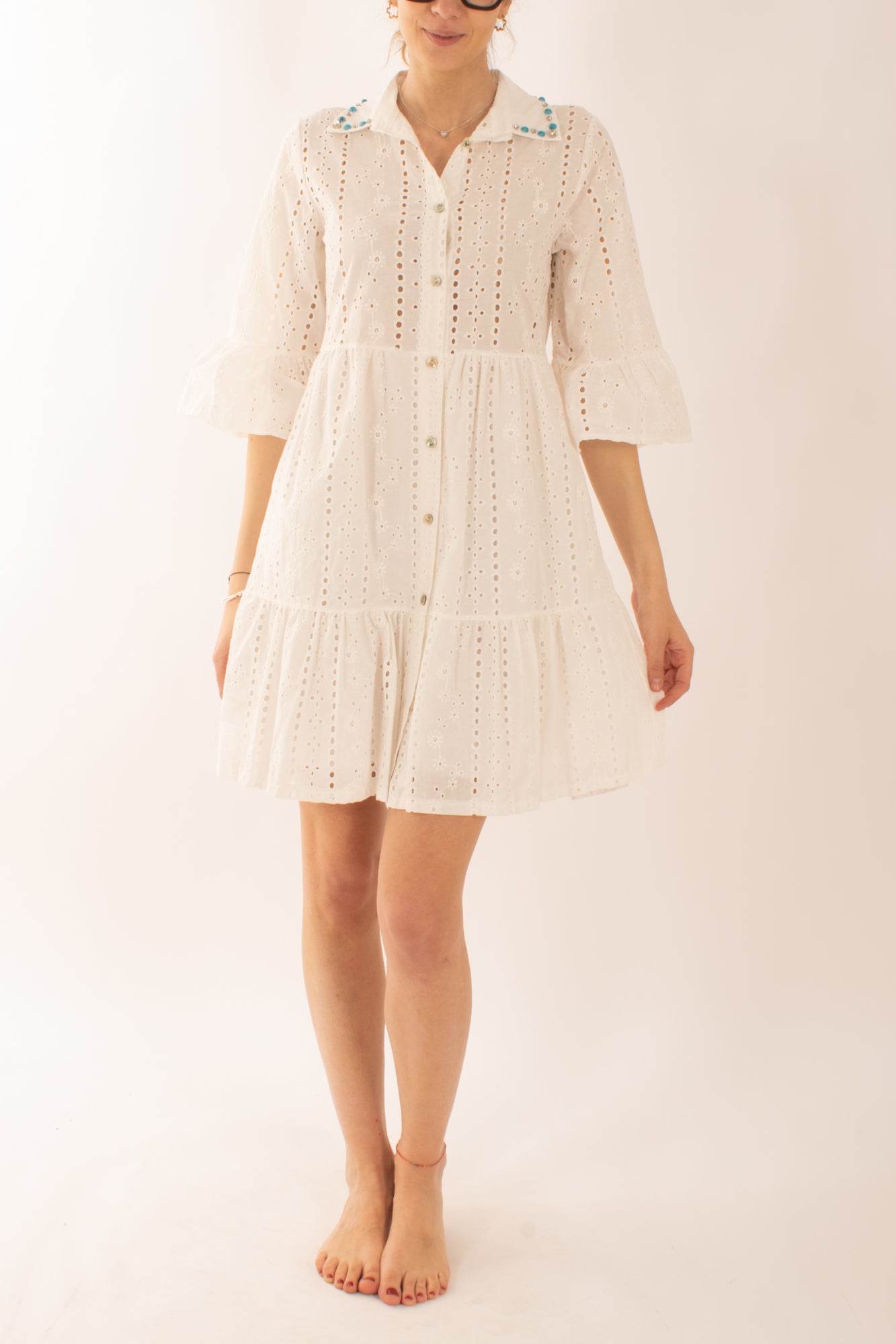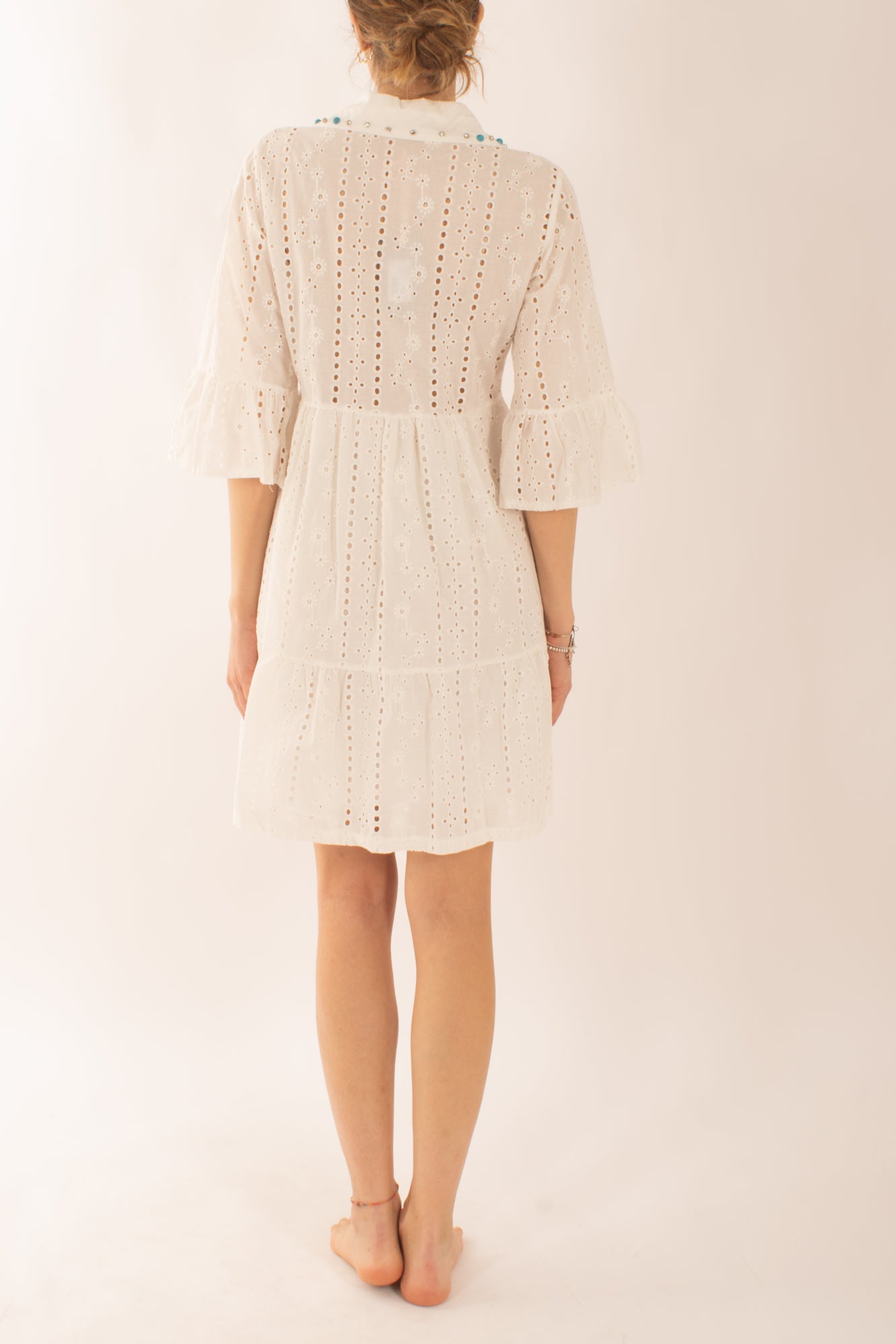 Abito elegante in pizzo San Gallo con manica 3/4 a sbuffo e bottoni frontali. Design raffinato, perfetto per ogni occasione. Realizzato in tessuto di alta qualità, offre comfort e stile. Ideale per un look romantico e sofisticato.