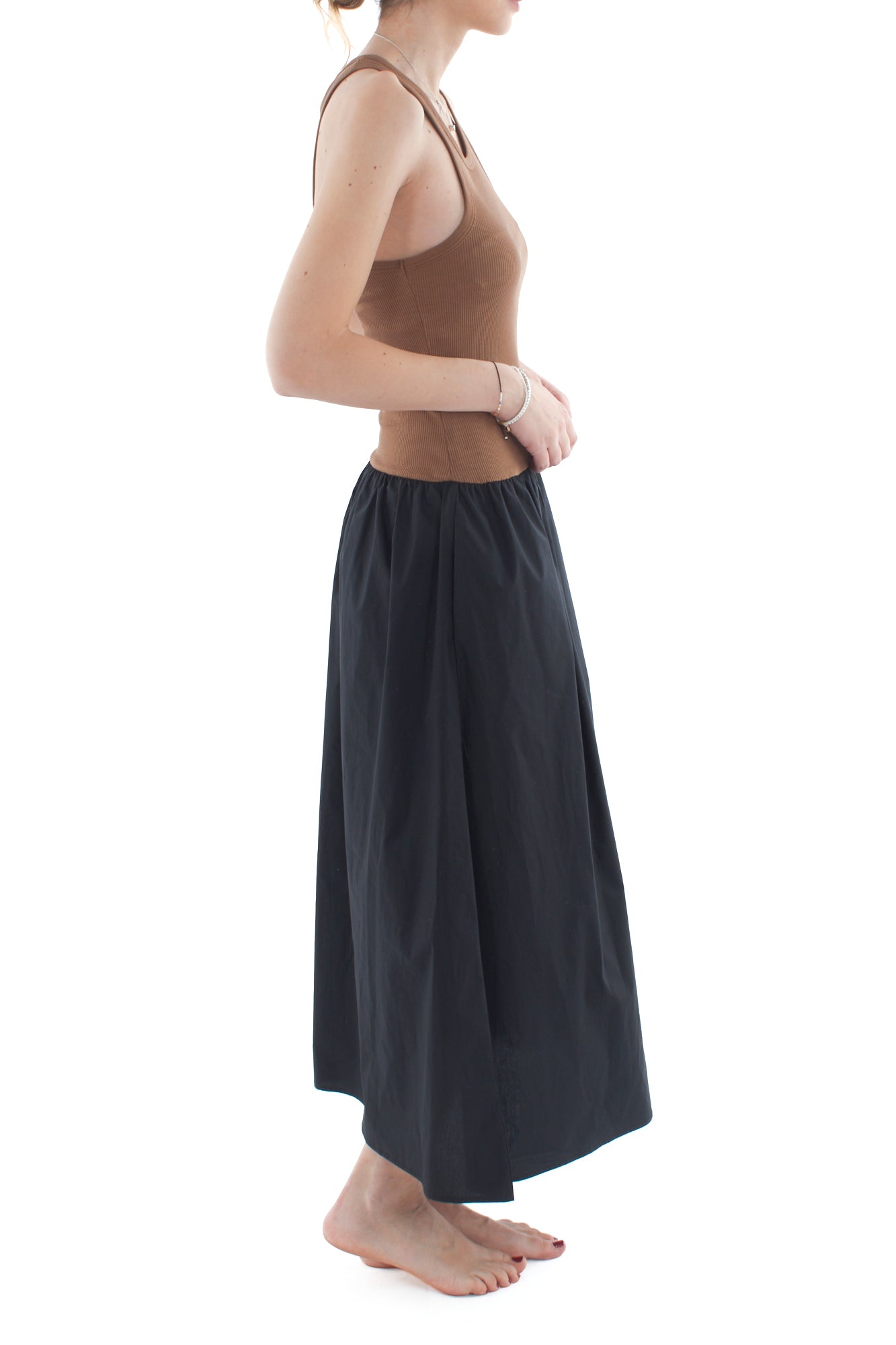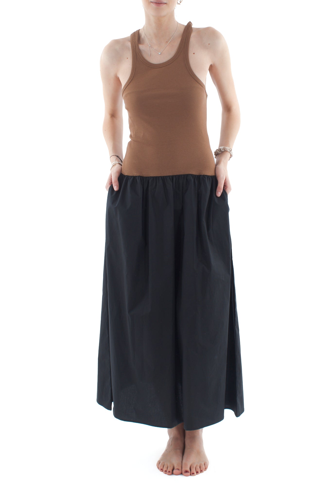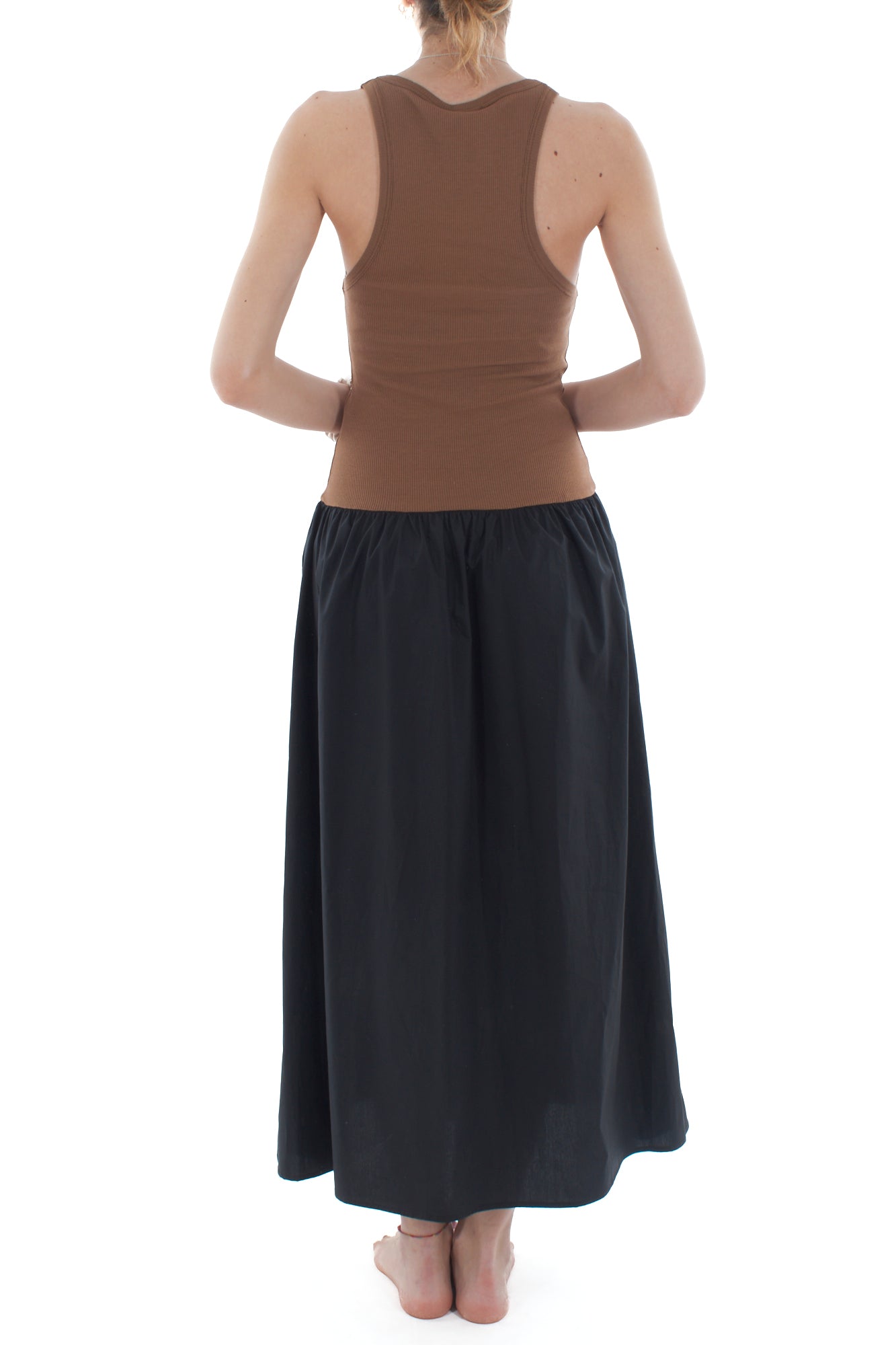 Elegante abito smanicato con corpetto in cotone a costine e ampia gonna in cotone. Ideale per una giornata estiva o una serata casual, questo vestito offre comfort e stile. Il design classico e i materiali di alta qualità garantiscono una vestibilità perfetta e un look raffinato.