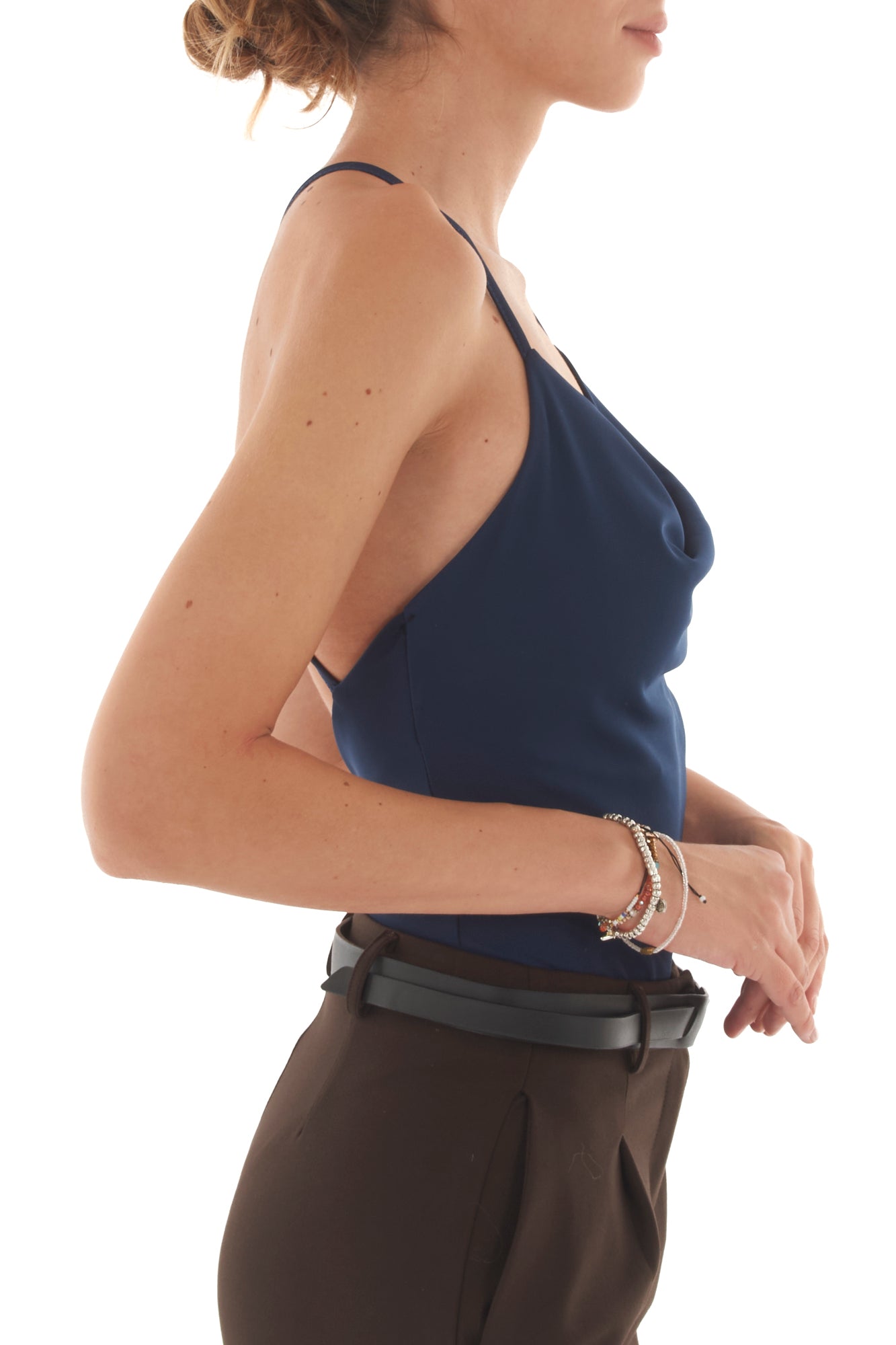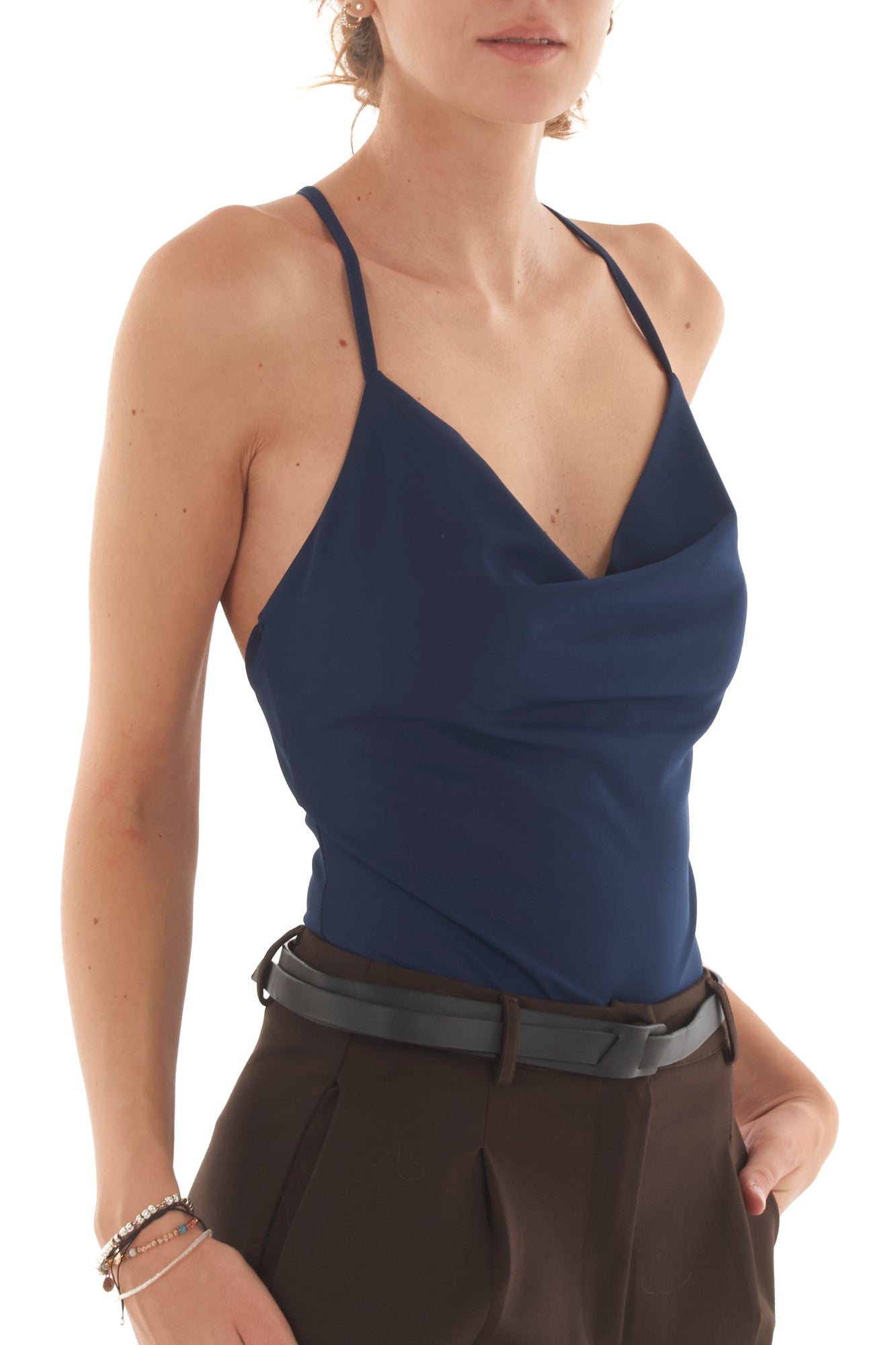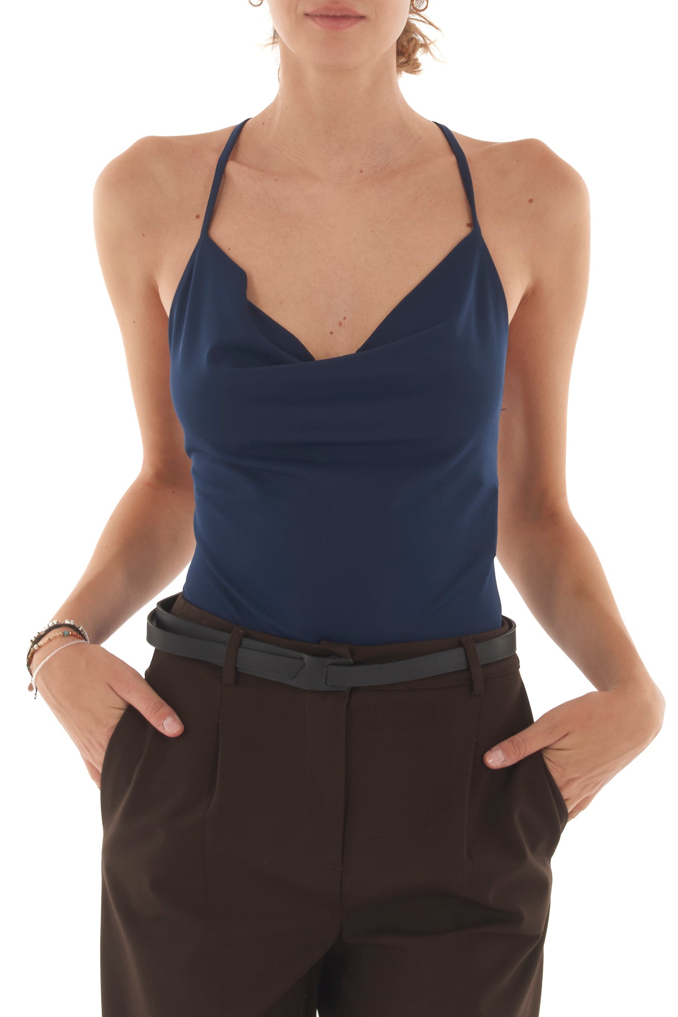Body elegante con collo a gronda e schiena incrociata, perfetto per un look sofisticato. Realizzato in tessuto morbido ed elasticizzato, garantisce una vestibilità comoda e avvolgente. Il design incrociato sulla schiena dona un tocco di originalità, ideale per ogni occasione.