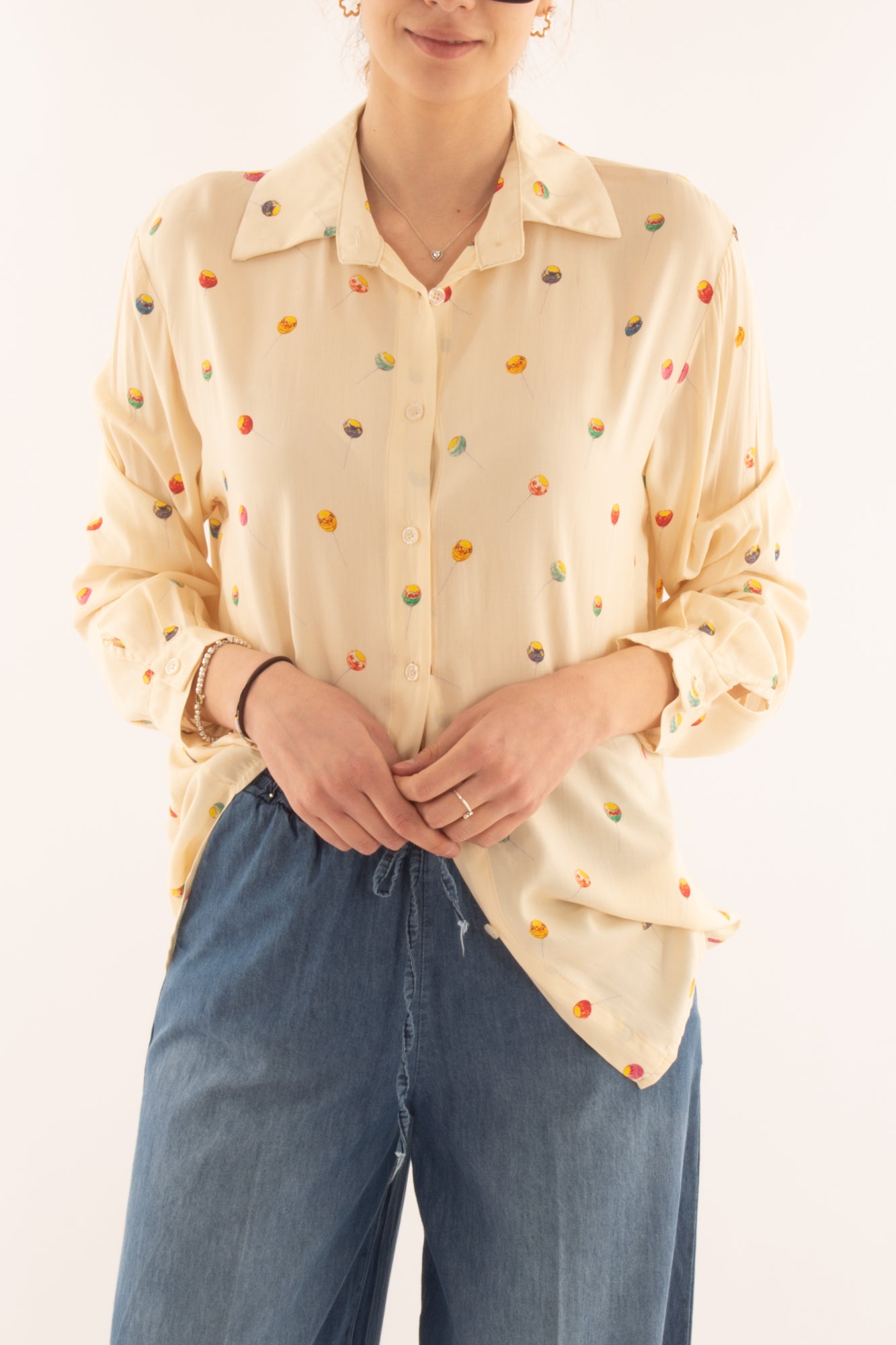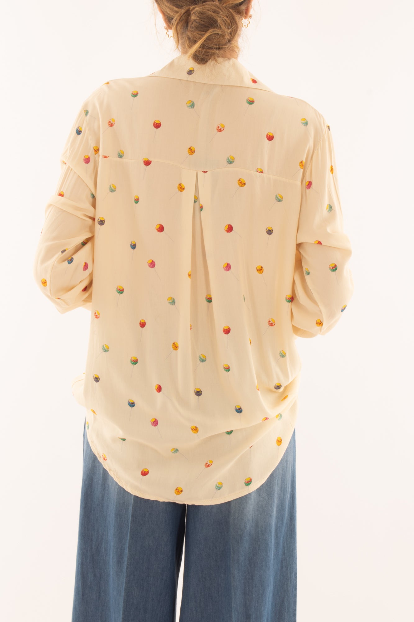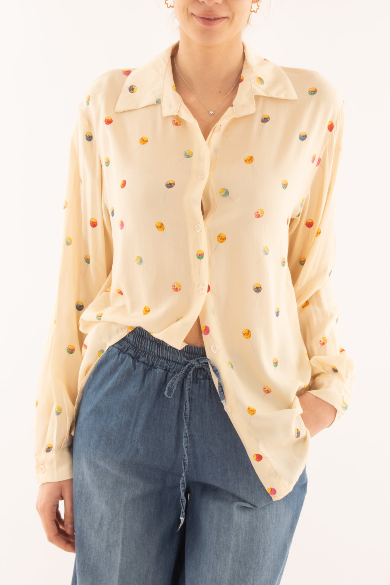 "Esplora la nostra camicia in viscosa con stampa 'lecca lecca' a manica lunga. Perfetta per un look vivace e giocoso, questa camicia aggiunge un tocco di dolcezza e originalità al tuo stile
