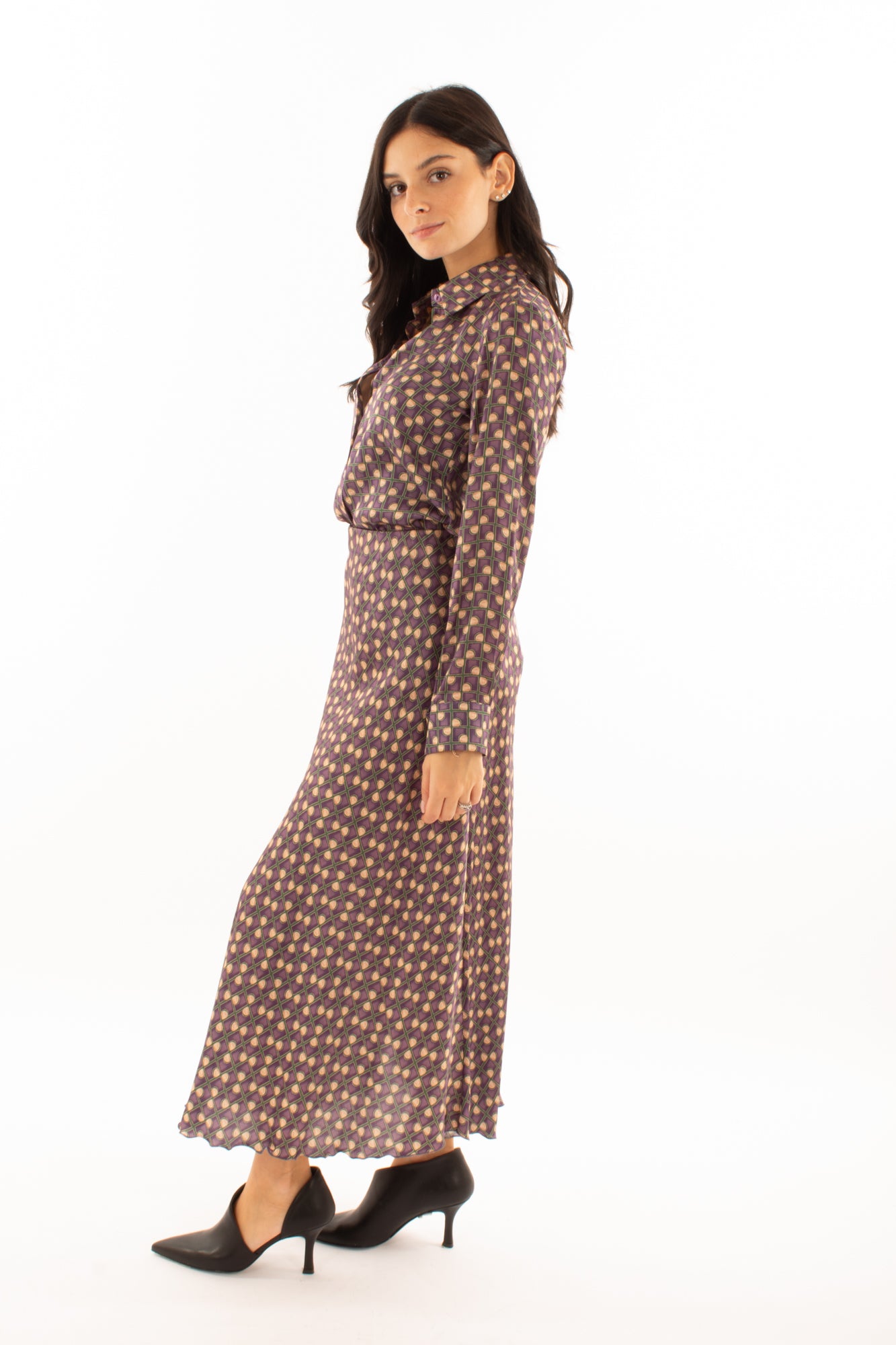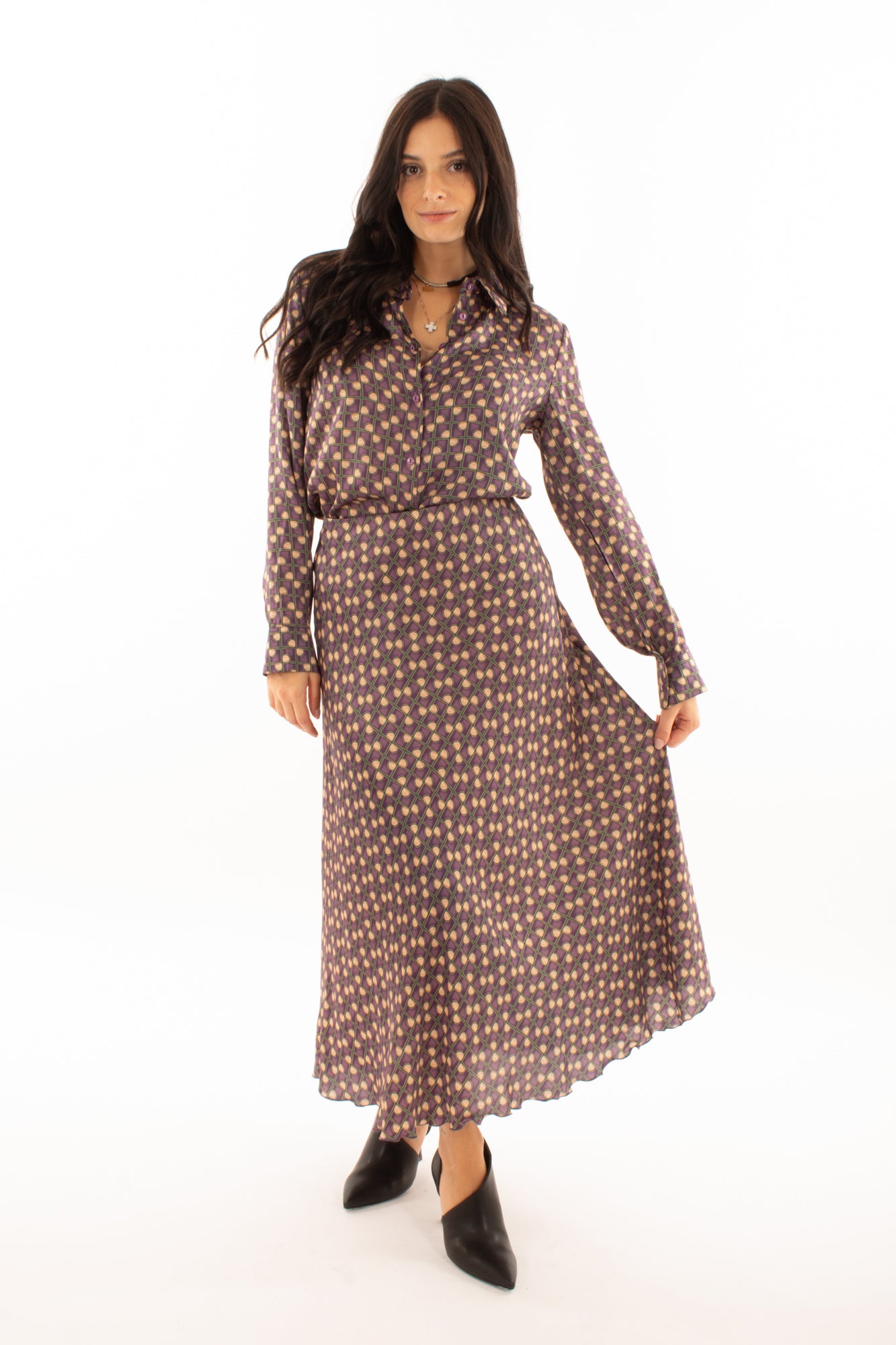 La Camicia a Fantasia in Viscosa Miamata - Viola è il capo di abbigliamento ideale per chi cerca un'eleganza senza tempo. Realizzata in satin di viscosa di alta qualità, questa camicia si distingue per le finiture di lusso che la rendono unica.