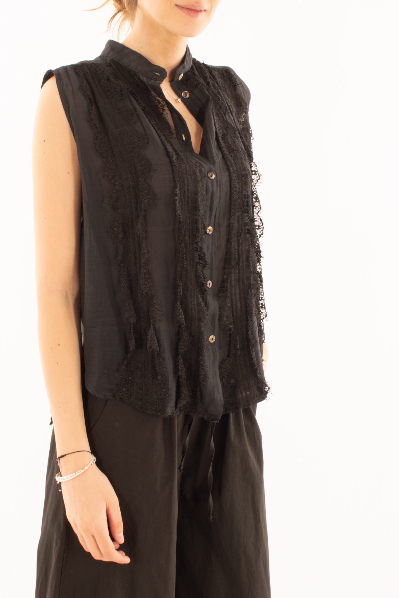 Camicia smanicata misto seta con intarsi in pizzo: elegante e raffinata, perfetta per un look chic. Il tessuto di alta qualità offre comfort e stile, mentre i dettagli in pizzo aggiungono un tocco di femminilità. Ideale per ogni occasione, dalla cena formale agli incontri casual.