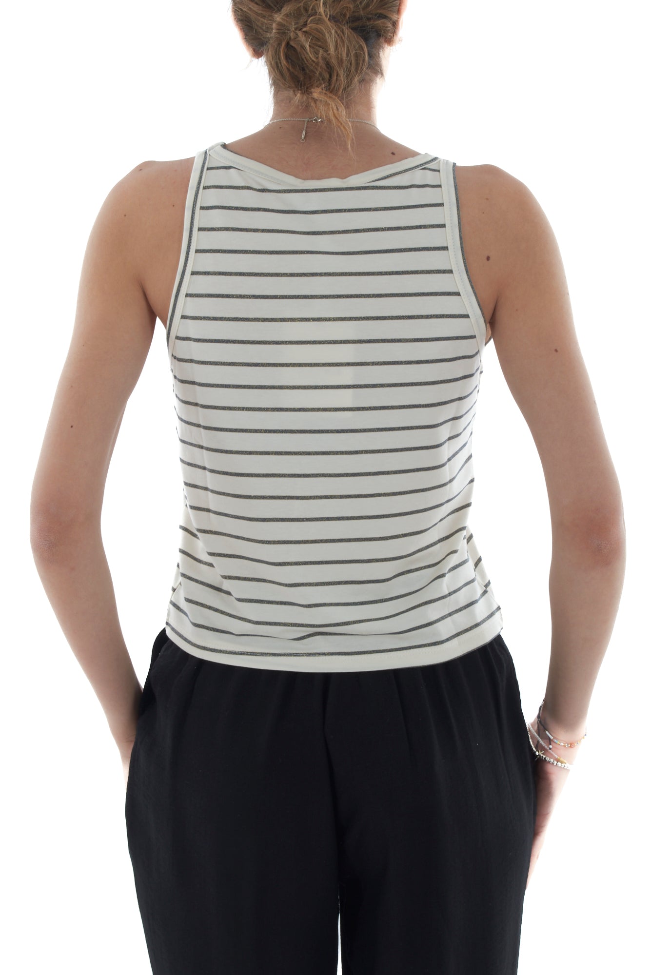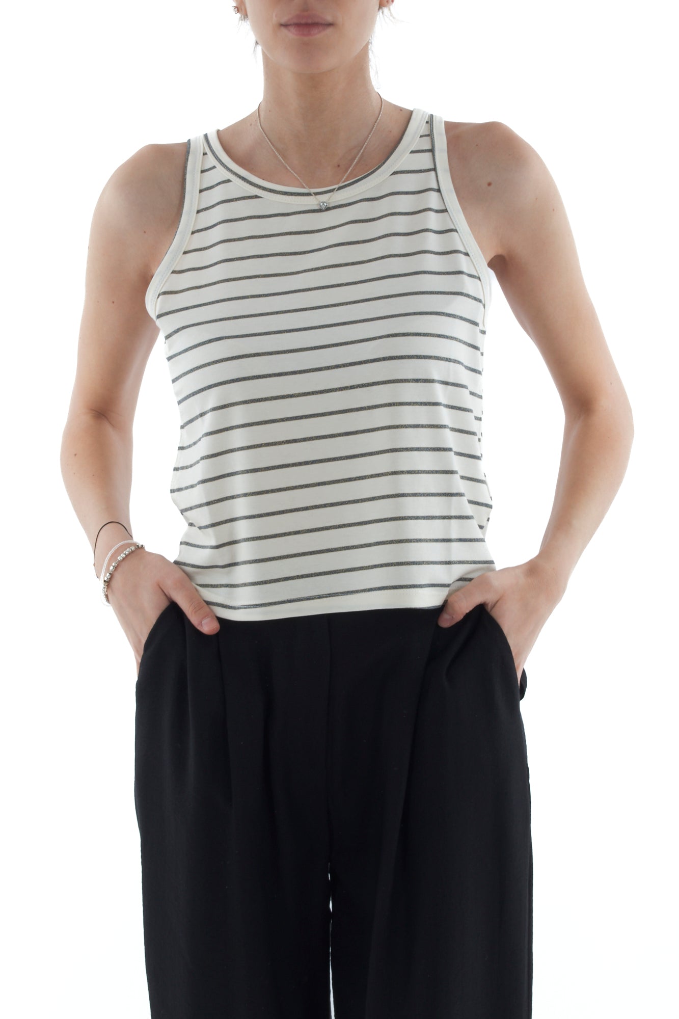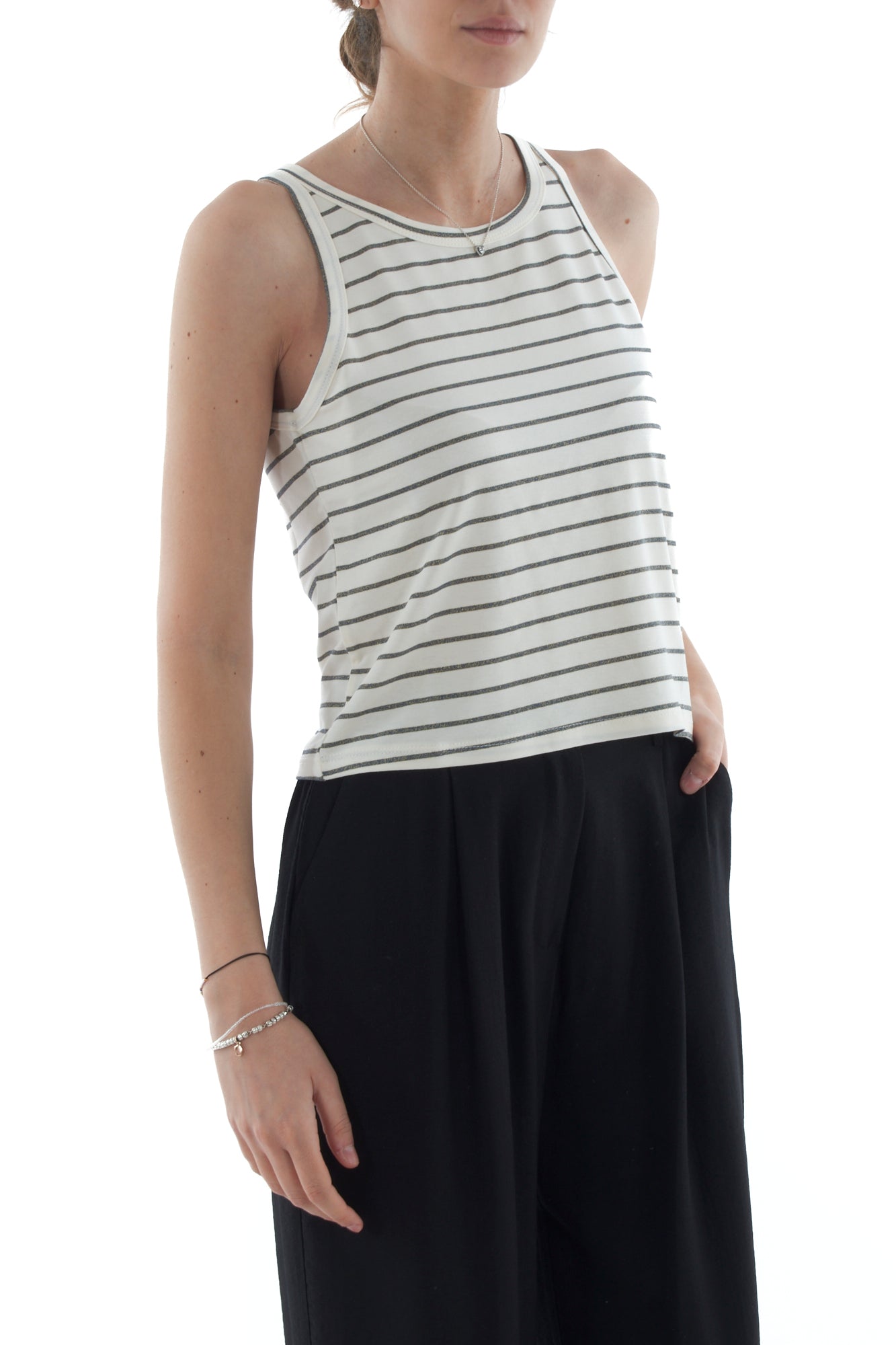 Elegante canottiera con riga in lurex, perfetta per aggiungere un tocco scintillante al tuo outfit. Realizzata con tessuti di alta qualità, offre comfort e stile in ogni occasione. Ideale per creare look casual chic o raffinati. Scopri come valorizzare il tuo guardaroba con questo capo trendy.