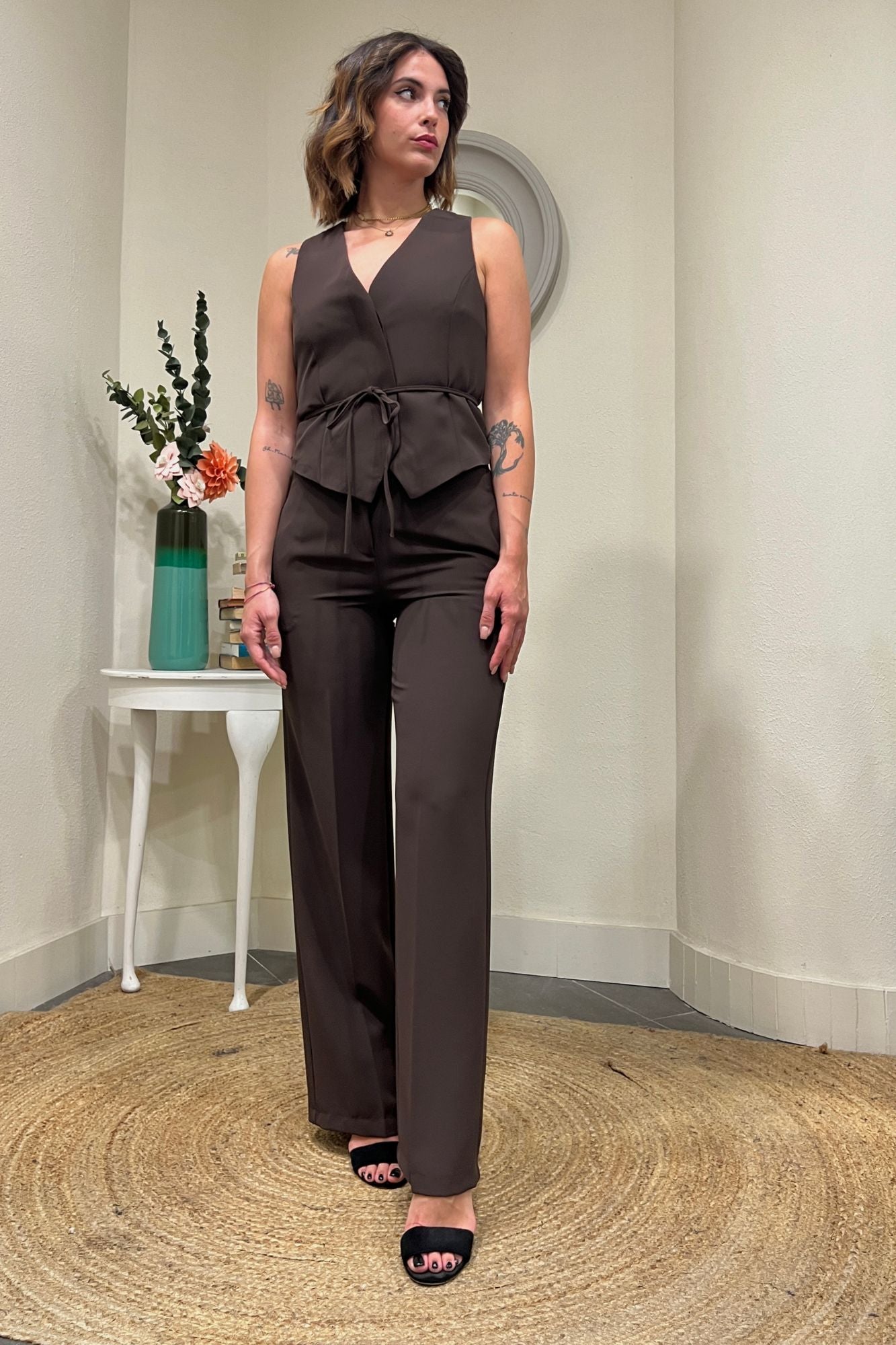 Il nostro completo gilet e pantalone a palazzo è l'essenza dell'eleganza. Il gilet ha un dettaglio laccetto che esalta la silhouette, mentre il pantalone a palazzo offre una vestibilità fluida e raffinata. Un look sofisticato e moderno per ogni occasione.