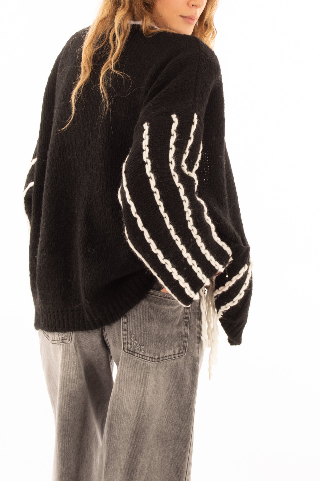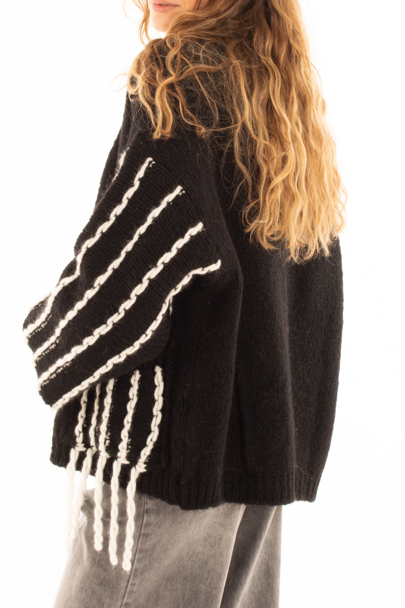 "Acquista il nostro cardigan esclusivo con fili di lana che pendono. Questo elegante capo d'abbigliamento offre comfort e stile ineguagliabili, perfetto per le giornate più fresche. Scopri il calore avvolgente dei fili di lana mentre aggiungi un tocco di sofisticatezza al tuo look. Un must-have per ogni guardaroba invernale."