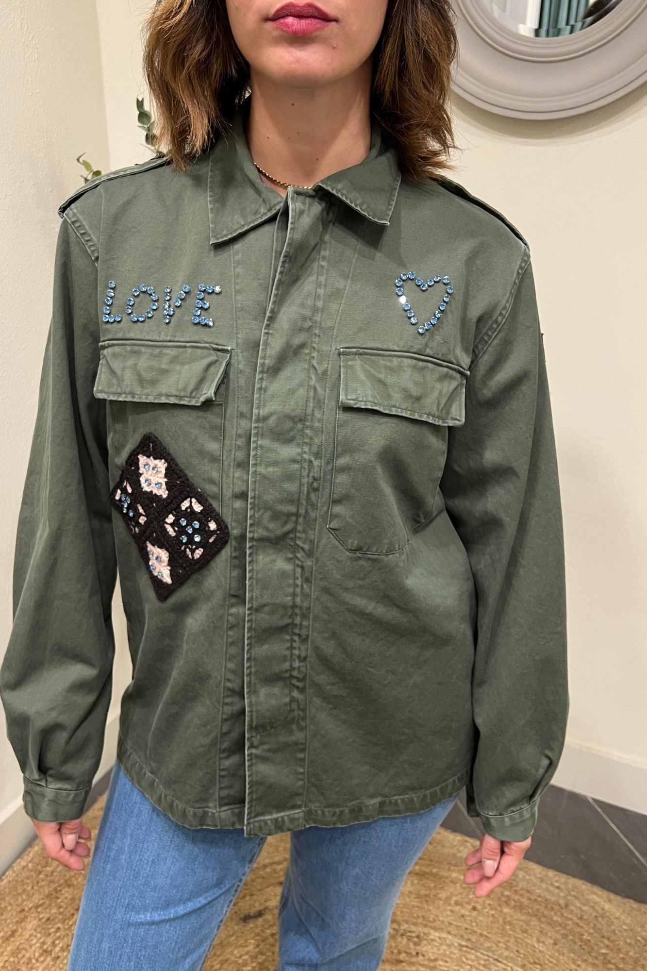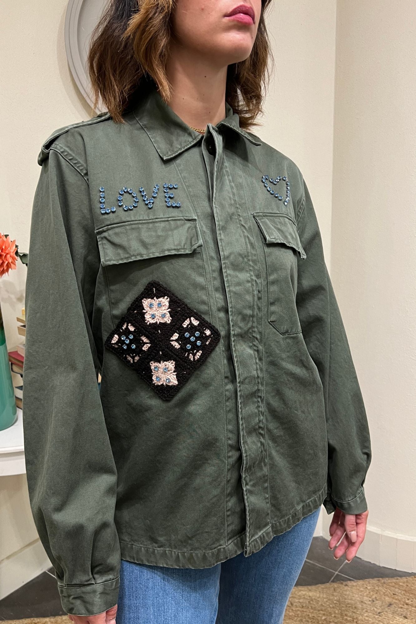 Giacca camouflage dal tocco unico. Le applicazioni la rendono un capo distintivo per il tuo stile. Unisce l'energia del militare all'originalità dei dettagli. Scopri l'outfit perfetto sul nostro sito.