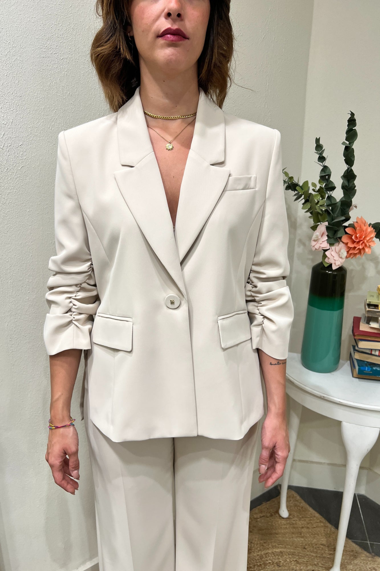 giacca con manica arricciata e spacco laterale. Il retro più lungo dona un tocco di stile unico. Perfetta per ogni outfit, dall'ufficio all'aperitivo. Un capo versatile per un look moderno e ricercato. #GiaccaDonna #SpaccoLaterale #ModaElegante #StileUnico #AbbigliamentoFemminile