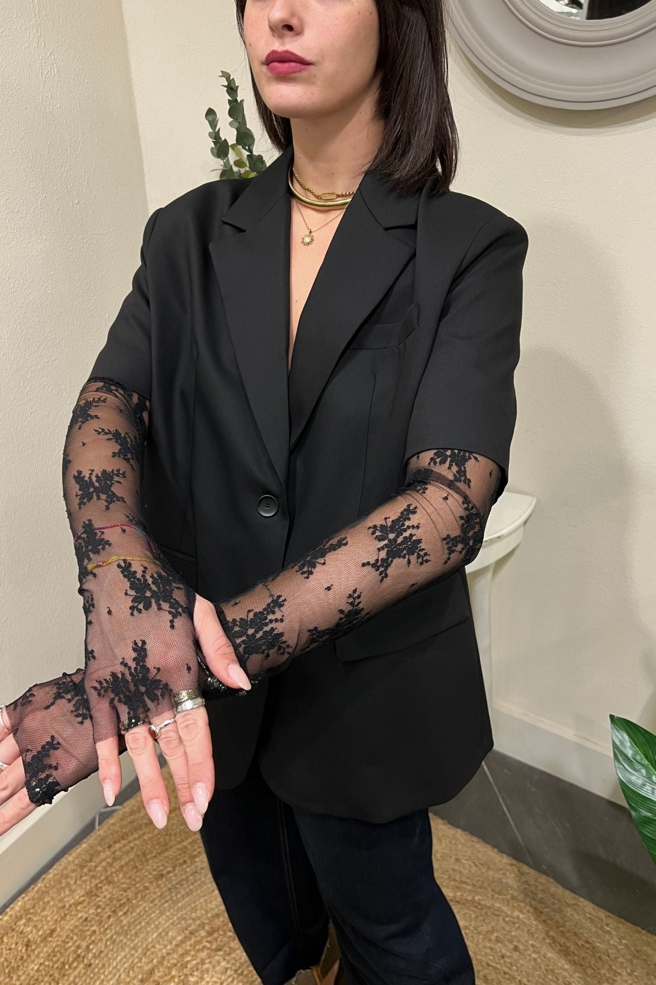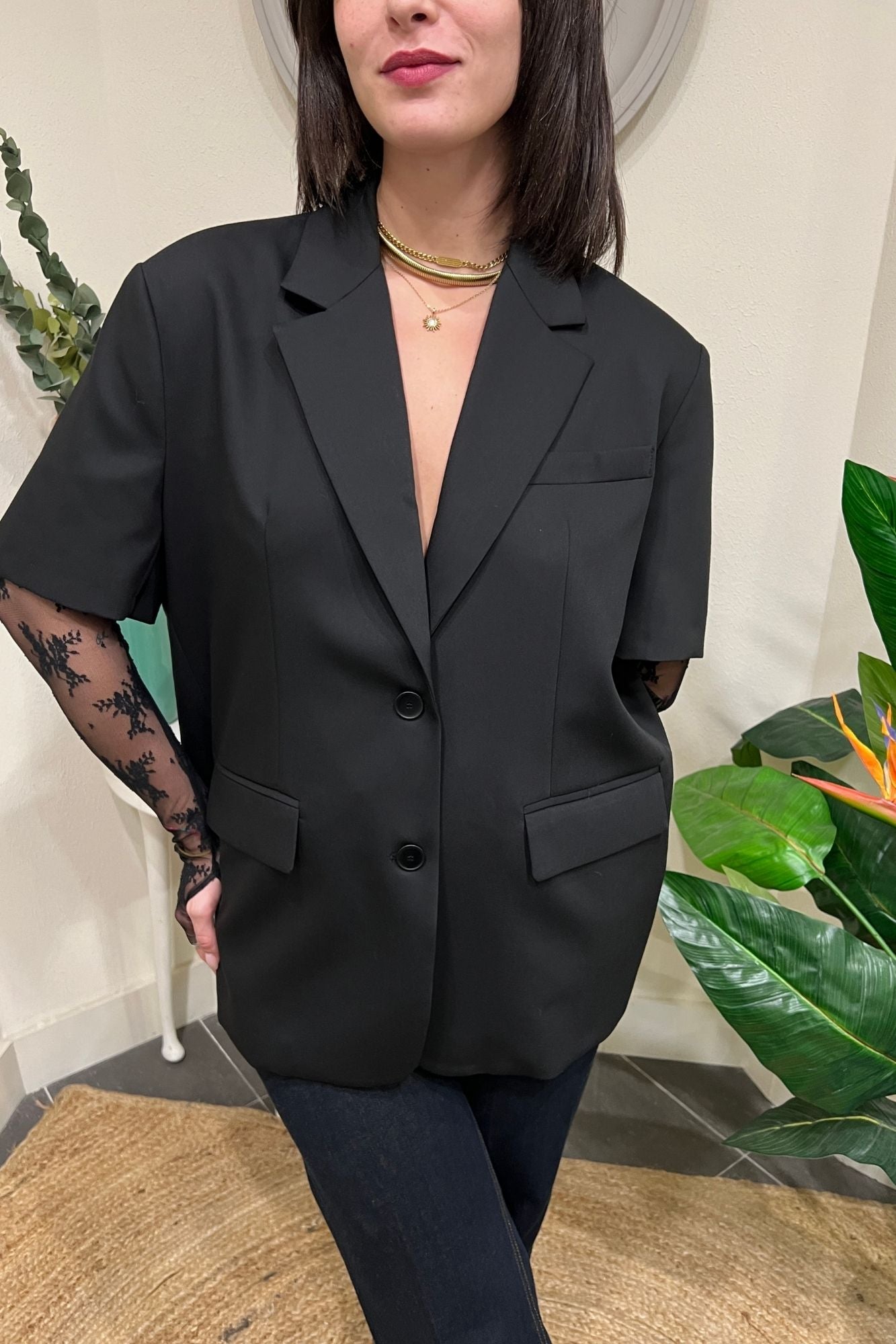 Giacca a manica corta: un capo versatile con un tocco di eleganza. I delicati manicotti in pizzo creano un contrasto unico che esalta il tuo look. Perfetta per ogni occasione.